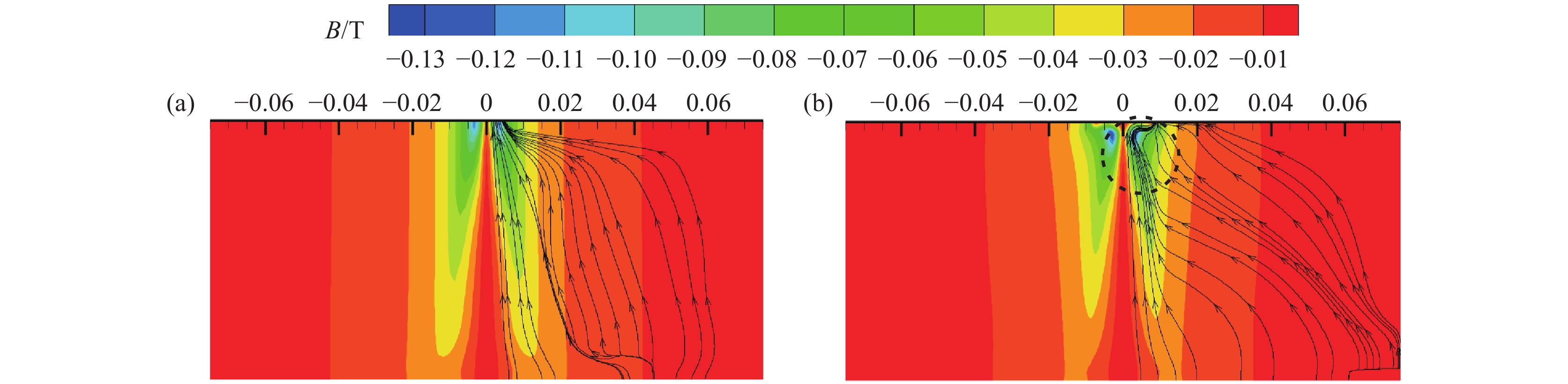 鈦渣電弧爐內(nèi)電弧特性對(duì)爐料融化以及還原過(guò)程具有重要影響。采用流體力學(xué)耦合電磁場(chǎng)的方法,建立了鈦渣電弧爐內(nèi)電弧區(qū)域的數(shù)學(xué)模型,對(duì)電弧區(qū)內(nèi)的多物理場(chǎng)進(jìn)行了模擬,研究了中空電極對(duì)電弧區(qū)域內(nèi)的流場(chǎng)、溫度場(chǎng)及電磁場(chǎng)的影響,并對(duì)比分析了實(shí)心電極與中空電極的差異。結(jié)果表明,與實(shí)心電極相比,中空電極的溫度場(chǎng)仍呈“鐘罩型”分布,但由于洛倫茲力和壓力導(dǎo)致中空區(qū)域附近出現(xiàn)較大的負(fù)速度,阻礙了中空電極處的進(jìn)料。進(jìn)一步研究發(fā)現(xiàn),中空電極內(nèi)徑的大小會(huì)影響電弧區(qū)域電流密度分布,繼而決定了洛倫茲力和壓力的分布特征,揭示了中空電極對(duì)電弧特性的影響機(jī)制。