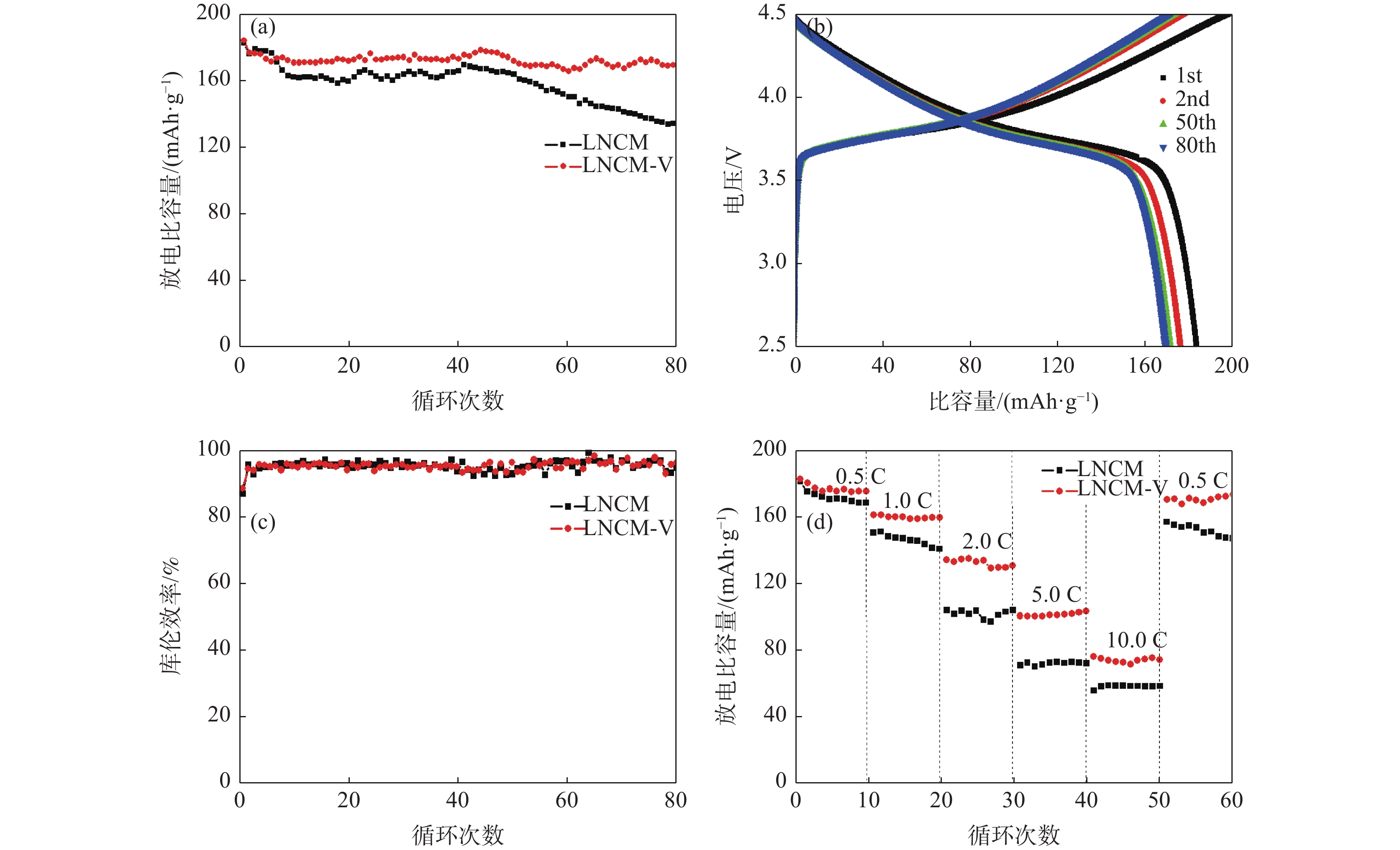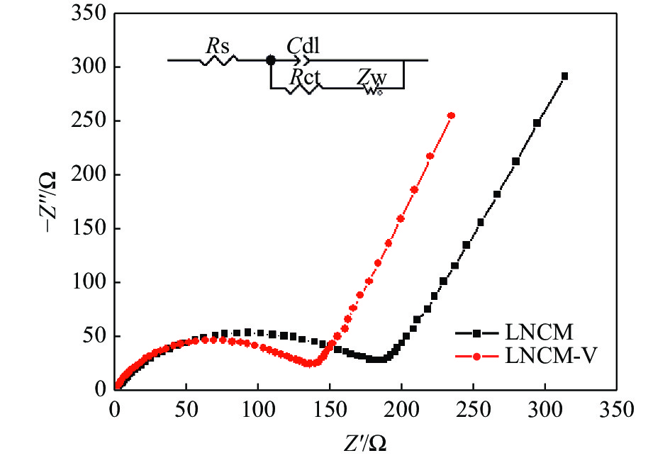 LiNi1/3Co1/3Mn1/3O2 (LNCM) cathode material with high specific capacity has received extensive attention in power batteries. However, the serious safety issues and poor cycle performance limit its application prospect. Doping is one of the effective methods to boost the electrochemical performance of electrode materials. Vanadium-doped LiNi1/3-xCo1/3Mn1/3VxO2 cathode material was successfully prepared by the sol-gel method using NH4VO3 as vanadium source. The research results show that by replacing some Ni2+ ions in the LiNi1/3Co1/3Mn1/3O2 cathode material by V5+, the cation mixing is effectively reduced, the crystal structure of the cathode material is stabilized, and the diffusion coefficient of Li+ in the lattice increases. And the LiNi1/3-0.02Co1/3Mn1/3V0.02O2 (LNCM-V) electrode material exhibits excellent lithium storage performance (the discharge capacity is 169 mAh/g at 0.5 C after 80 cycles).