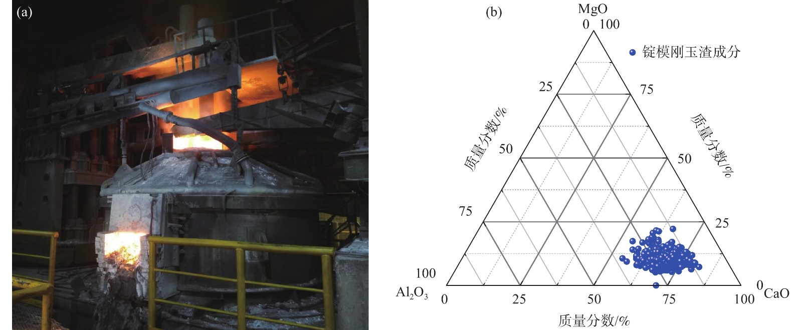 In the continuous casting process of high-titanium steel, the traditional CaO-SiO2-Al2O3 mold slag will produce a violent steel/slag interface reaction, which will affect the continuous casting process stability. In order to weaken the interface reaction of steel/slag, a low reactivity mold flux for casting high titanium steel had been designed and the feasibility of CaO-Al2O3 based mold flux had been determined through the thermodynamic calculation of the steel slag interface by using Factsage thermodynamic software to calculate the composition range of the low reactivity mold flux. The viscosity and melting point of the three groups of mold slag were measured by rotary viscosity tester and automatic slag melting point and melting rate tester, and the newly developed mold slag suitable for continuous casting production was tested by VSgr-60-2000 vacuum atmosphere pressure sintering furnace. The CaO/Al2O3 in newly developed mold flux at 1.1, with addition of 10%CaF2, 7%MgO, 5%Na2O, 3%K2O, 13%B2O3 and 5%SiO2, its viscosity measured by viscometer is 0.413 Pa·s, and the melting point is 1106 ℃. After the steel/slag interface reaction test, the Ti content in the steel decreases by 0.03%, and the TiO2 content in the mold slag increases by 0.002%, and the interface reaction is weak. The newly developed mold slag can extremely suppress the progress of the interfacial reaction of steel/slag.