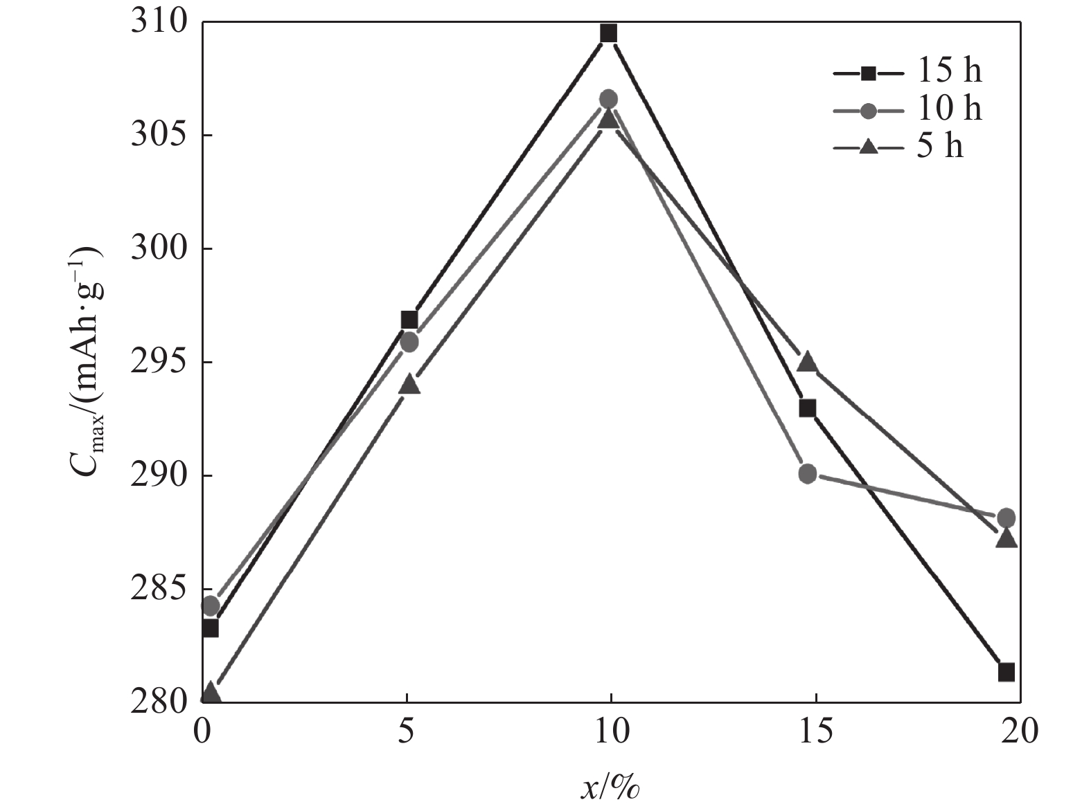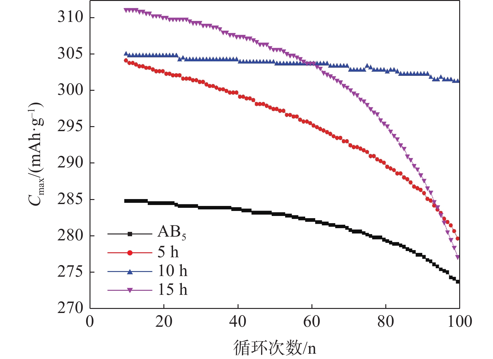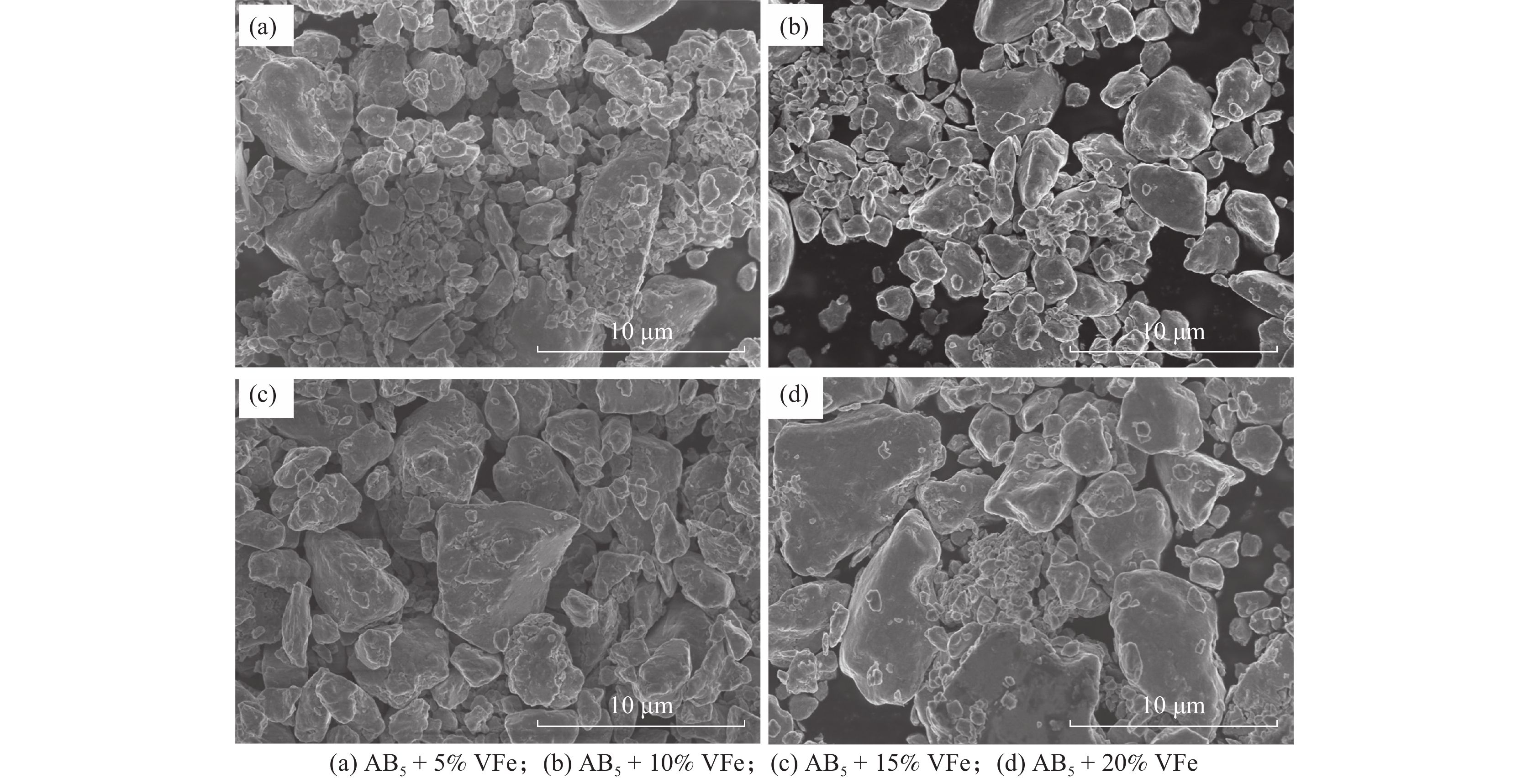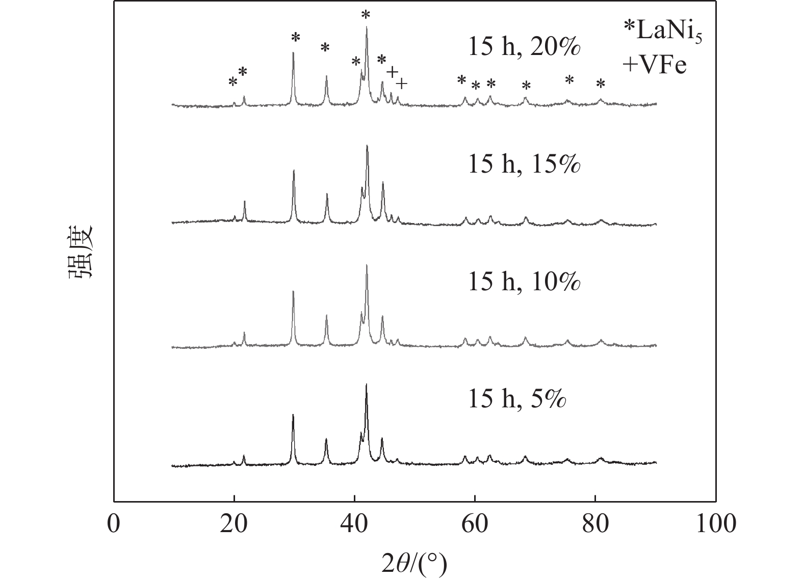 The MlNi3.55Co0.75Mn0.4Al0.3+x%VFe(x=5, 10, 15, 20) composite hydrogen storage alloys were synthesized by mechanical ball-milling. The microstructure and electrochemical properties of the composites were investigated. The microstructure analysis indicates that the parameters a and V of the main phase increase with the increase of milling time. The electrochemical analysis indicates that, with increasing VFe content x, the maximum capacity Cmax and the hydrogen diffusion coefficient D of the alloy first increase and then decrease, and reach the maximum of 310 mAh/g and 7.6×10?11 cm2/s with x=10. The cycle stability test was carried out on the alloy, and the results show that the discharge capacity retention rate of MlNi3.55Co0.75Mn0.4Al0.3+10%VFe ball-milled for 10 h was 98% after 100 cycles.