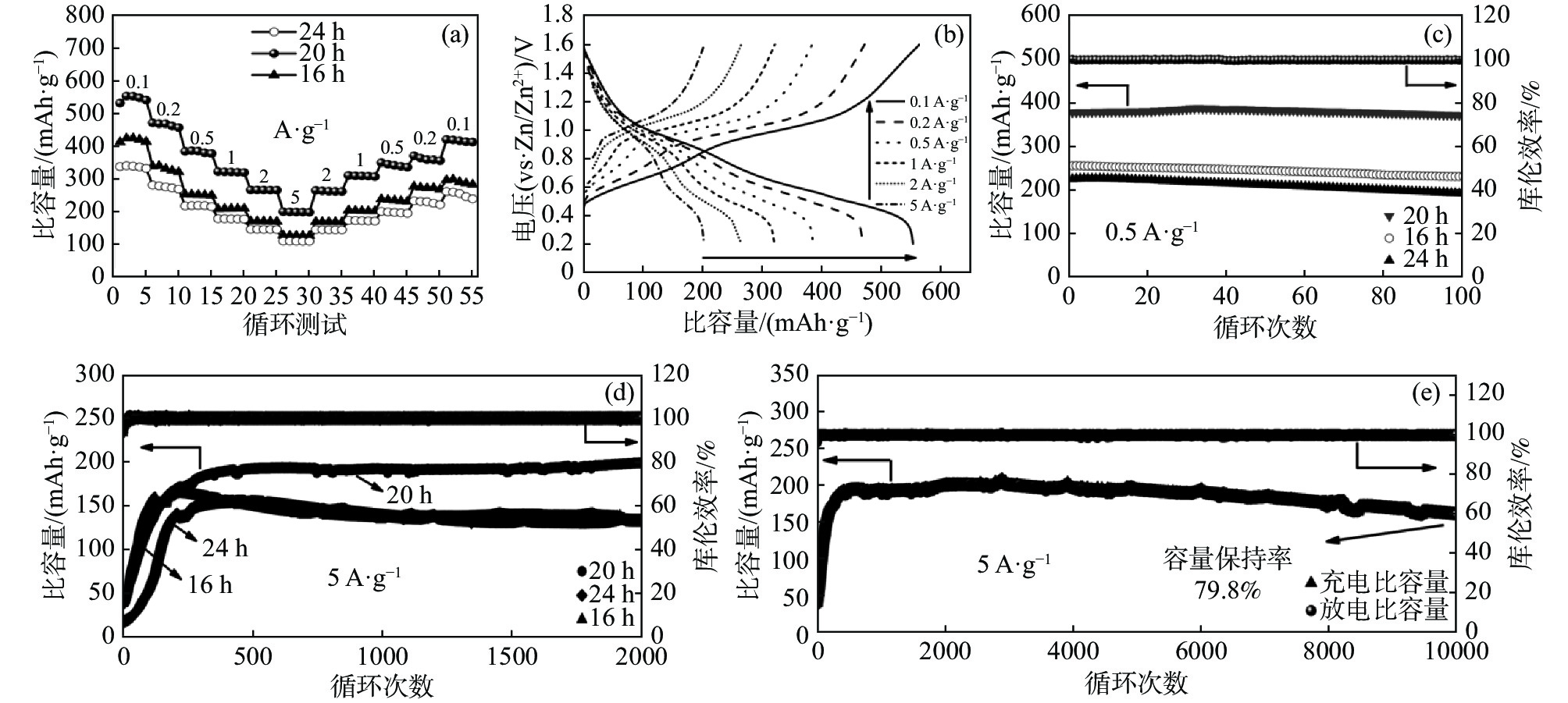 (NH4)2V4O9 as cathode material for aqueous zinc ion batteries was prepared by a facile one-step hydrothermal method using NH4VO3 and C2H2O4·2H2O as raw materials. X-ray diffractometer (XRD), scanning electron microscope (SEM), galvanostatic charge-discharge (GCD), galvanostatic intermittent titration technique (GITT), cyclic voltammetry (CV) and electrochemical impedance spectroscopy (EIS) were used to investigate the effects of hydrothermal reaction time (16, 20 h and 24 h) on the structure, morphology and electrochemical properties of (NH4)2V4O9. The results show that (NH4)2V4O9 synthesized by hydrothermal reaction for 20 h has the highest crystallinity, electrode reaction kinetics, and rate capability as well as cyclic stability, delivering high discharge specific capacities of 554.6, 472.2, 386.6, 322.6, 266.2 and 199.5 mAh/g at current densities of 0.1, 0.2, 0.5, 1, 2 and 5 A/g, respectively. It can also maintain a discharge capacity of 159.7 mAh/g after 10 000 long-term cycles at a high current density of 5 A/g, showing a capacity retention of up to 80.1%.