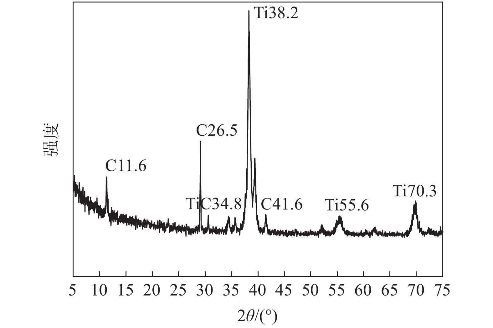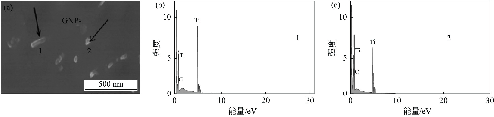 In this paper, titanium matrix-graphene composites were successfully in-situ synthesized using glucose as carbon source. Graphene-reinforced pure titanium matrix composites were prepared in situ by vacuum hot-pressing sintering method using glucose solution and pure titanium powder as raw materials. The interfacial structure of the composite prepared by in-situ synthesis is stable, the structure of graphene lamellae at the interface is clear, and the spacing of striations is about 0.32 nm, which is close to the theoretical spacing of graphite lamellae of 0.337 nm. It can be concluded that the component is multilayer graphene. At 1 300 ℃, compared with pure titanium sintered under the same condition, the yield strength and elongation of the in situ synthesized composites increase, it provides a good way to solve the contradiction of strength and plasticity of composite materials.