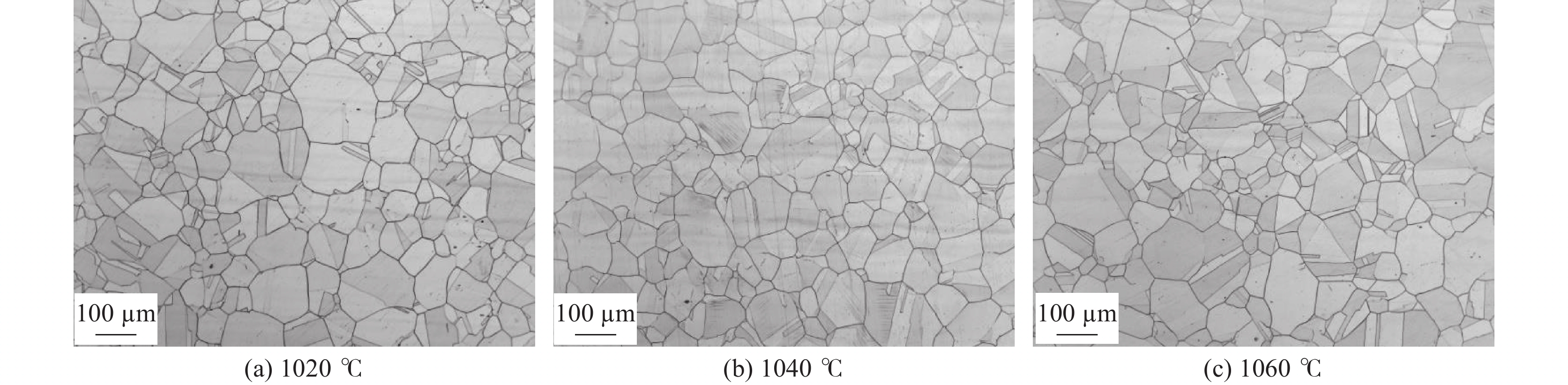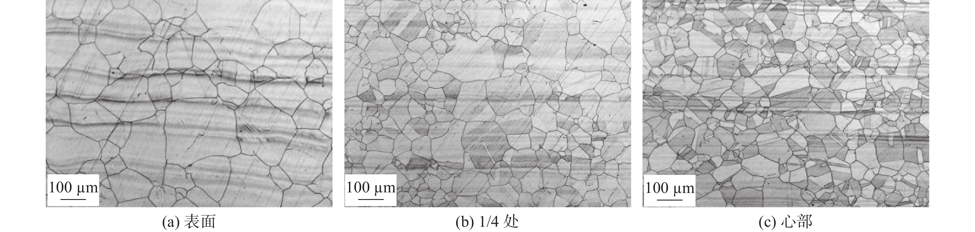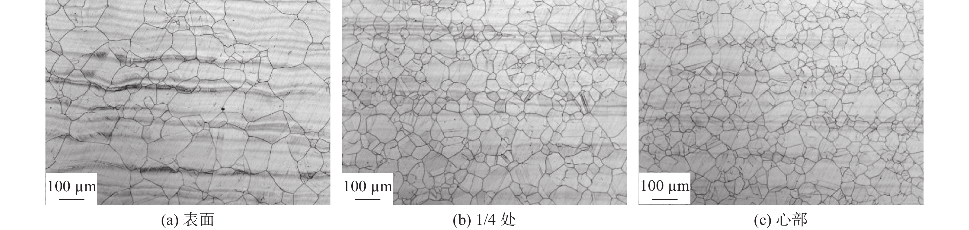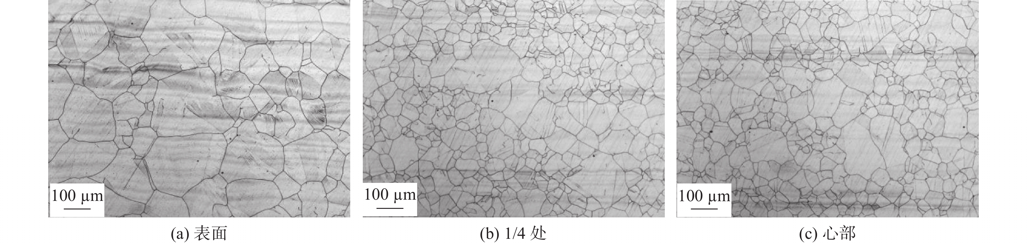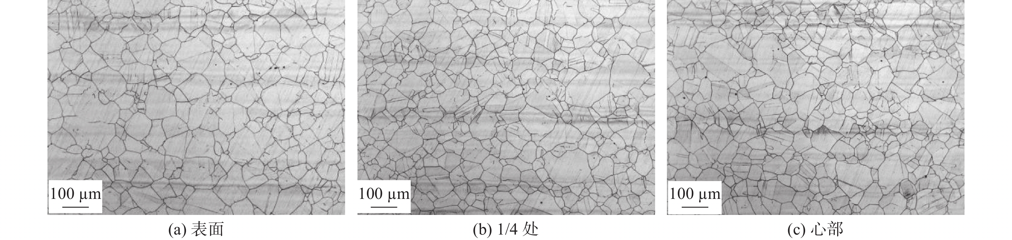 The grain morphologies in 316LN austenitic stainless steel were observed by Zaiss Imager metallographic microscope. The effects of deformation temperatures, deformation rates and solution temperatures on the grain size of 316LN steel were systematically studied. The experimental results show that the dynamic recrystallization (DRX) easily occurs with the increasing deformation temperatures and deformation rates, which is helpful for the grain refinement in 316LN steel. The orders of grain size at different position of forged sample from large to small after forging are the core, 1/4 diameter, and the surface. The grain size after deformation can reach about grade 6 when the deformation is 30% at 1 050 ℃. The solution treatment has a positive effect on the grain homogenization. According to the Jmat-Pro calculation and solution treatment results, too high temperature will cause the grains coarsening, while too low temperature can easily lead to precipitation of Cr2N, which affects the plasticity and corrosion resistance of the steels. The solution treatment temperature should be controlled at 1 020~1 040 ℃.