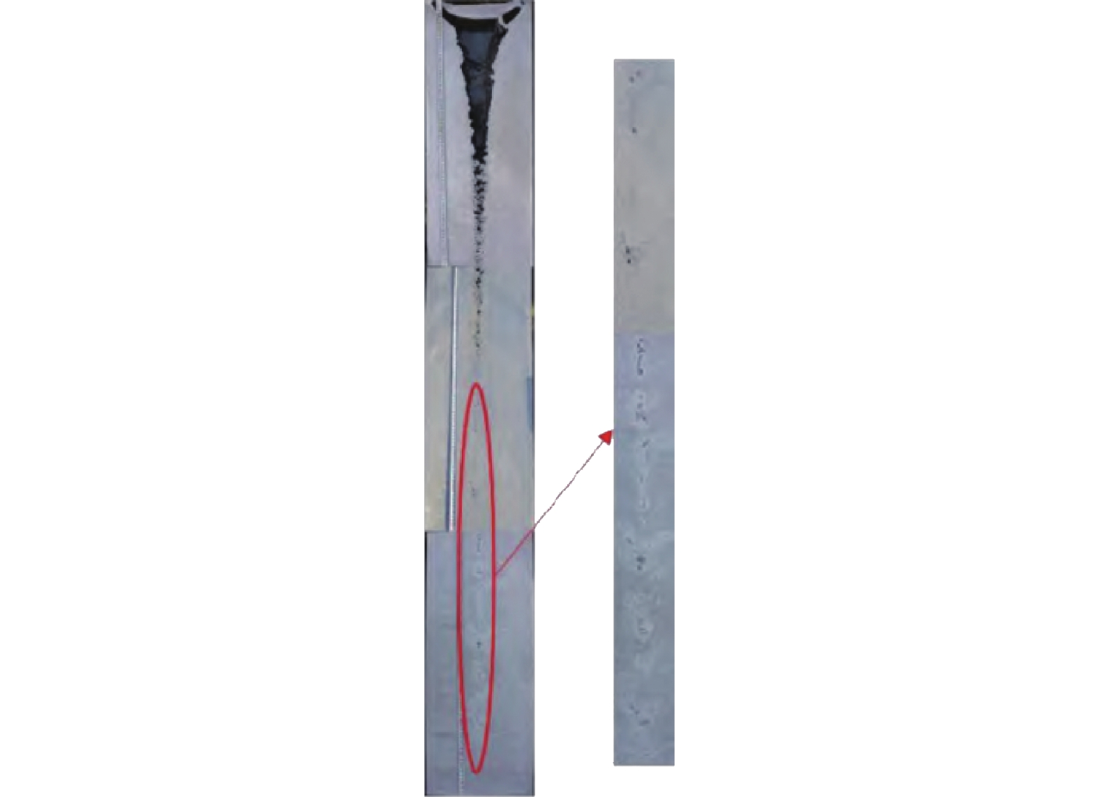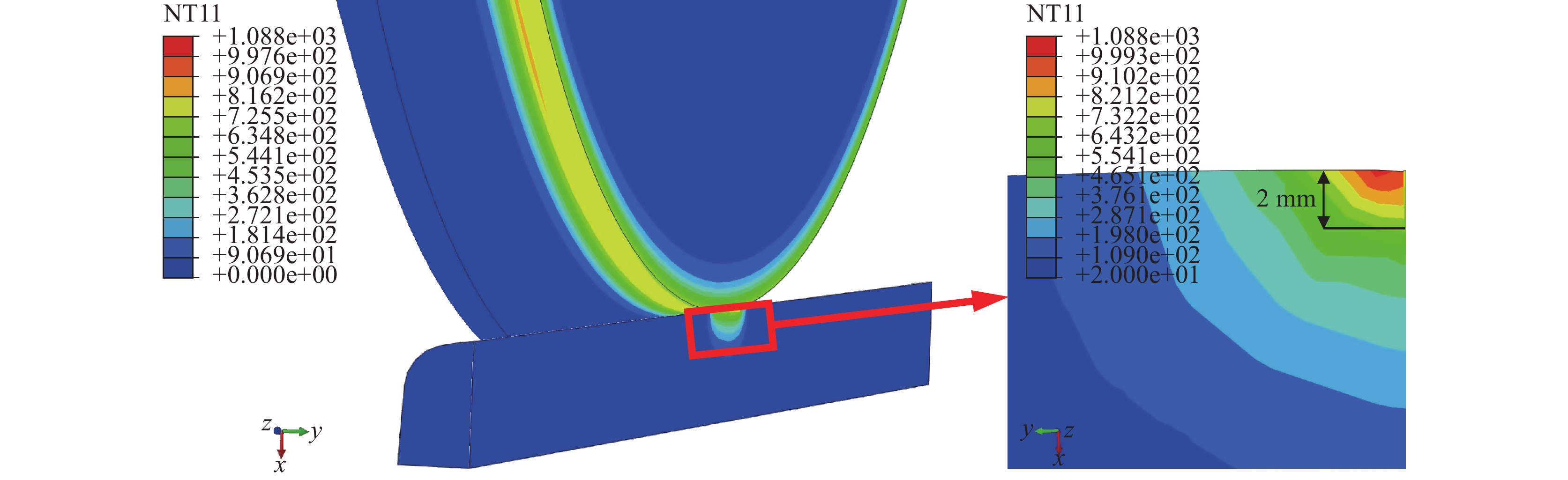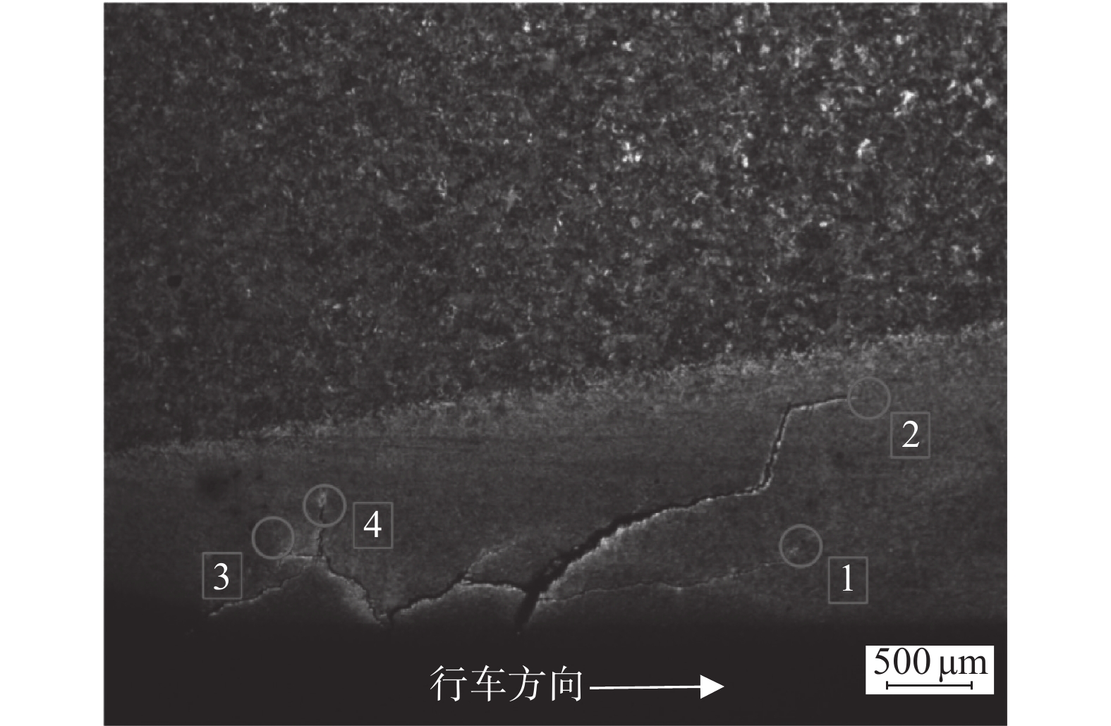 Rail damage restricts the stable contact between wheel and rail and affects the driving safety. Regarding the damage of a railway rail in on-line service, the multi-directional inspections had been carried out by using Axio observer 5m metallographic microscope, Empyrean X-ray diffractometer, sigma 500 scanning electron microscope and Falcon 500 microhardness tester. Based on the finite element simulation technology, the instantaneous temperature field distribution of the rail contact part under the abnormal starting condition of the wheel was reproduced. The analysis results show that the rail damage is a typical scratch with a damage depth of more than 2 mm. With the increase of tread depth, the volume fraction of martensite gradually decreases and the volume fraction of retained austenite gradually increases, so that the corresponding microhardness value gradually decreases. The retained austenite is surrounded by martensite structure, which increases the resistance to the continuous propagation of microcracks and passivates the crack tip. Under the joint action of wheel rail surface shear stress, it provides a channel for microcrack propagation, induces microcrack transverse propagation, and finally leads to peeling failure in rail scratch area. The computer simulation results are agreement with the actual damage characteristics.