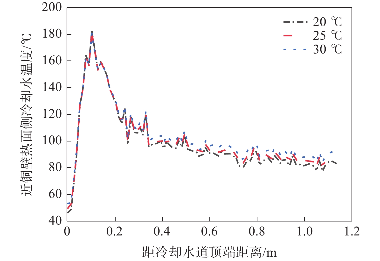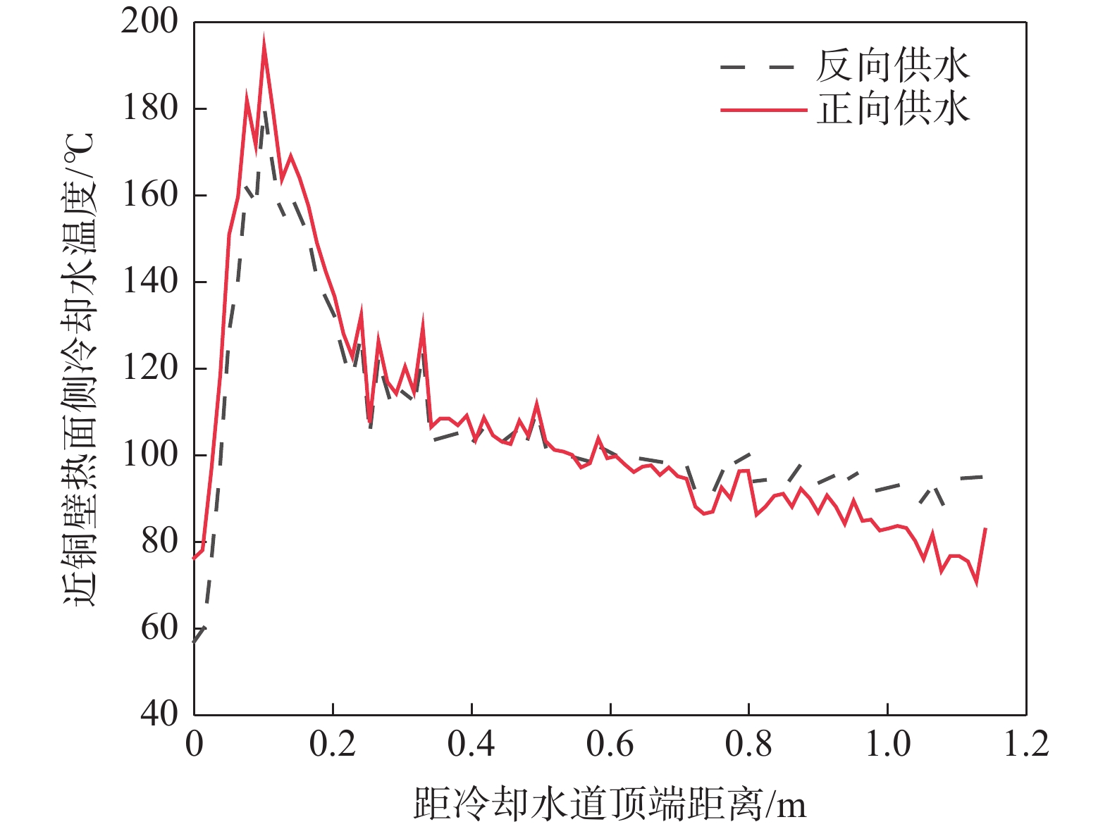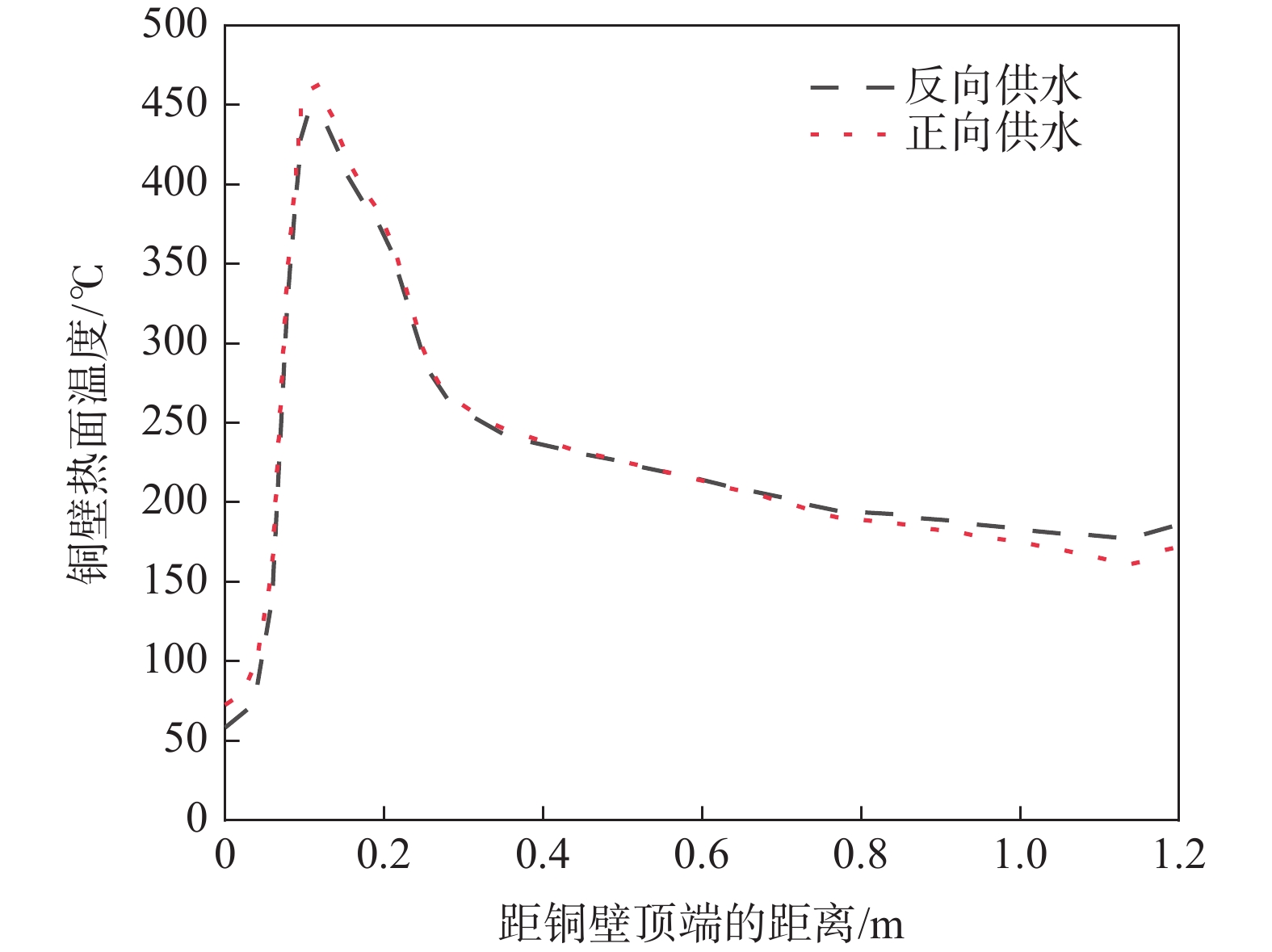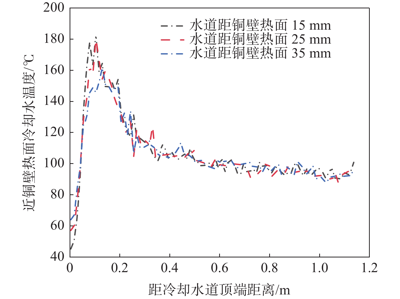To reveal heat transfer mechanism of the slab-copper wall-cooling water system in the high-speed continuous casting mold, a three-dimensional fluid-solid-thermal coupling numerical model of slab-copper wall-cooling water in a FTSC mold was established. The influence of mold cooling process on temperature distribution of the mold copper wall and cooling water under the condition of high drawing speed had been analyzed. The results show that the peak temperature on hot surface of the copper wall with reverse water supply is 15 ℃ lower than that of the forward water supply, and the peak cooling water temperature is lowered by 14 ℃. Increasing cooling water speed can effectively reduce temperatures on copper wall and of the cooling water. Under the conditions of the cooling water does not boil , increasing the water supply pressure does not affect the mold temperature field and the cooling water inlet temperature has little effect on the temperature of the copper wall and the cooling water near the meniscus. In the low heat flow area at the lower part of the mold, the temperature change of the cooling water is more obviously affected by the inlet water temperature. The distance between the cooling water channel and the hot surface of the copper wall has a significant effect on the copper wall temperature. The cooling water temperature in the water channel at a distance of 15 mm and 25 mm from hot surface of copper wall remains same, while it significantly reduces at the distance of 35 mm away from the hot surface.