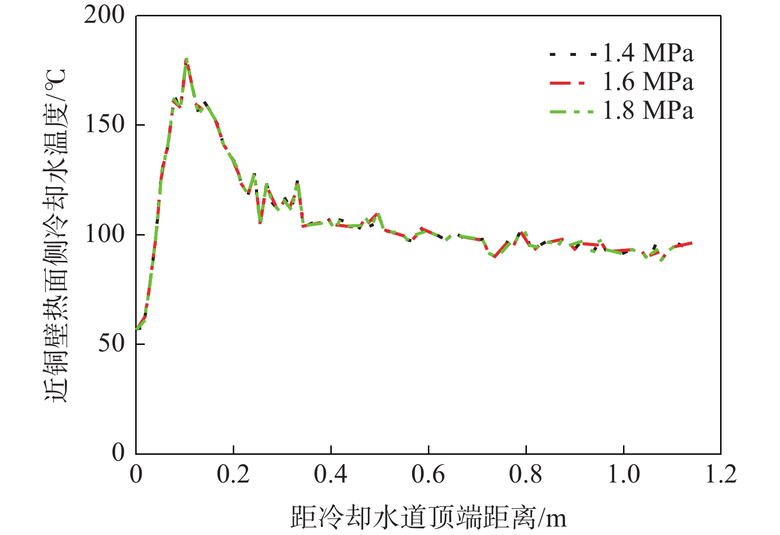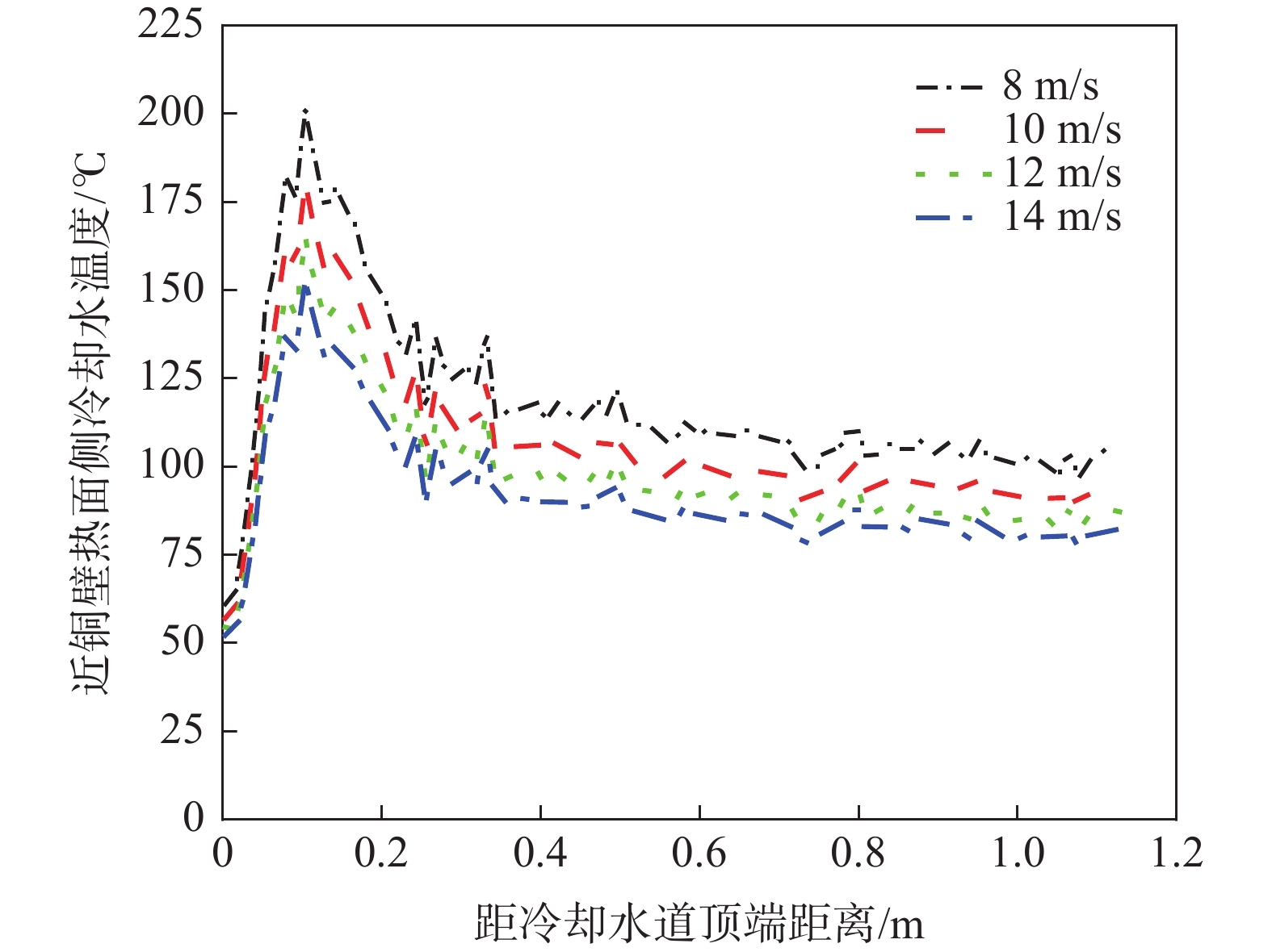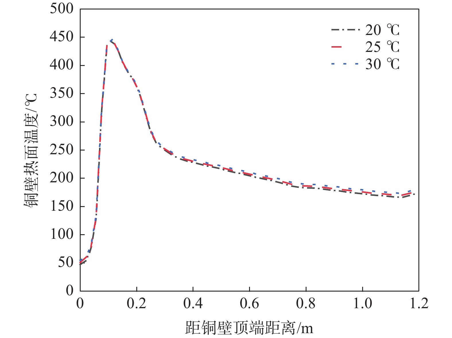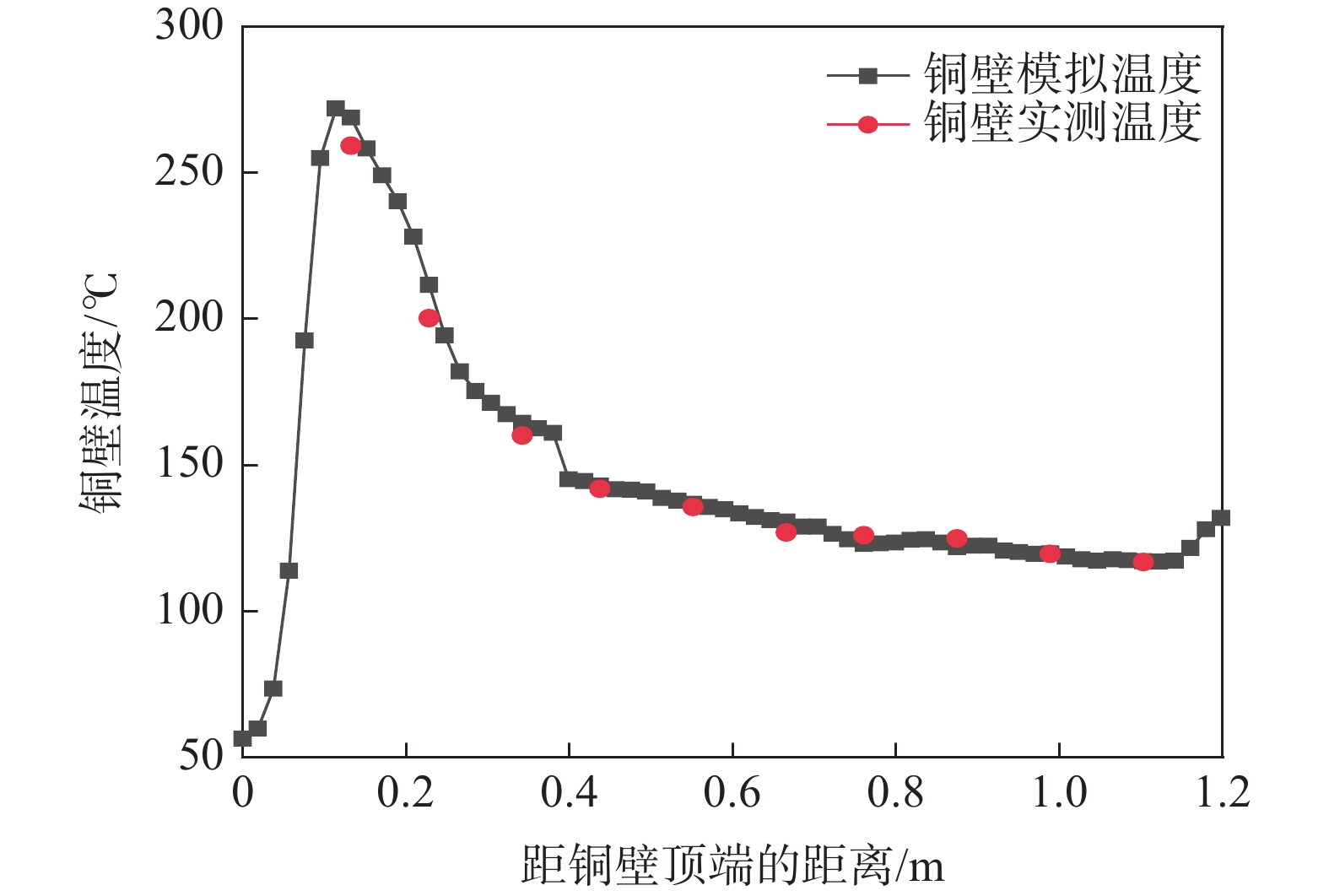 To reveal heat transfer mechanism of the slab-copper wall-cooling water system in the high-speed continuous casting mold, a three-dimensional fluid-solid-thermal coupling numerical model of slab-copper wall-cooling water in a FTSC mold was established. The influence of mold cooling process on temperature distribution of the mold copper wall and cooling water under the condition of high drawing speed had been analyzed. The results show that the peak temperature on hot surface of the copper wall with reverse water supply is 15 ℃ lower than that of the forward water supply, and the peak cooling water temperature is lowered by 14 ℃. Increasing cooling water speed can effectively reduce temperatures on copper wall and of the cooling water. Under the conditions of the cooling water does not boil , increasing the water supply pressure does not affect the mold temperature field and the cooling water inlet temperature has little effect on the temperature of the copper wall and the cooling water near the meniscus. In the low heat flow area at the lower part of the mold, the temperature change of the cooling water is more obviously affected by the inlet water temperature. The distance between the cooling water channel and the hot surface of the copper wall has a significant effect on the copper wall temperature. The cooling water temperature in the water channel at a distance of 15 mm and 25 mm from hot surface of copper wall remains same, while it significantly reduces at the distance of 35 mm away from the hot surface.