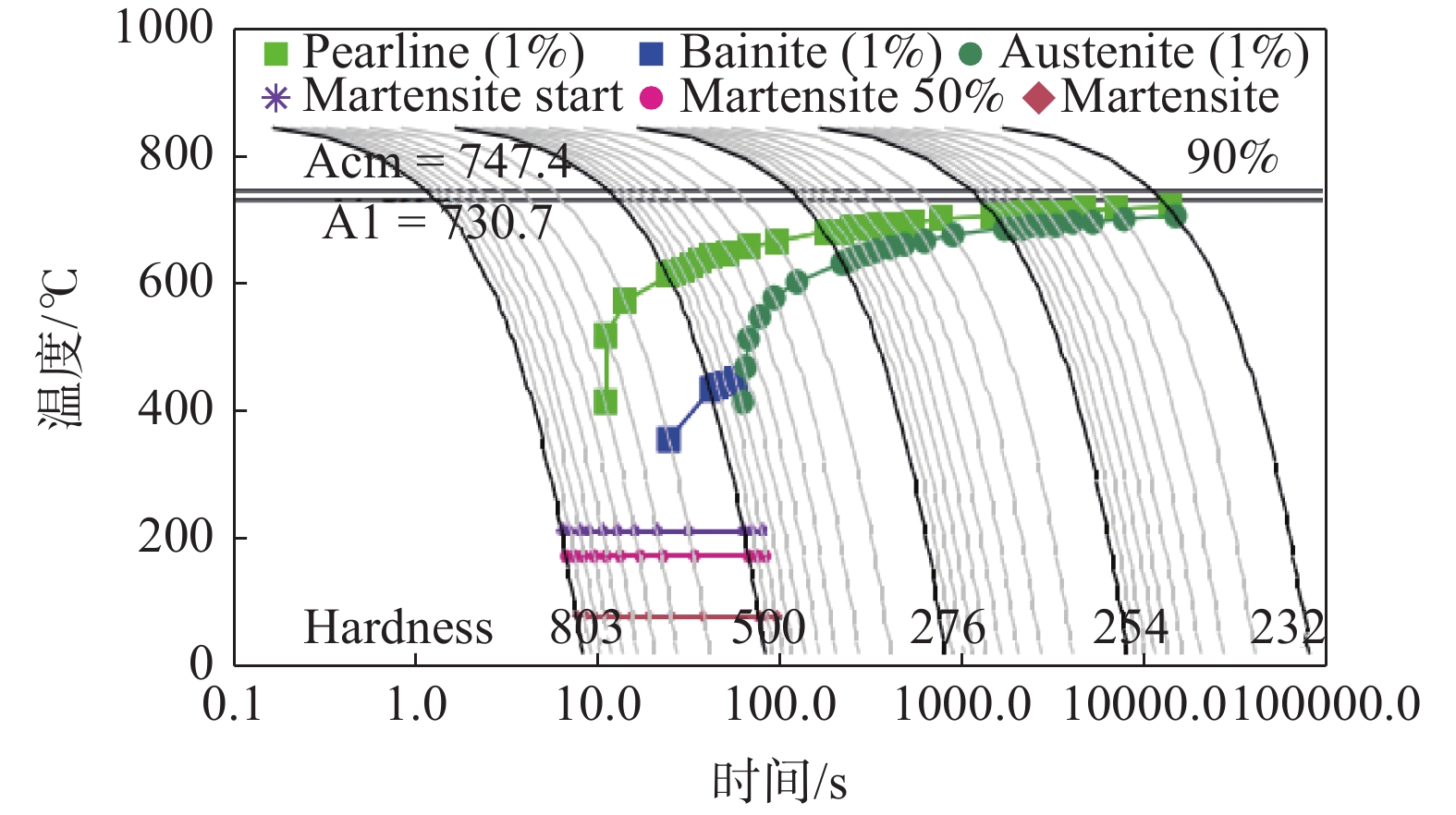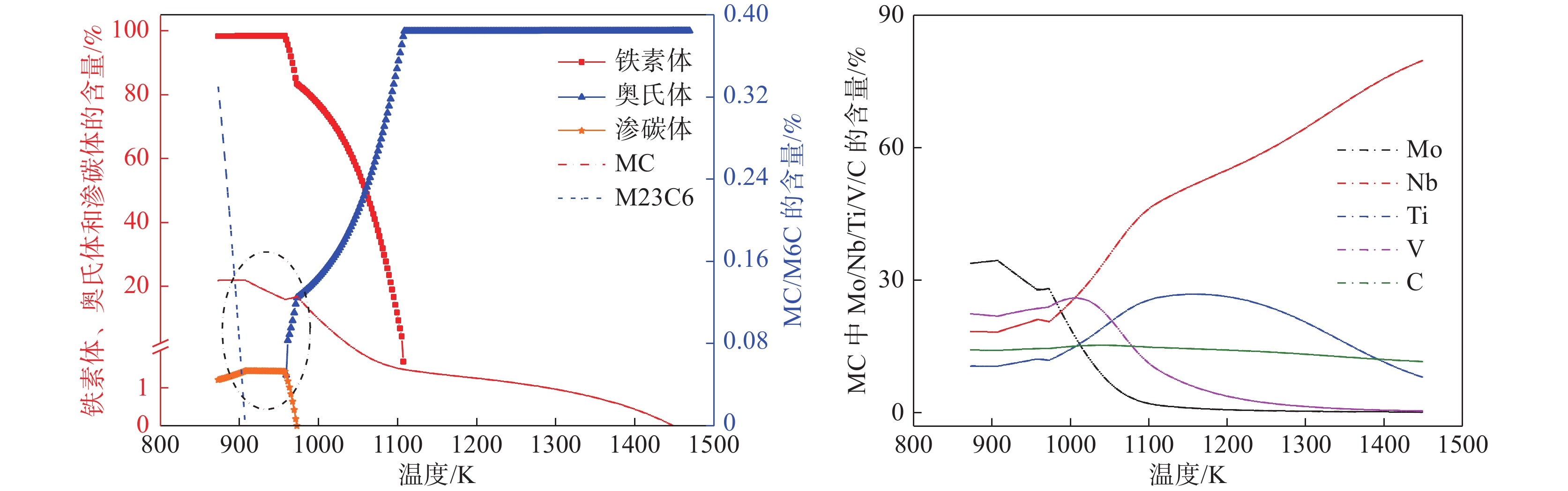 The precipitation thermodynamics of the multi-element composite precipitates in the Nb-Ti-V-Mo microalloy E460 off shore steel was calculated by JmatPro thermodynamics software, in combination with the classical nucleation and growth kinetic theory, were used to study precipitation law of (Nb,Ti,Mo,V)C in austenite and ferrite. The influence of austenite deformation storage and deformation-induced precipitation on (Nb,Ti,Mo,V)C precipitation and precipitation kinetics were also discussed. The results indicate that (Nb,Ti,Mo,V)C begins to precipitate at 1 448.6 K. In austenite region, as the temperature decreases the critical nucleation energy gradually decreases, and the NrT curve and the PTT curve show a monotonous trend. In the two-phase region of austenite and ferrite, the fastest precipitation temperature of (Nb,Ti,Mo,V)C is 1 062.6 K. Relative nucleation rate increases, and both precipitation and incubation period shorten with the increase of deformation energy storage. As the amount of precipitation induced by deformation increases, the PTT curve shifts to the left, and the maximum nucleation rate temperature and the fastest precipitation temperature are between 1058.3 K and 1063.8 K.