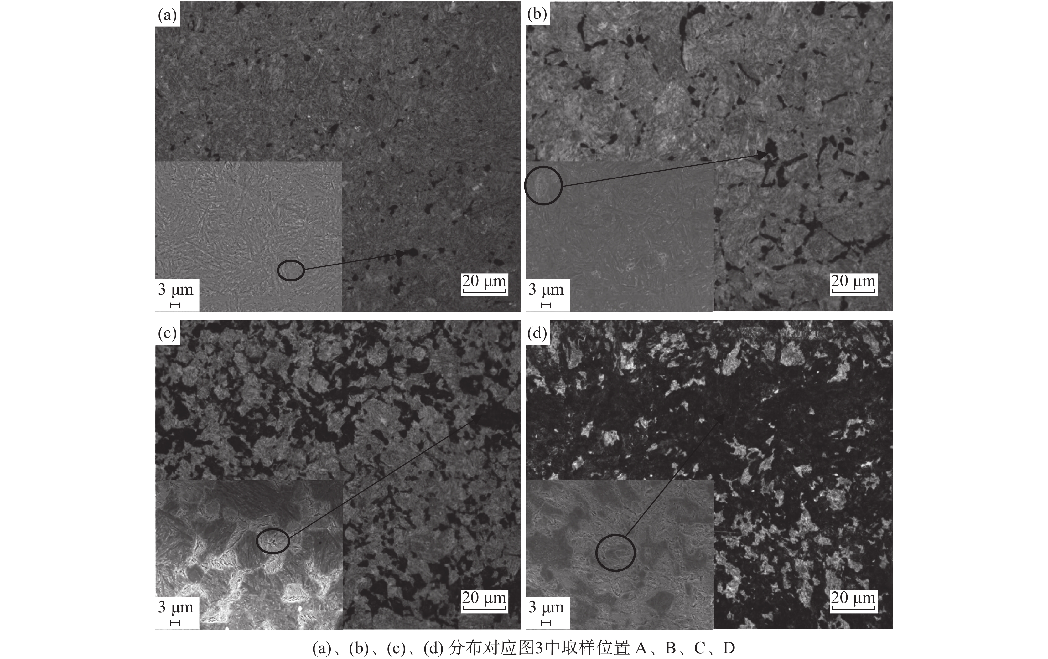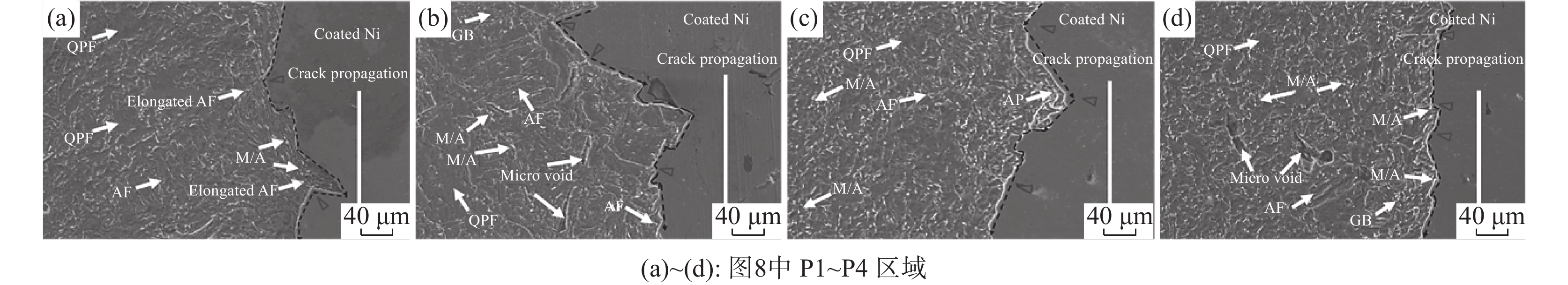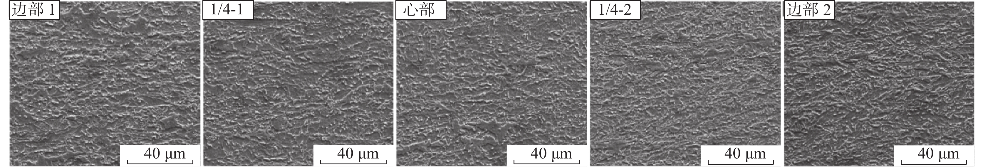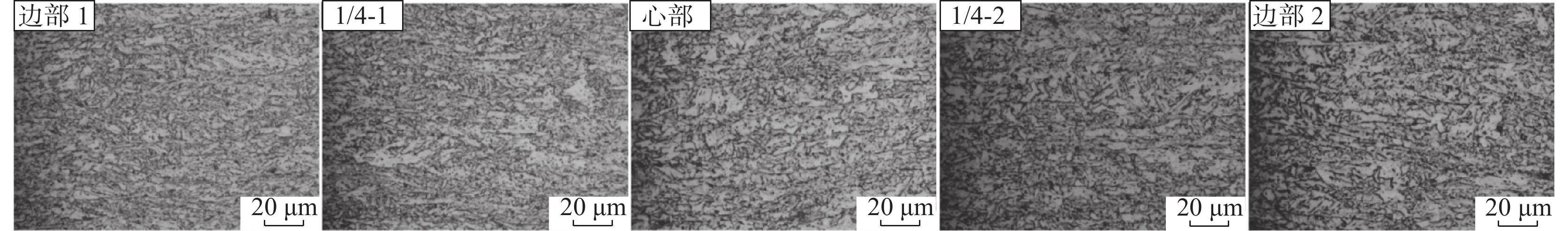 The effects of different final cooling temperatures on the microstructure and drop weight properties of 21.4 mm thick X80 linepipe steel strip were studied, and the effect of different microstructure on crack propagation path was discussed. When the final cooling temperature is 480 ℃, the microstructure of the resulted steel strip is composed of granular bainite + fine quasi-polygonal ferrite. When the final cooling temperature is increased to 510 ℃, large-size polygonal ferrite appears in the core of strip sample. As the final cooling temperature further increases, the volume fraction of large-size polygonal ferrite increases. When the final cooling temperature is increased from 480 ℃ to 550 ℃, the microrstructure across cross section transforms from fully acicular ferrite to acicular ferrite in the edge + large-size polygonal ferrite in the core. Since the large-size polygonal ferrite in the core cannot restrain crack propagation effectively, the drop weight shear area of tested steel decreases from 100% to 72% with cooling temperature increasing from 480 ℃ to 550 ℃.