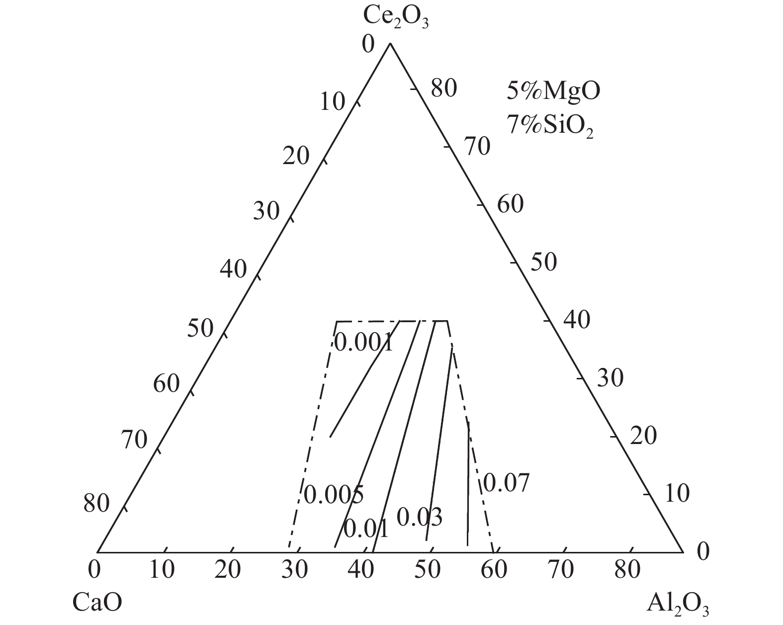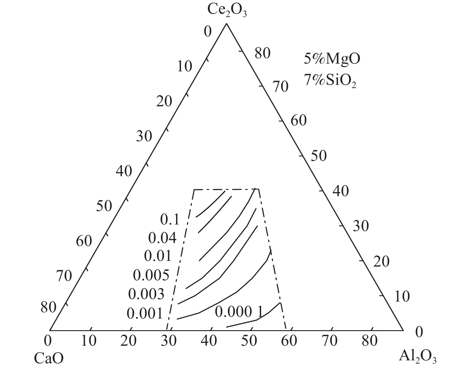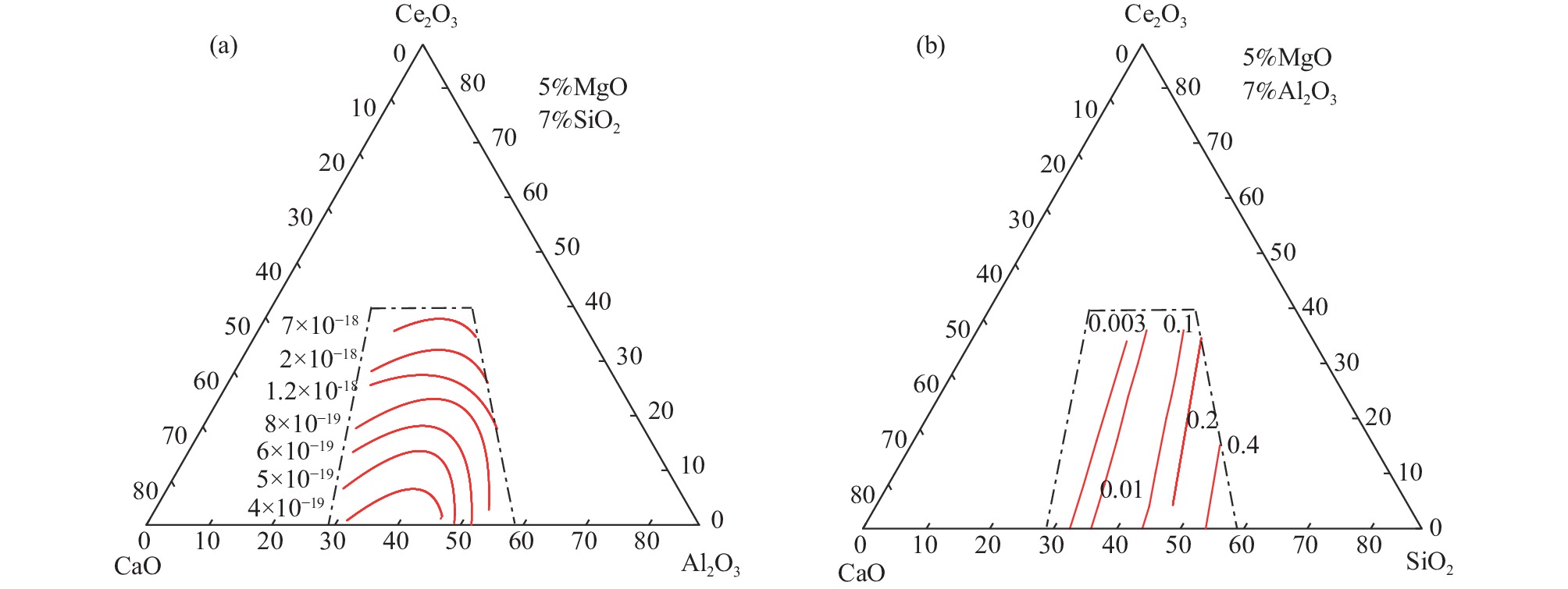 During smelting steel containing rare earth elements, there exists strong reaction between the molten steel and the slag, which may result in significant content fluctuation of dissolved rare earth and then reduce its effect in steel. However, the lack of thermodynamic data of rare earth-containing slag system limits the development of related research work. In this paper, based on the ion and molecule coexistence theory, an activity calculation model of the CaO-Al2O3-MgO-SiO2-Ce2O3 slag system has been established, which can be used to construct the iso-activity diagram and investigate w(CaO)/w(Al2O3), w(Ce2O3) and other composition changes on the activity of each component of the slag system. The results show that the SiO2 activity range (4×10?19~7×10?18) of CaO-Al2O3-based refining slag is much smaller than that of CaO-SiO2-based refining slag (0.003~0.4), that is, CaO-Al2O3-based slag is more suitable for rare earth steel. For CaO-Al2O3-based refining slag, increasing the w(CaO)/w(Al2O3) and w(Ce2O3) of the slag can increase the activity of Ce2O3 and decrease the activity of Al2O3 , which may restrain the reaction between the rare earth-containing molten steel and Al2O3 in the slag.