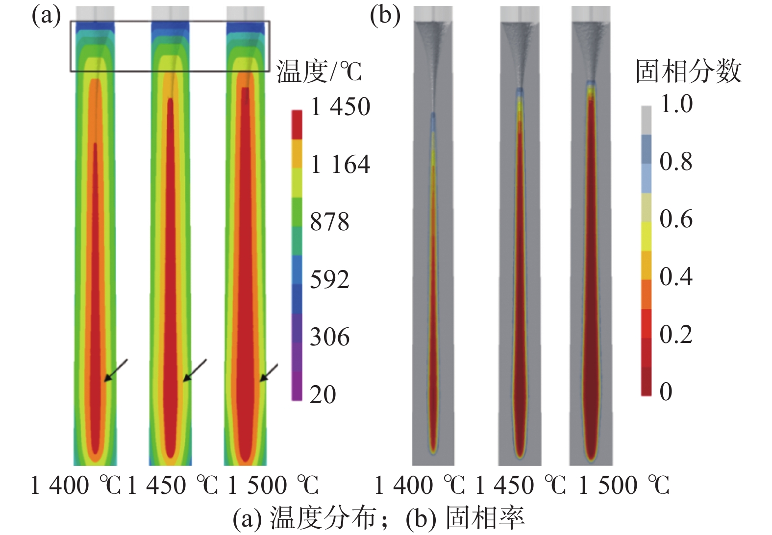 In this paper, the numerical simulation on pouring process of nickel base superalloy induction ingot had been carried out by using ProCAST software. The change characteristics of temperature field and solid fraction during the filling and solidification process of ingot and their influence on ingot shrinkage porosity had been studied. Moreover, the change rule of ingot shrinkage porosity with pouring temperature had been investigated in detail. The results show that the temperature of the upper ingot is lower than that of the lower ingot along the longitudinal direction of ingot during solidification process, and sequential solidification does not occur in the ingot, thus the V-shaped primary shrinkage porosity of the ingot is deep. In the filling stage, the change of pouring temperature has little effect on the maximum flow speed and level fluctuation of alloy. In the solidification stage, lowering pouring temperature can reduce the high-temperature area at the lower part of the ingot and the primary shrinkage depth at the end of the ingot to a certain extent. Nevertheless, changing pouring temperature can not make the ingot achieve sequential solidification in the longitudinal direction, consequently, lowering the pouring temperature can not significantly reduce the primary shrinkage porosity at the end of the ingot. Moreover, the change of pouring temperature has little effect on the small shrinkage porosity in the ingot.