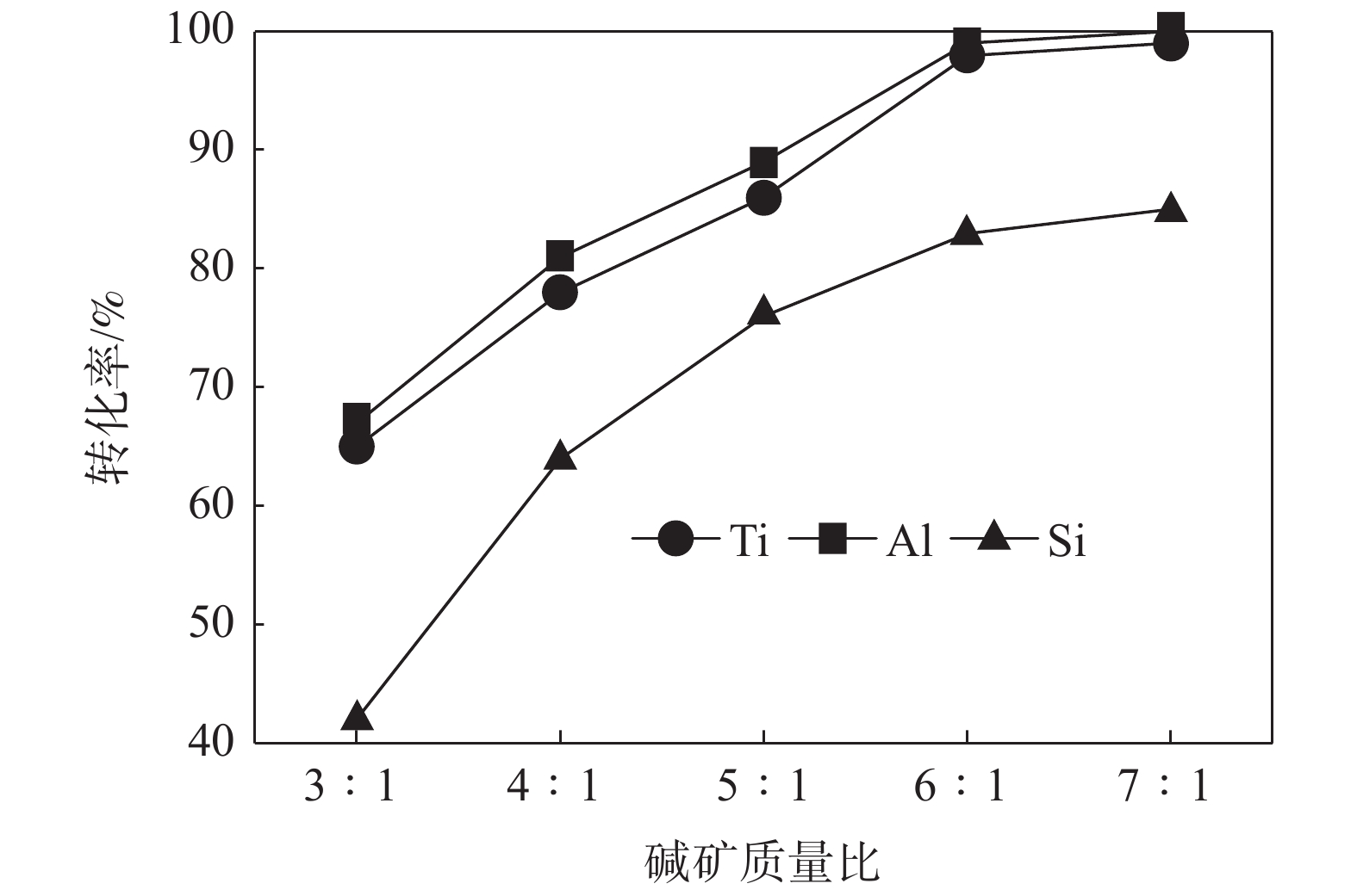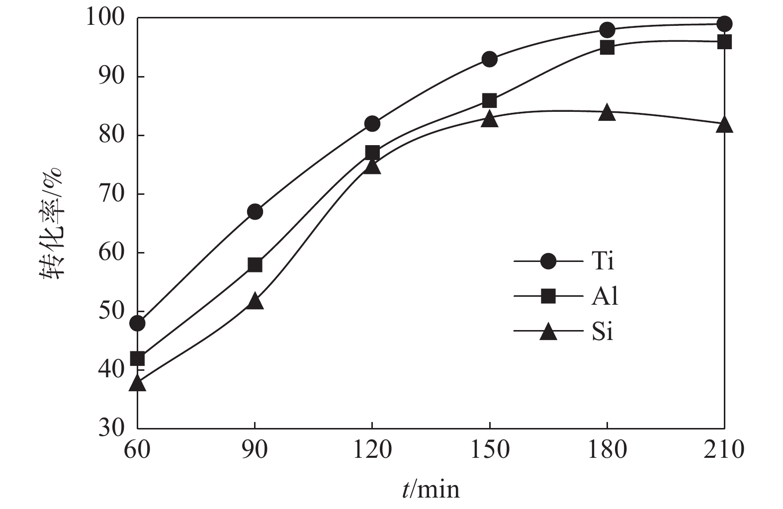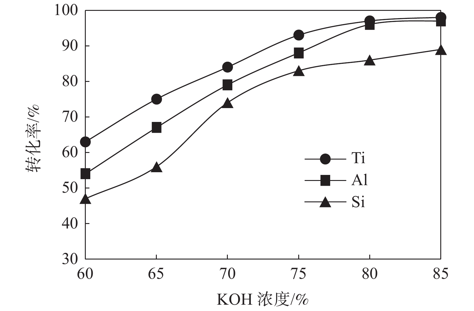 The treatment of titanium middling ore with KOH sub molten salt was studied to realize the enrichment of titanium resources. The effects of reaction temperature, reaction time, alkali concentration and particle size on the decomposition of titanium middling ore were investigated, and the phase of the product was analyzed by X-ray diffraction. The following conclusions were drawn. Firstly, the effective decomposition can be realized by treating titanium middling ore with KOH sub molten salt. The better process parameters include stirring speed of 400 r/min, alkali residue mass ratio of 6∶1, reaction temperature of 240 ℃, reaction time of 180 min, alkali concentration of 80%, raw material particle size of 70~80 μm. Under these reaction conditions, the decomposition rate of titanium in the ore is more than 99% , while the decomposition rate of aluminum and silicon is more than 98% and 85%, respectively. Secondly, X-ray diffraction analysis shows that the decomposition product of sub molten salt is mainly potassium hexatitanate (K2Ti6O13) after calcination at 800 ℃ for 3 h, indicating that KOH can effectively decompose titanium middling ore and remove aluminum, silicon and other elements.