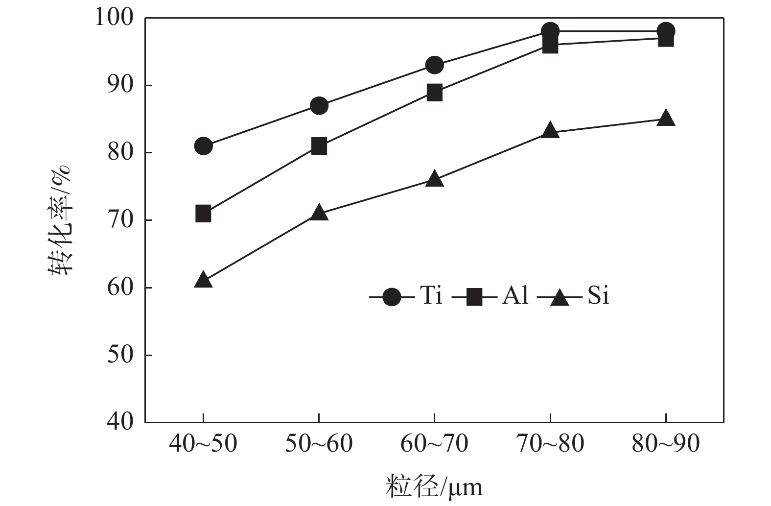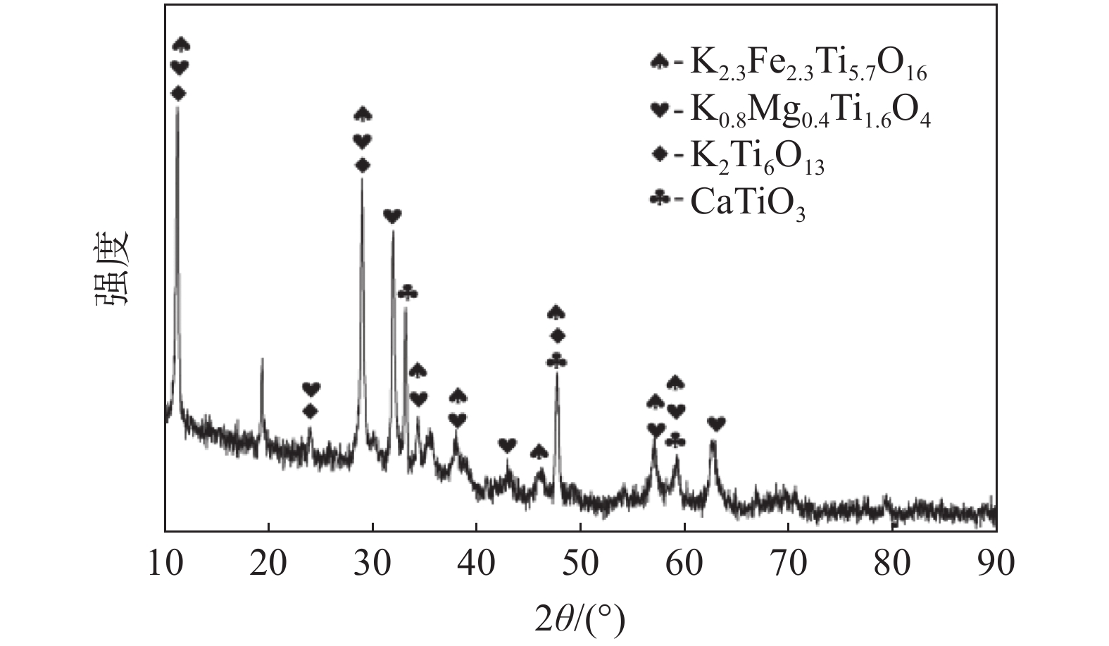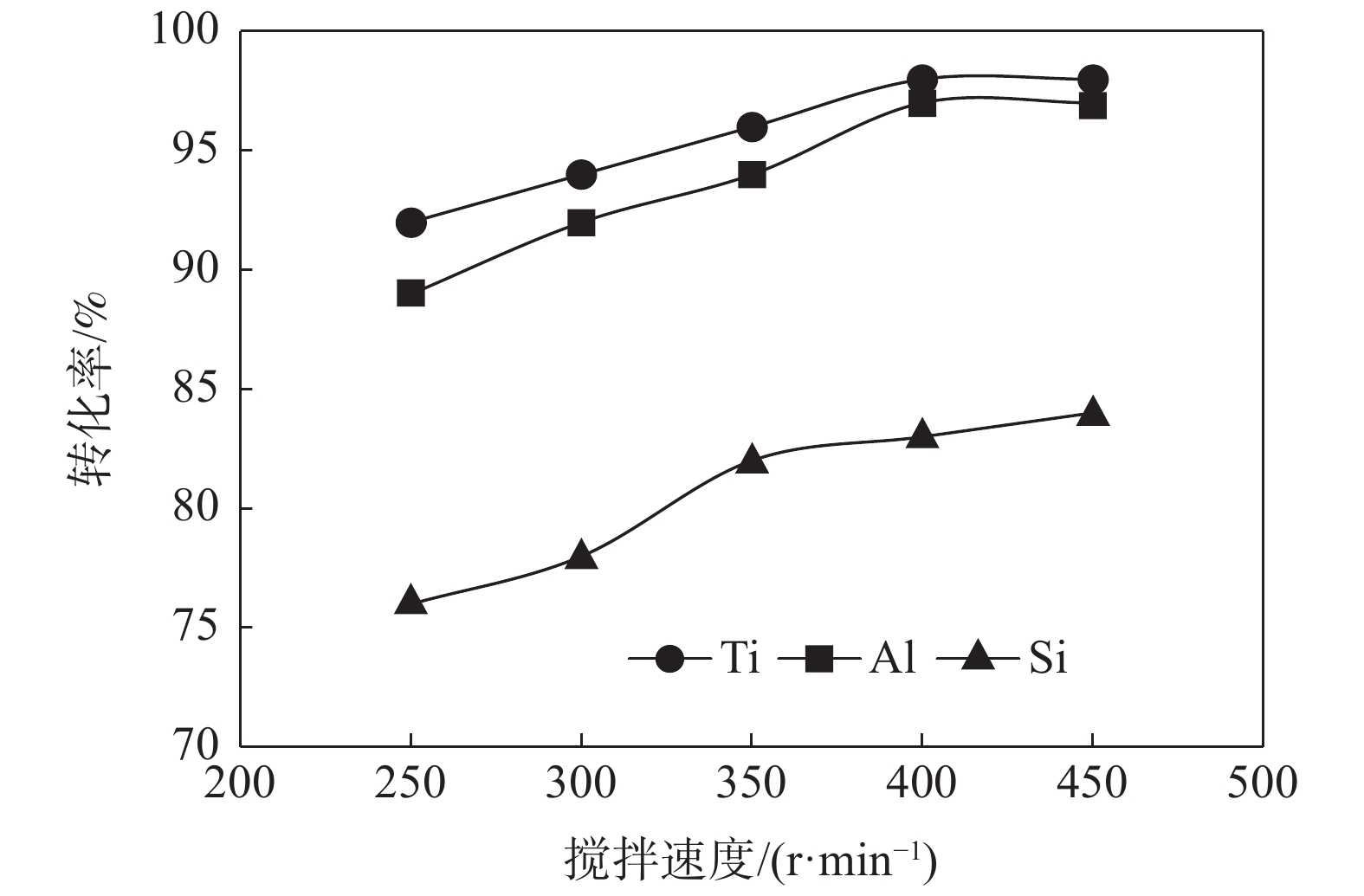 The treatment of titanium middling ore with KOH sub molten salt was studied to realize the enrichment of titanium resources. The effects of reaction temperature, reaction time, alkali concentration and particle size on the decomposition of titanium middling ore were investigated, and the phase of the product was analyzed by X-ray diffraction. The following conclusions were drawn. Firstly, the effective decomposition can be realized by treating titanium middling ore with KOH sub molten salt. The better process parameters include stirring speed of 400 r/min, alkali residue mass ratio of 6∶1, reaction temperature of 240 ℃, reaction time of 180 min, alkali concentration of 80%, raw material particle size of 70~80 μm. Under these reaction conditions, the decomposition rate of titanium in the ore is more than 99% , while the decomposition rate of aluminum and silicon is more than 98% and 85%, respectively. Secondly, X-ray diffraction analysis shows that the decomposition product of sub molten salt is mainly potassium hexatitanate (K2Ti6O13) after calcination at 800 ℃ for 3 h, indicating that KOH can effectively decompose titanium middling ore and remove aluminum, silicon and other elements.