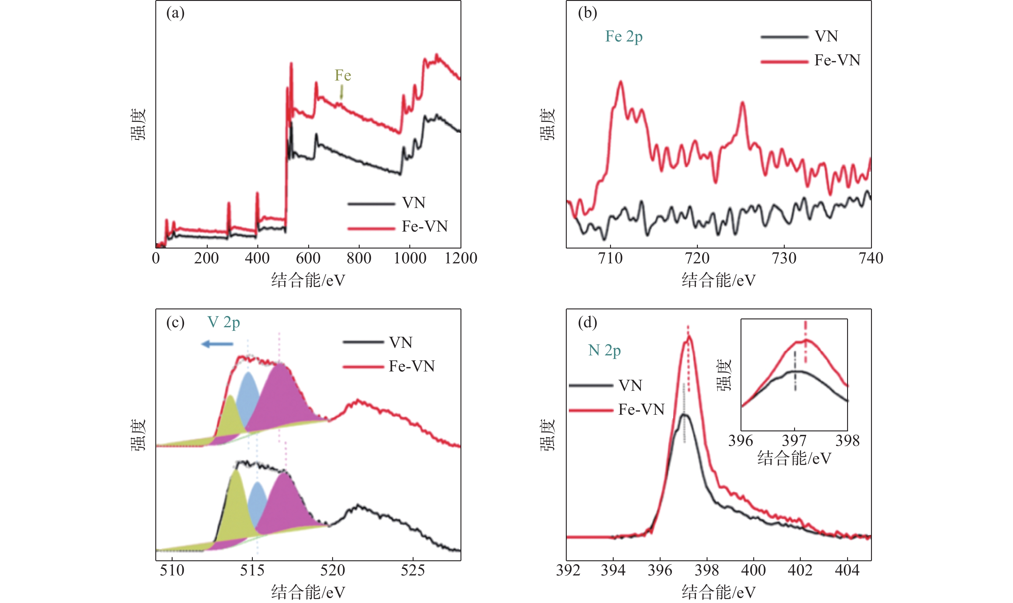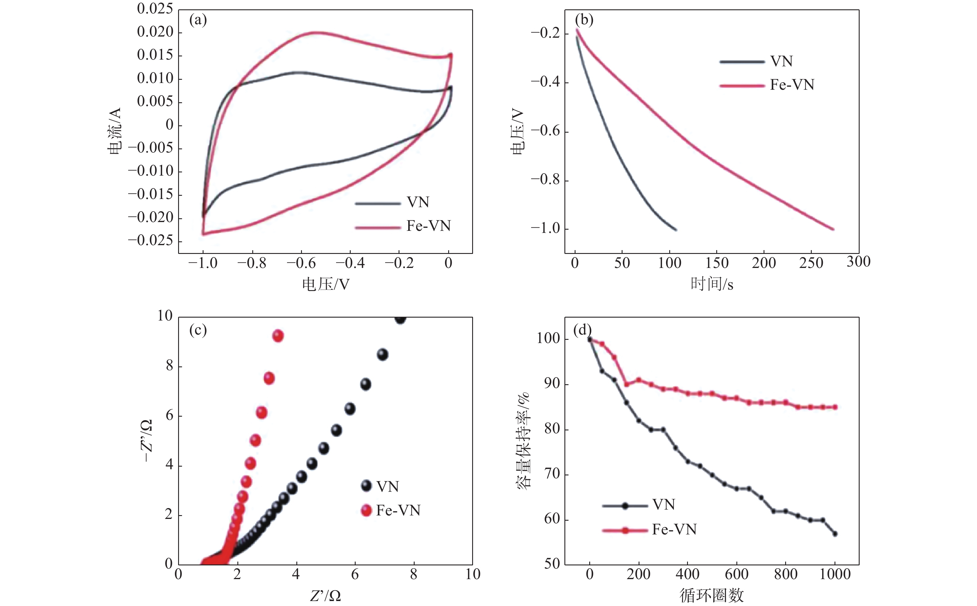 In this paper, a method to improve the electrochemical performances of VN-based materials by electronic structure regulation is proposed. By Fe doping, the electronic structure of VN-based materials was modified for better electrochemical performances. XRD, HRTEM, XPS and other methods were used to characterize the effect of Fe on the microstructure and electronic structure of VN-based materials. Combined with the DFT calculation, it shows that the electron/ion transport capacity of VN-based materials is changed by introduction of Fe element, which endows the as-prepared Fe-VN material with excellent supercapacitor performances. The specific capacity is 343.75 F/g at a current density of 1 A/g, and 85% of the initial capacity can be retained after 1000 charge-discharge cycles.