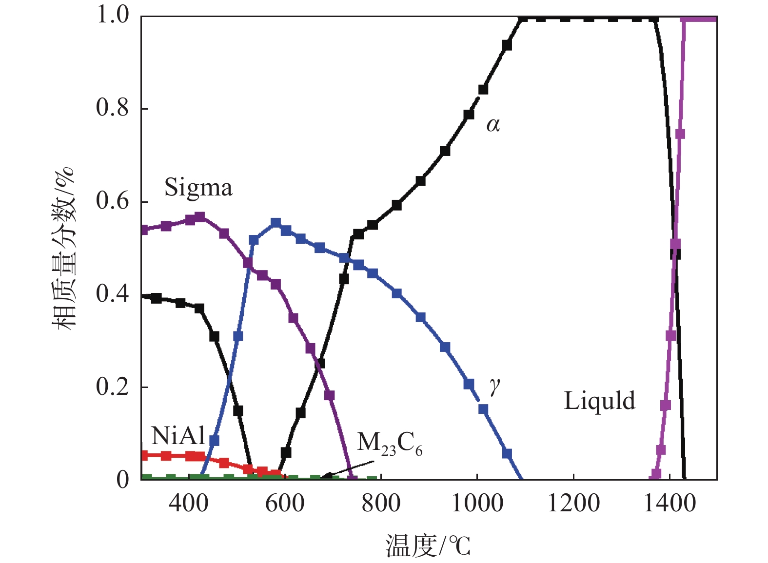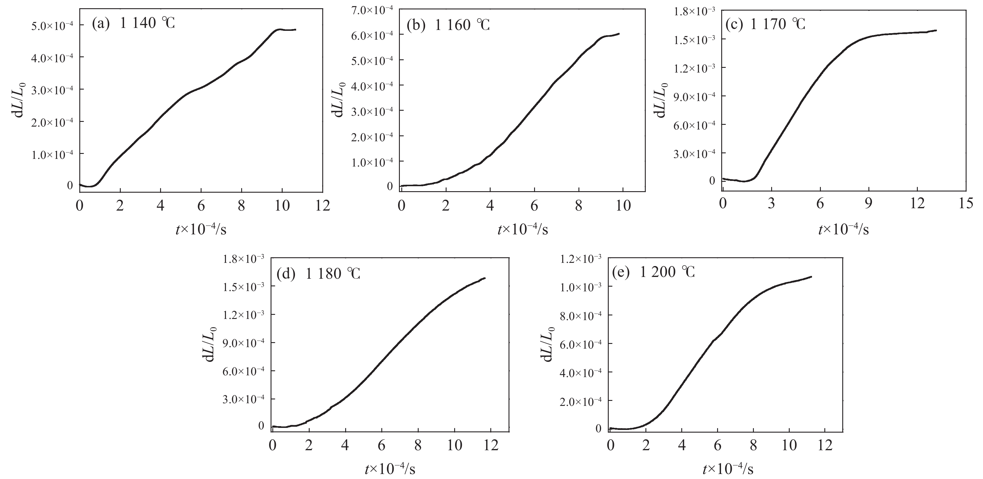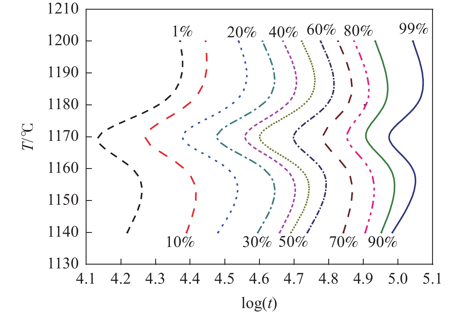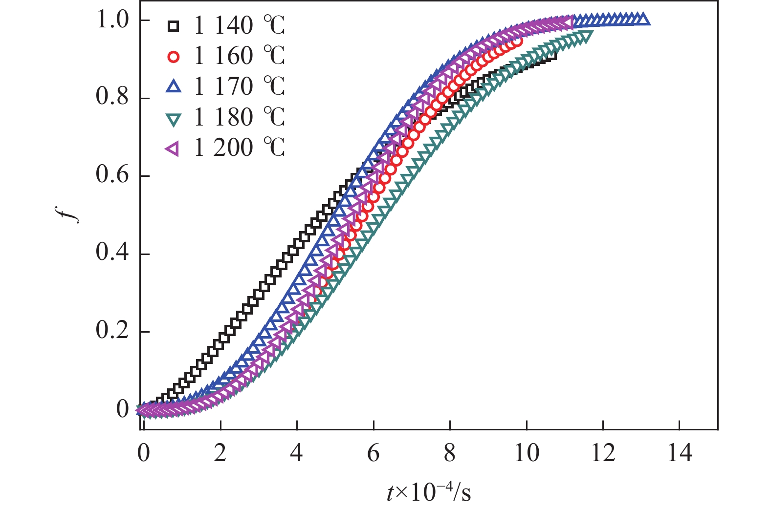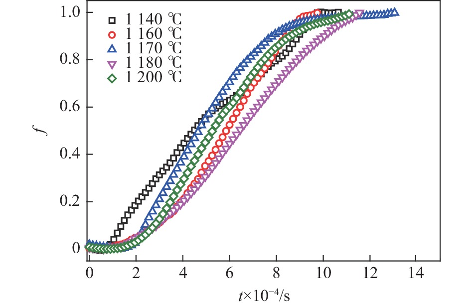 The isothermal phase transformation kinetics of α2→α at the temperature 1140?1200 ℃ in high Nb-TiAl alloy were systematically studied by in-situ thermal expansion method. The results show that during the α2→α isothermal phase transformation of high Nb-TiAl alloy, the “nose tip” temperature of α2→α phase transformation is 1170 ℃, and the formation of α phase presents an “S” curve. Based on the thermal expansion curve, the corresponding JMA isothermal phase transformation kinetics equation during the isothermal process was obtained. On the basis of the JMA equation, the Avrami exponent n and temperature constant K of isothermal phase transformation of high Nb-TiAl alloy were obtained by logarithmic fitting the fractional time curve of phase transformation. Based on the results of thermal expansion measurement, the time-temperature-transformation diagram (TTT diagram) was plotted for high Nb-TiAl alloy. The phase transformation kinetics mechanism of high Nb-TiAl alloy controlled by diffusion was revealed.