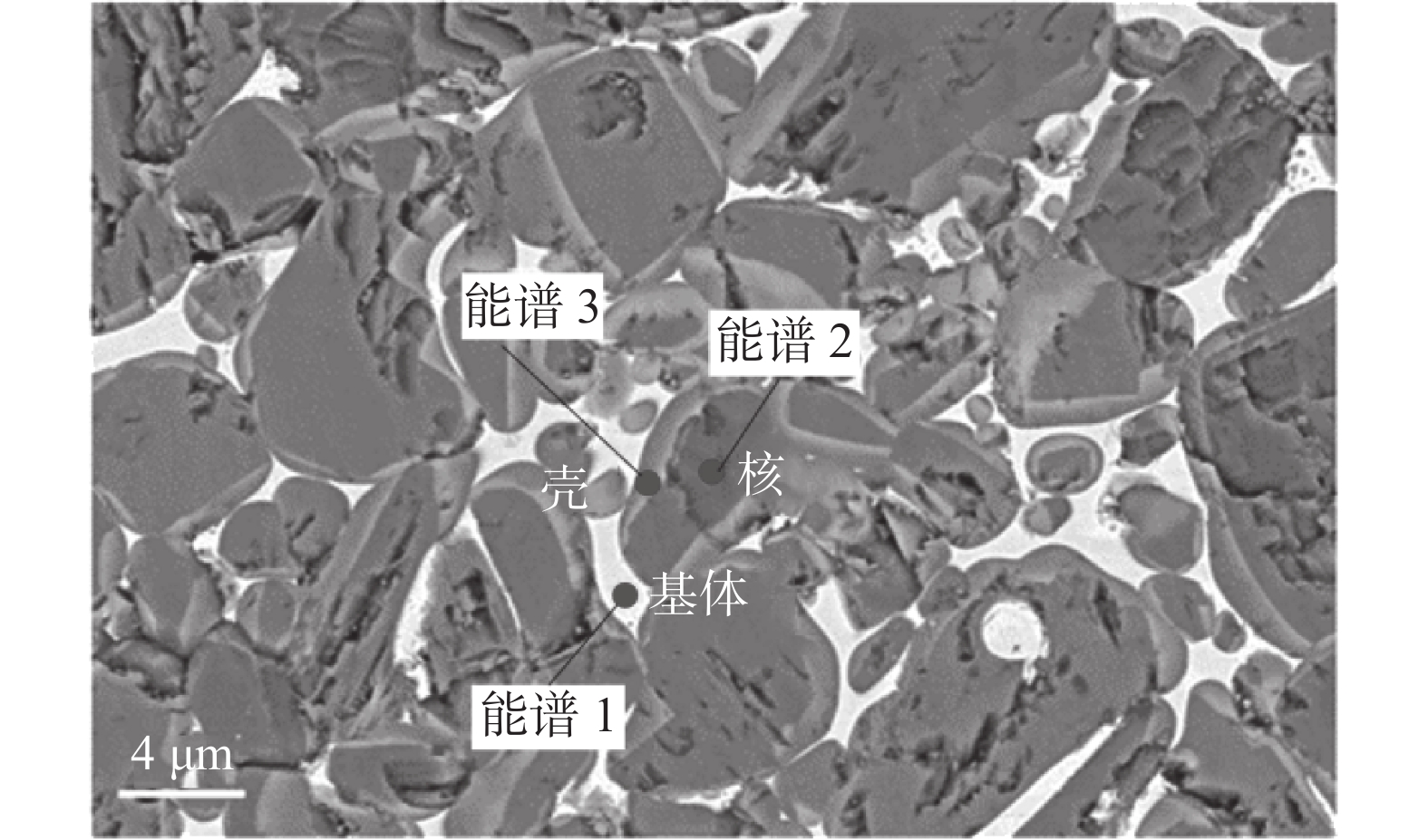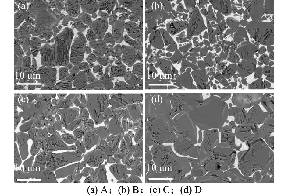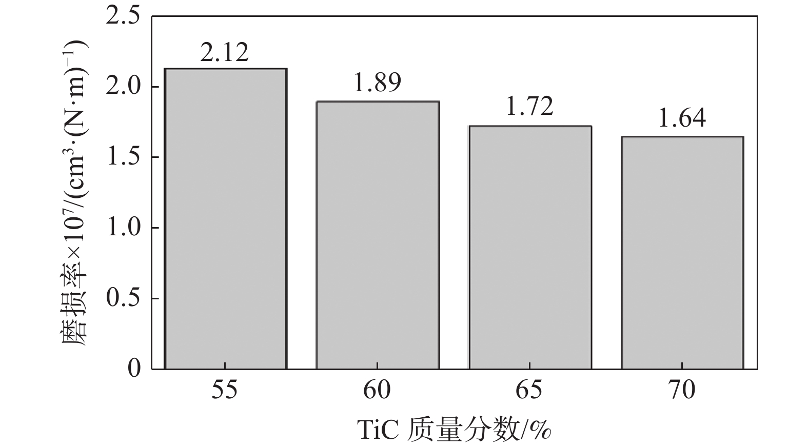 Cemented carbides with different TiC mass fractions were prepared by spark plasma sintering (SPS) to reveal the influence mechanism of microstructure on hardness and wear behavior, and to explore the possibility of cemented carbides with high TiC mass fraction as wear-resistant materials. The results show that the sample with compact microstructure can be obtained by SPS sintering. The porosity of cemented carbide with 55% TiC mass fraction is 0.07%, and the porosity of cemented carbide increases with the increase of TiC mass fraction. In the sintering process, Mo participates in the formation of complex core-shell structure around TiC particles, and Ni distributes in the metal bonded phase. The large size TiC particles keeps their original morphology, while the small size TiC particles spheroidizes gradually and the particle enrichment area appears. The hardness of cemented carbide increases with the increase of TiC mass fraction. The microhardness (HV) of cemented carbide with 70% TiC mass fraction is 559 higher than that with 55% TiC mass fraction. The friction and wear tests show that the TiC particles are broken and spalling under stress, and the cemented carbide with 55% TiC mass fraction has the highest wear rate and the worst wear resistance. The cemented carbide with 70% TiC mass fraction has the lowest wear rate and the best wear resistance.