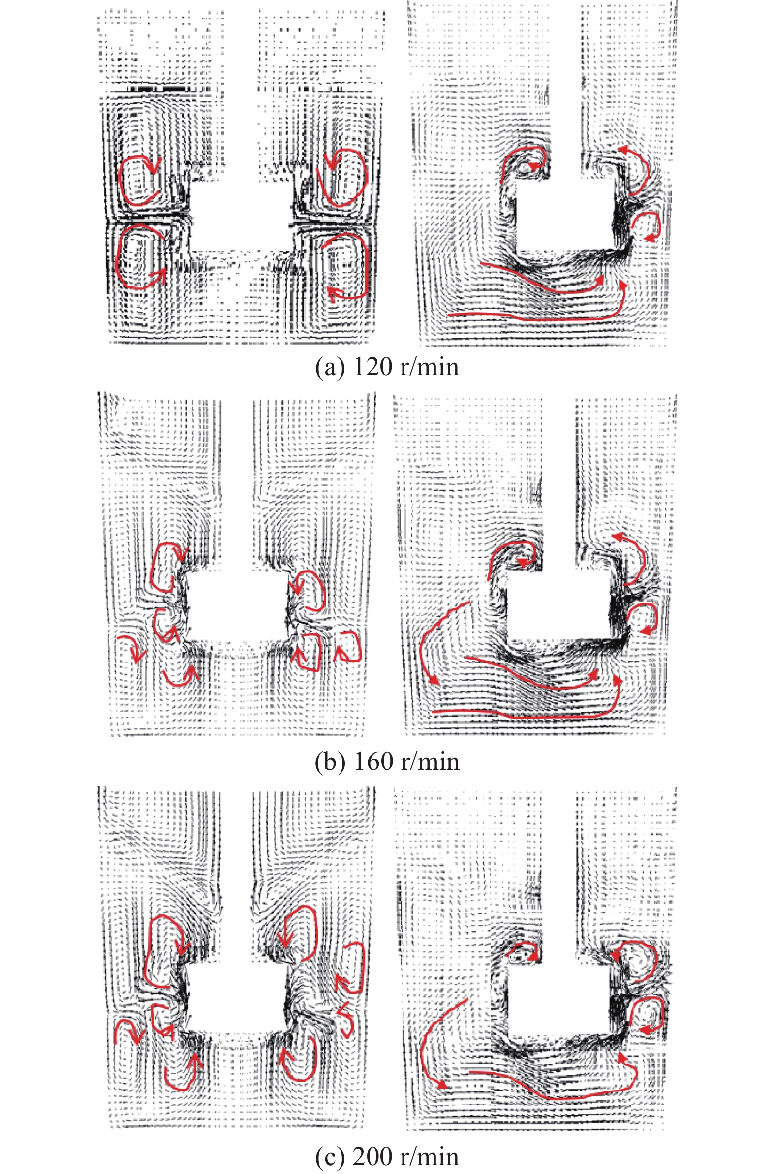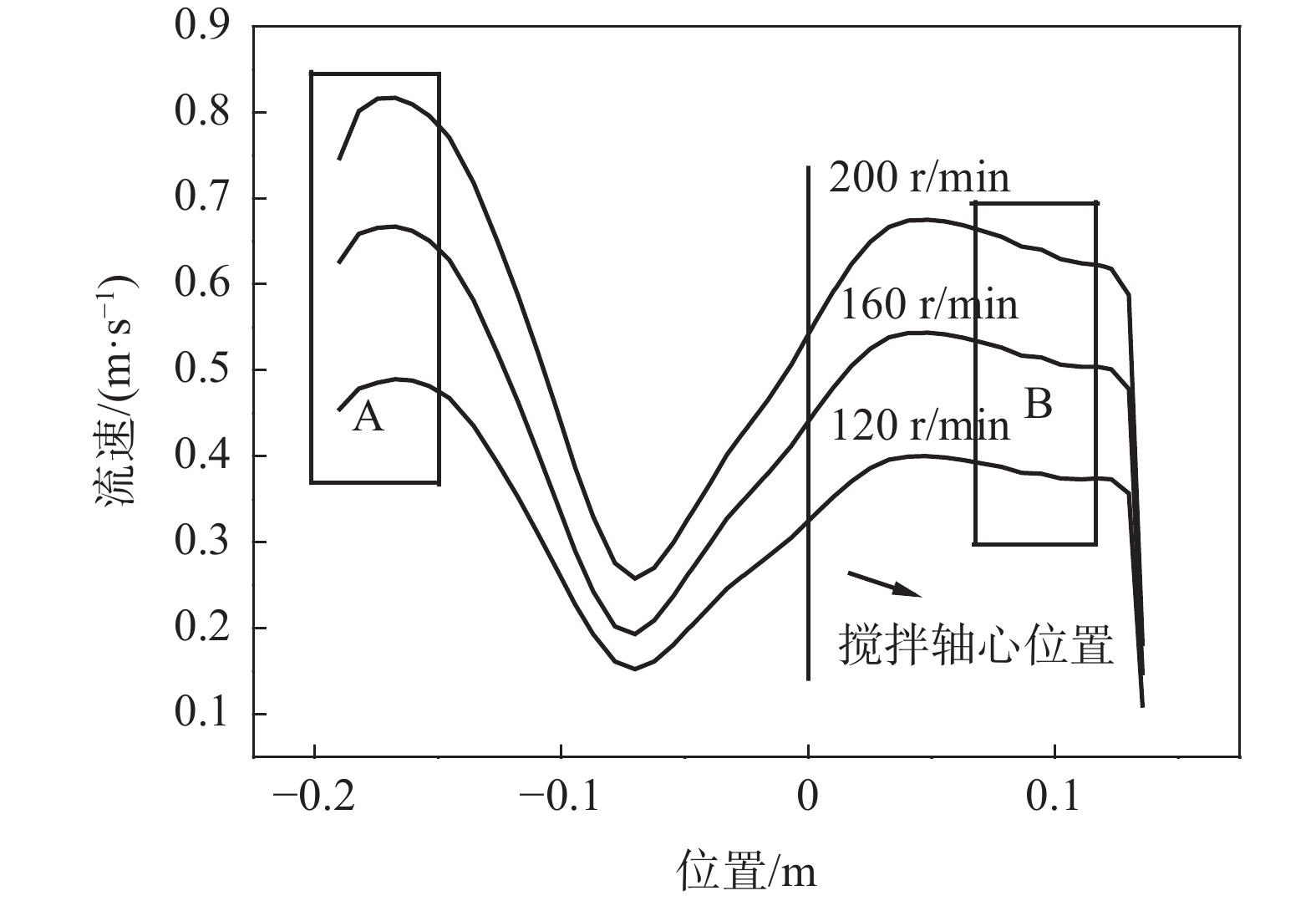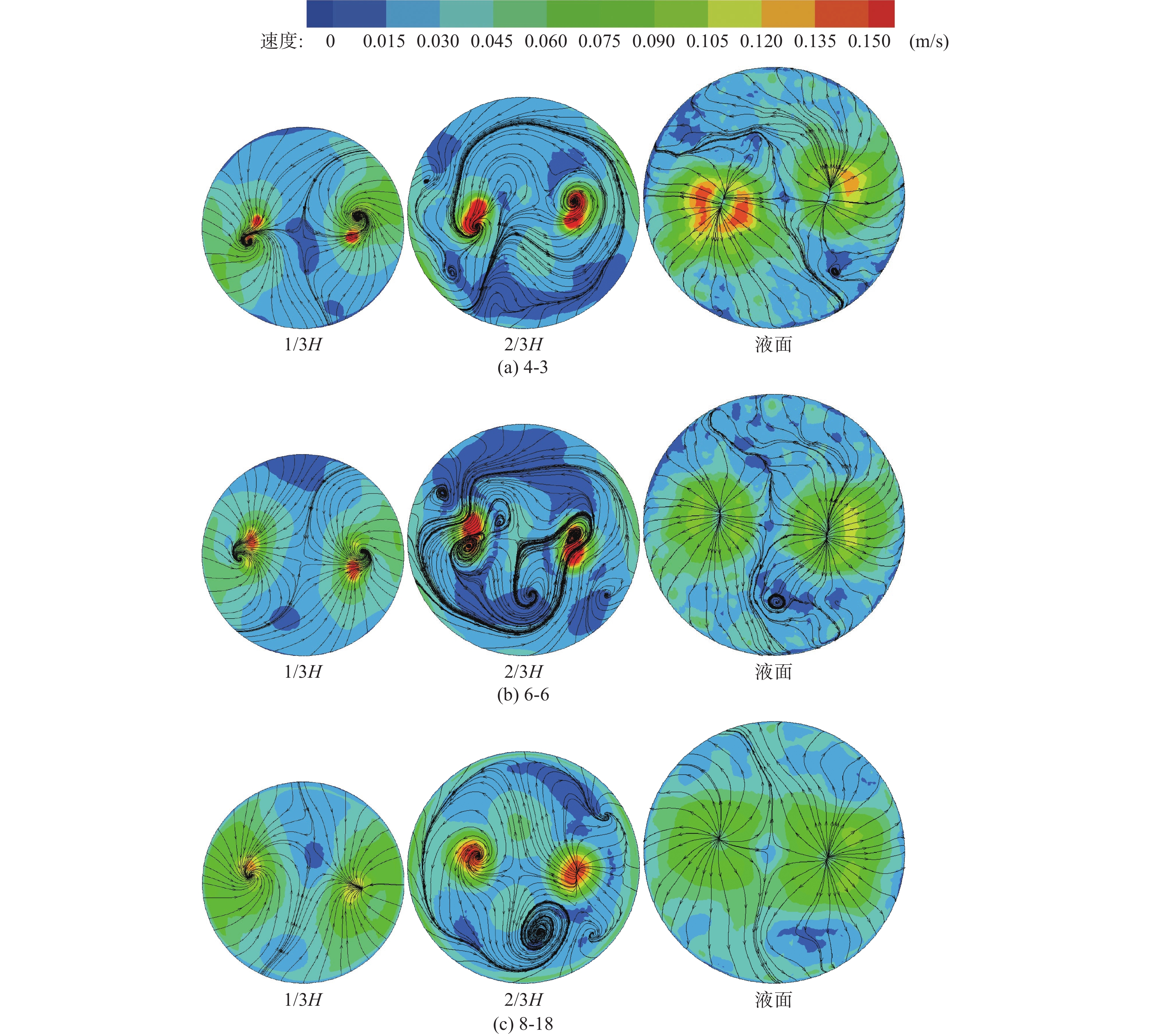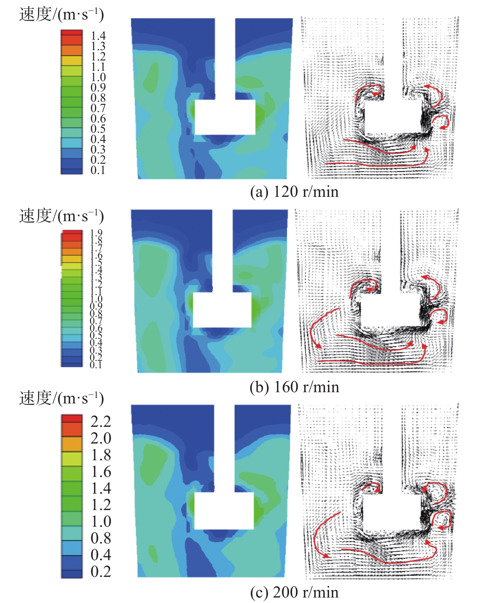 Based on the actual size of molten iron tank, a physical model was proportionally established to simulate the eccentric stirring desulfurization using KR method. Numerical simulation was made to simulate the desulfurization process of hot metal with eccentric stirring by VOF multiphase flow model, standard k-? turbulence model and Multiple Reference Frame method (MRF) using CFD software. It is found that the vortex shape is irregular during the eccentric stirring process, and the maximum vortex depth is located in the center of the mixer. Fluid moves strongly near the agitator wall, and flows along the upper and lower directions. Fluid in the far side moves slowly, and the average fluid velocity in the end side of blade is about twice that in the far side. Eccentric stirring can change the motion state of fluid at the bottom of the mixer and reduce the "dead zone". When the stirring speed increases from 120 r/min to 200 r/min, the average fluid speed increases by about 68%, and the volume proportion of high-speed fluid decreases slightly, from 60.4% to 57.9%. Eccentric stirring is easy to be realized in industry, and the increase of speed is beneficial to the diffusion of desulfurizer, however, the economy and safety should be considered for optimum speed.