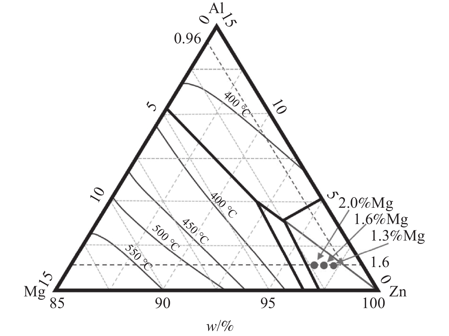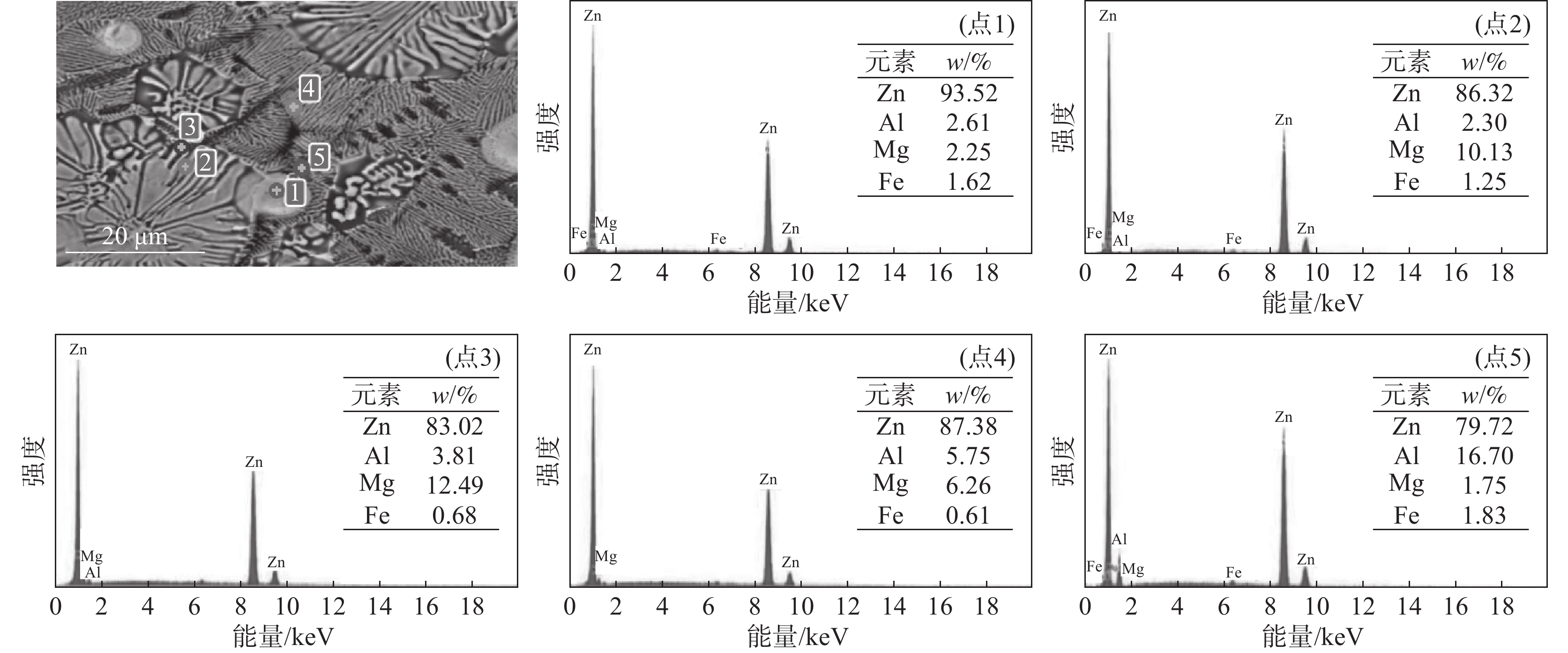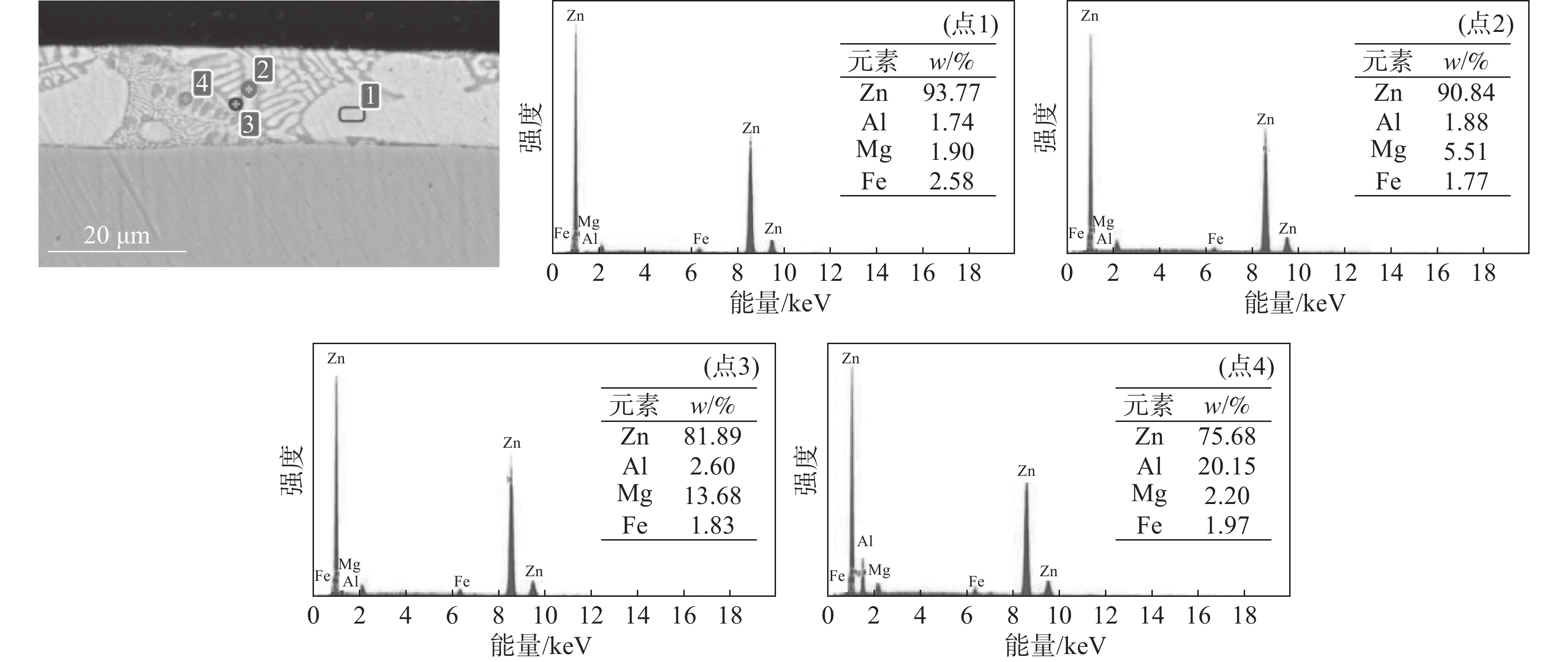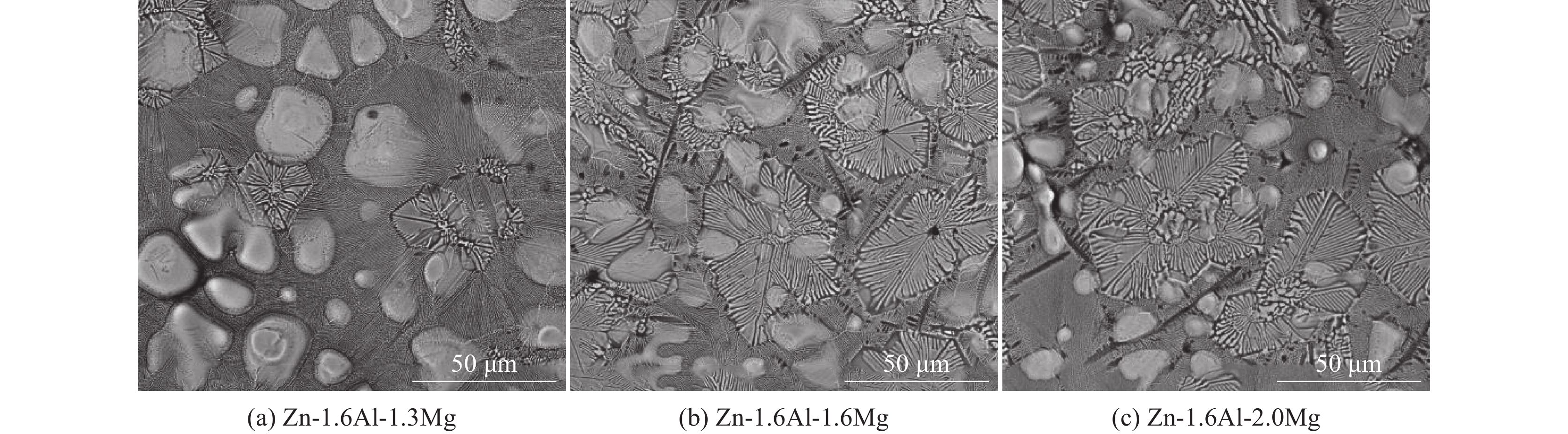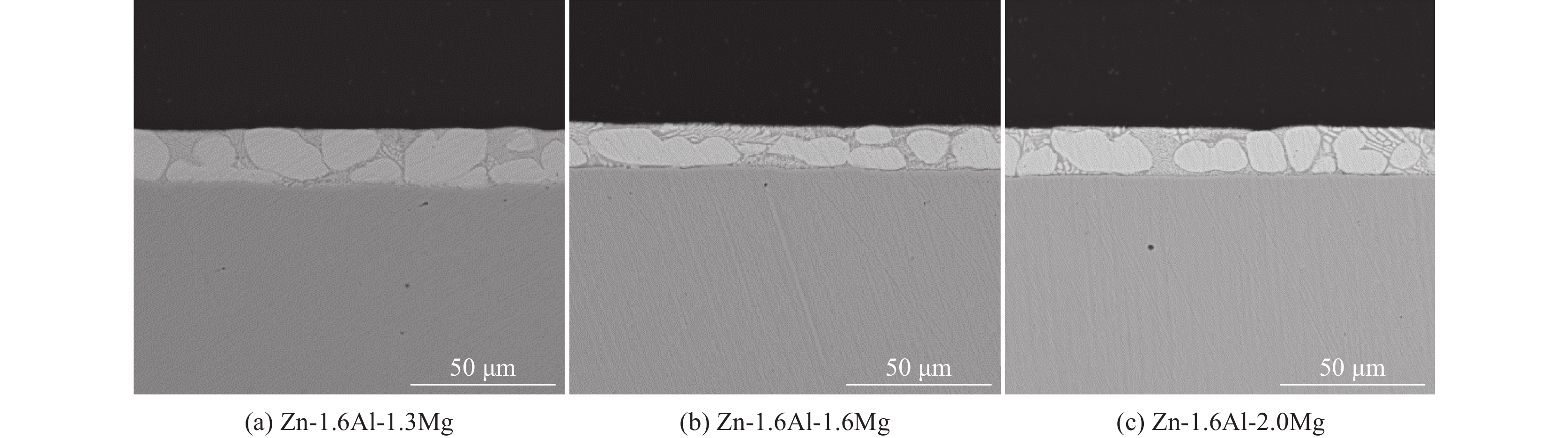 The Zn-1.6Al-xMg alloy coating steel sheets with different Mg content were prepared by hot dip galvanizing simulator, and the microstructure of coatings was analyzed using XRD, SEM and EDS. The results indicate that all the microstructures of Zn-1.6Al-xMg coatings are composed of massive Zn-rich phases, Zn/MgZn2 binary eutectic structures, fine Zn/Al/MgZn2 ternary eutectic structures, and a few dotted Al-rich phases. However, the volume fraction of Zn-rich phases and ternary eutectic structures decreases with the increase in Mg content of coatings, while the volume fraction of binary eutectic structures increases. Furthermore, the dotted Al-rich phases gradually transform to banded structure. As for the cross section, the microstructure of coatings shows that the ternary eutectic structure decreases, while the binary eutectic structure increases with the increasing Mg content.