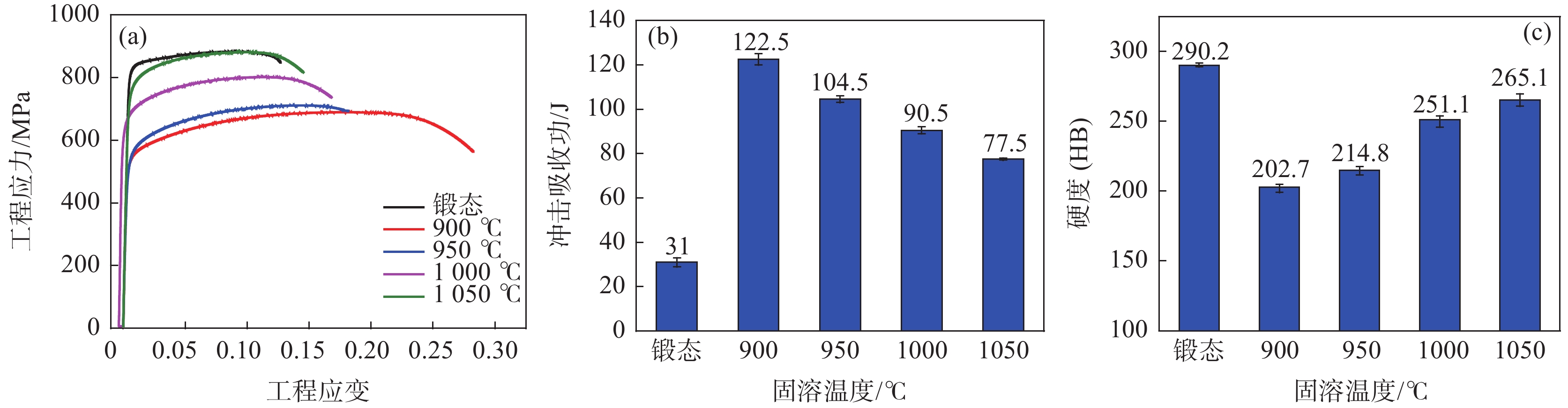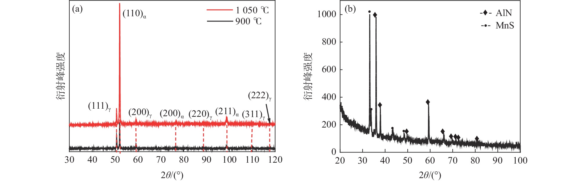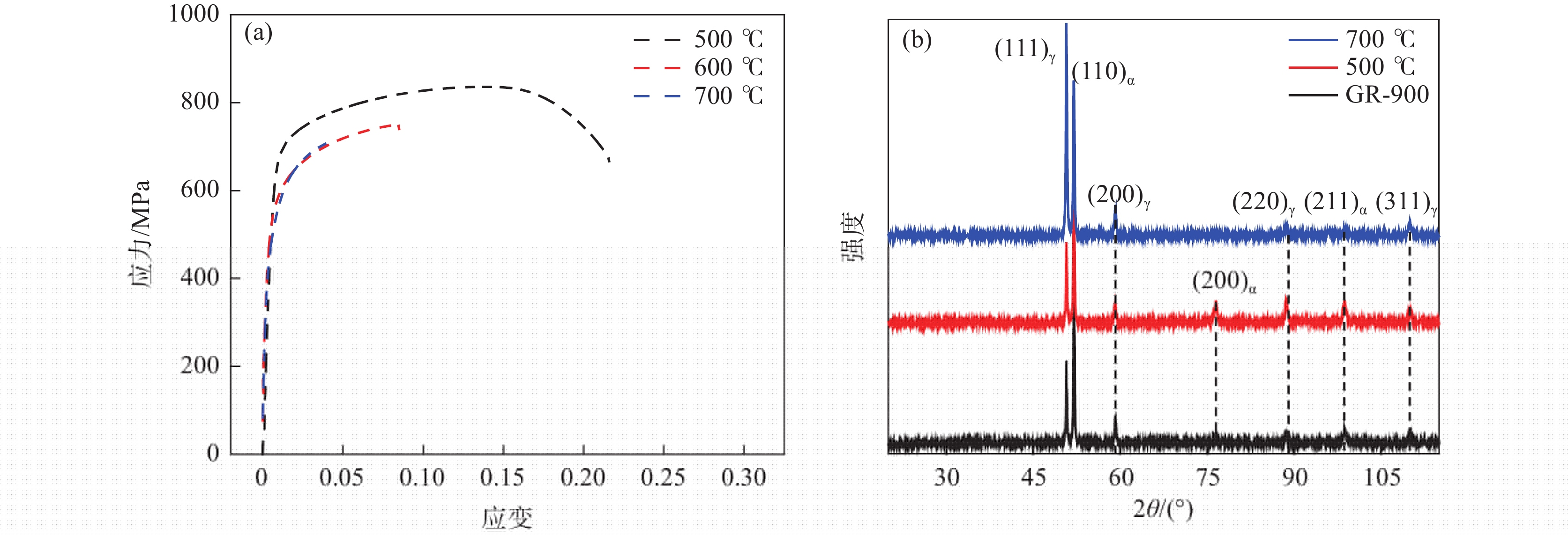 The properties of Fe-25Mn-18Cr-3.5Ni-2Al test steel under different heat treatment processes were tested by tensile, impact, and electrochemical methods. The SEM, EBSD, and XRD analysis showed that the volume fraction of the austenite phase decreased gradually with the increase of solid solution temperature. After solid solution at 900, 950 ℃, and 1000 ℃, the volume fraction of the austenite phase separated by EBSD decreased to 60.2%, 48.7%, and 20.0%, respectively. Austenite changes from a sharp fishbone shape to an isolated long needle shape distributed on the ferrite grain boundary. With the increase of ferrite phase content, the strength and hardness of the test steel increase, and the impact toughness decreases. After solution treatment at 900?1000 ℃, the ferrite phase content increases, and the orientation of (001)bcc decreases gradually. After tempering at 700 ℃, only α NiAl nanoparticles with dispersed distribution appear in the phase and show a brittle fracture. The polarization test shows that the pitting potential gradually moves forward with the increase of solution temperature. The sample treated at 1000 ℃ has a long passivation zone and secondary passivation in the 3.5% NaCl polarization test. Ecorr=?257 mV, Eb=?46.5 mV, has good corrosion resistance and mechanical properties and is recommended as the actual production heat treatment temperature.
