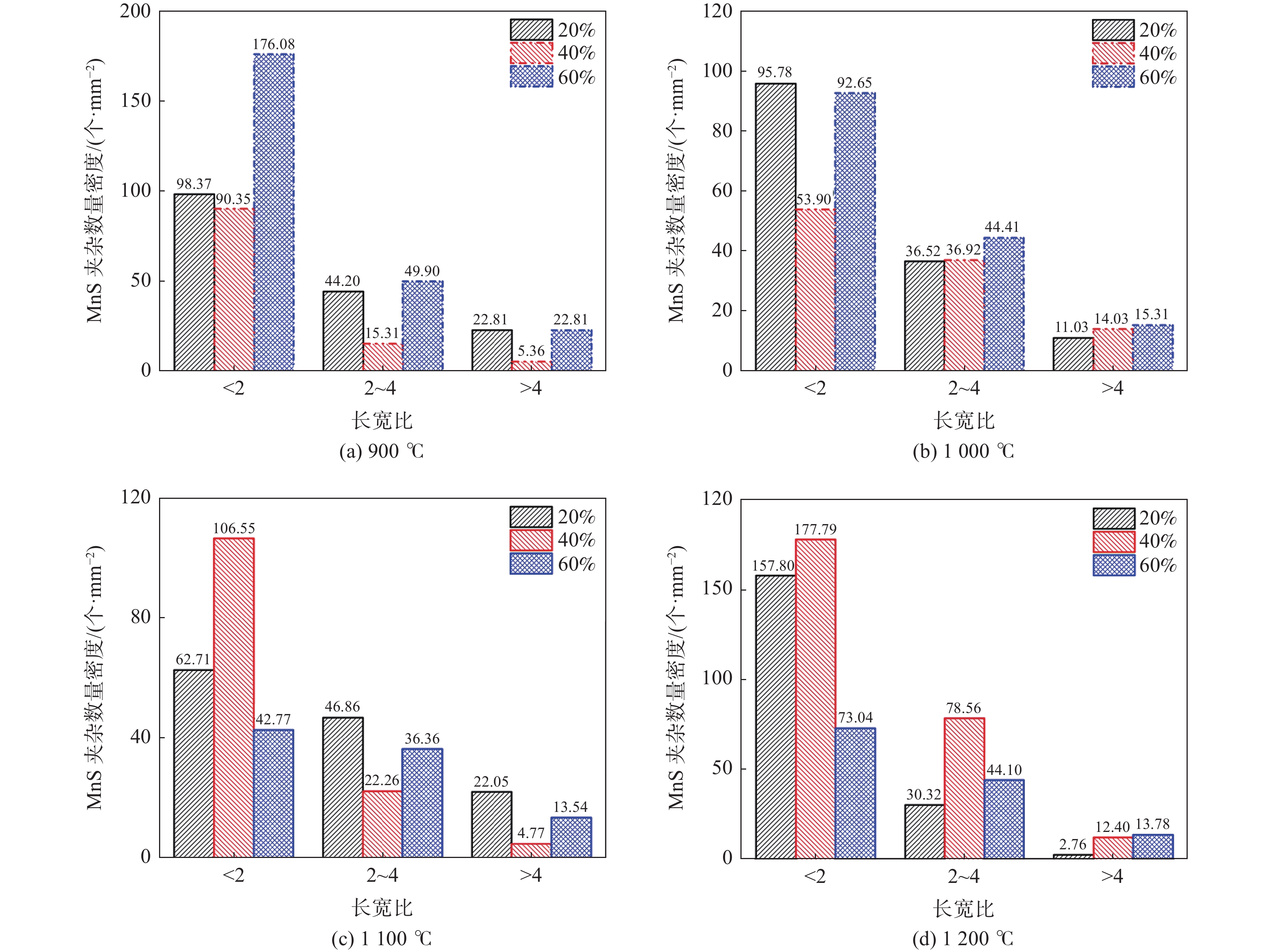A compression test was conducted via a Gleeble-1500 thermo-mechanical simulator. The effects of different deformation temperatures and deformation on the size and relative plasticity of MnS inclusions in steel were studied. It is found that fragmentation and growth of MnS occurred alternately during the deformation process, and the temperature and the deformation greatly influence the size of MnS. With the increase of deformation, the quantity of MnS with an aspect ratio of less than two decreases first and then increases. The relative plasticity shows a trend to decrease at low temperatures. Nevertheless, the quantity and relative plasticity of MnS changed oppositely when gear steel was deformed at high temperatures. Choosing large deformation at low temperature or small deformation at the high-temperature rolling system in actual production can obtain many MnS inclusions with a small aspect ratio.