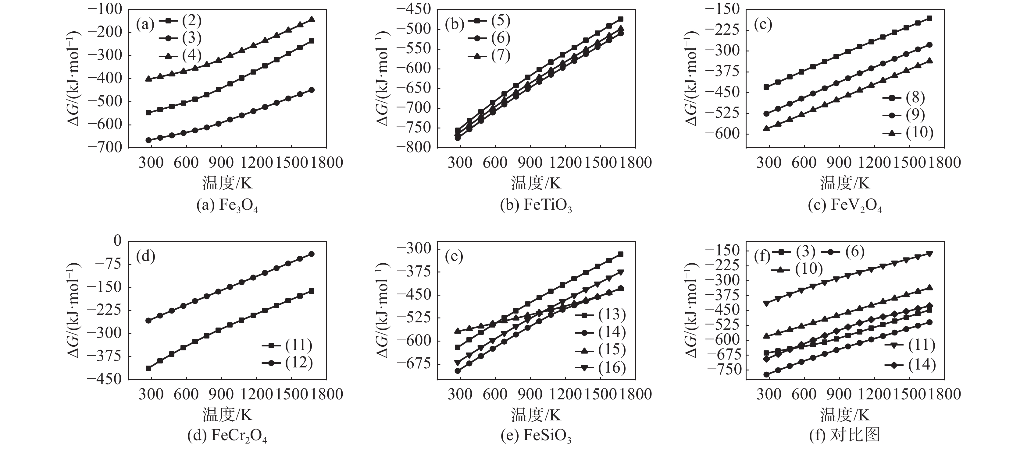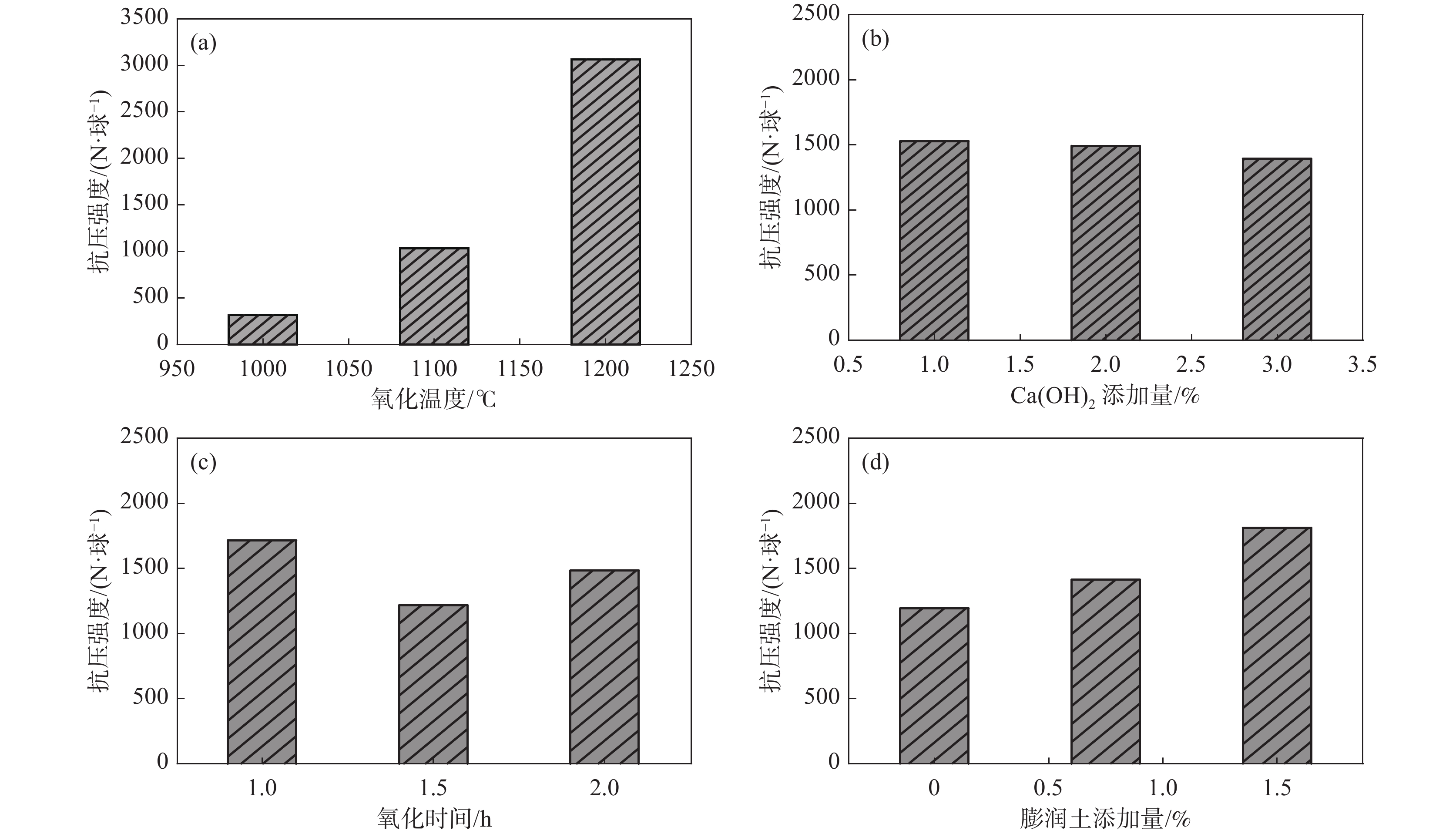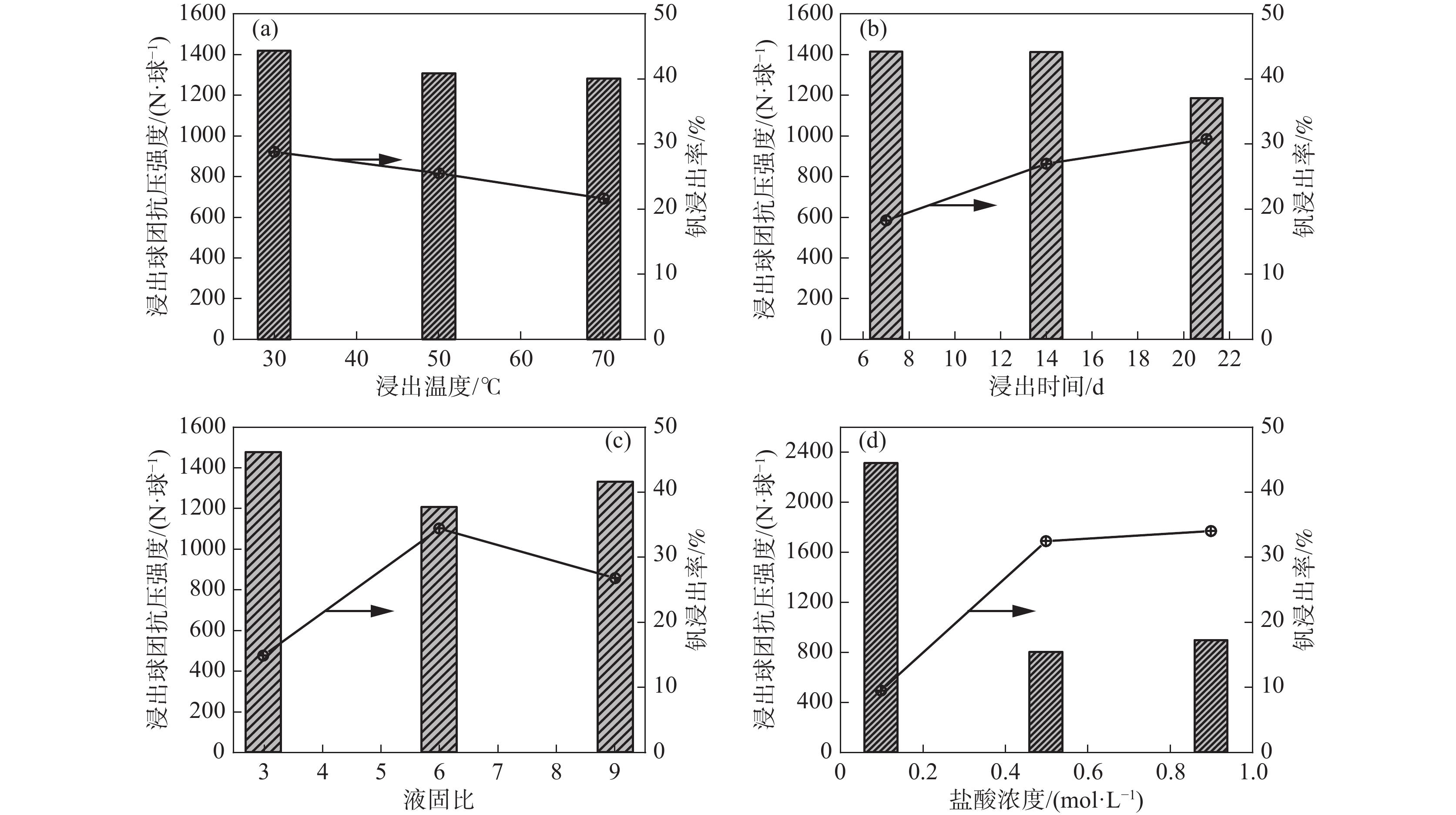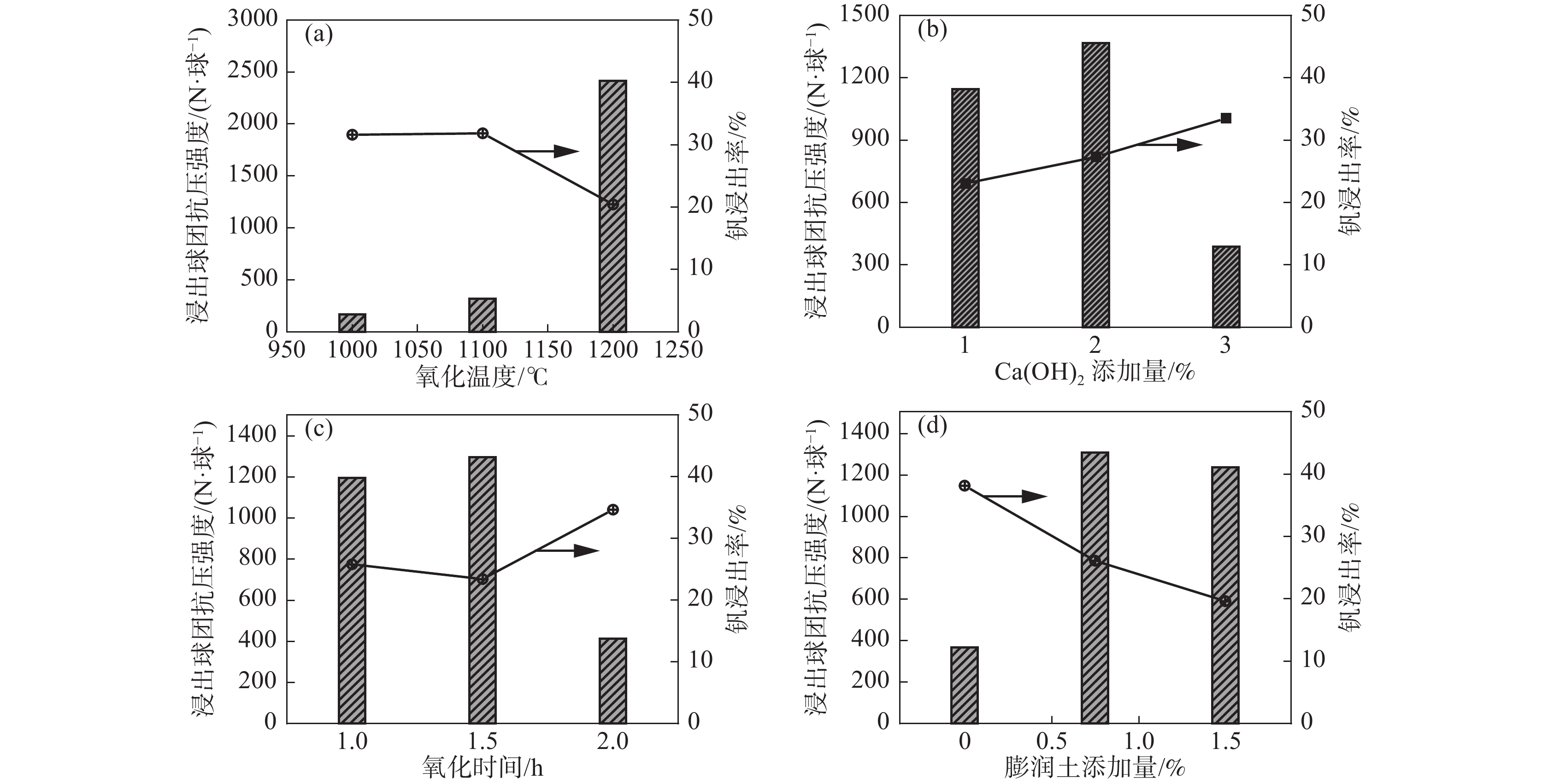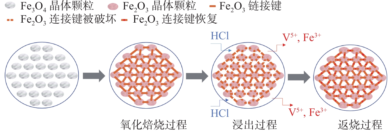 The relationship between crushing strength of pellets and leaching behaviors of vanadium in oxidation roasting-HCl leaching process from high-chromium vanadium-bearing titanomagnetite concentrates were investigated in this work. The results of the thermodynamic analysis of oxidizing roasting process show that the order of reaction of main compounds is: FeTiO3>Fe3O4>Fe2SiO4>FeV2O4>FeCr2O4. The phase analysis results of oxidation roasting process show that the oxidation reaction of the ilmenite is easier to magnetite, and the main phases of oxidation pellets are Fe2O3 and Fe9TiO15. Experimental results indicate that the oxidation temperature and HCl concentration are the key factors affecting the leaching efficiency of vanadium and the crushing strength of leached pellets in the oxidation process and leaching process respectively. There is an obvious negative correlation between the leaching efficiency of vanadium and the crushing strength of leached pellets. The crushing strength of leached pellets can be effectively increased by return roasting process. The crushing strength of pellets after return roasting is greater than 3 000 N/pellet under the condition of roasting temperature of 1 200 ℃ for 90 min, which can be used as raw materials for blast furnace ironmaking.