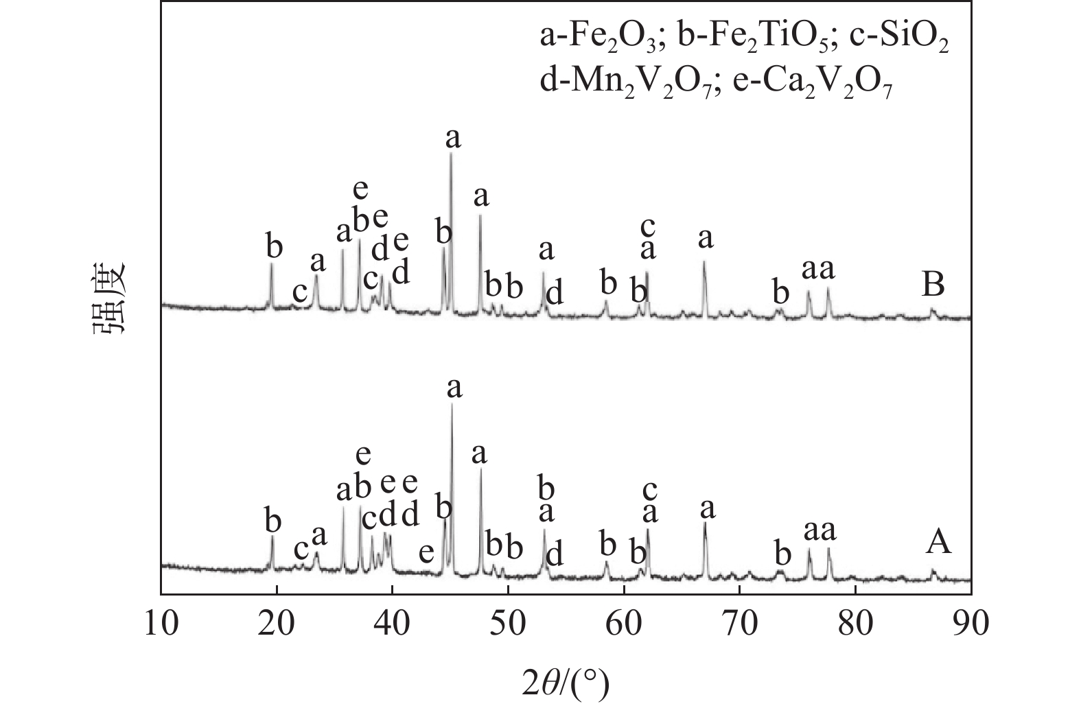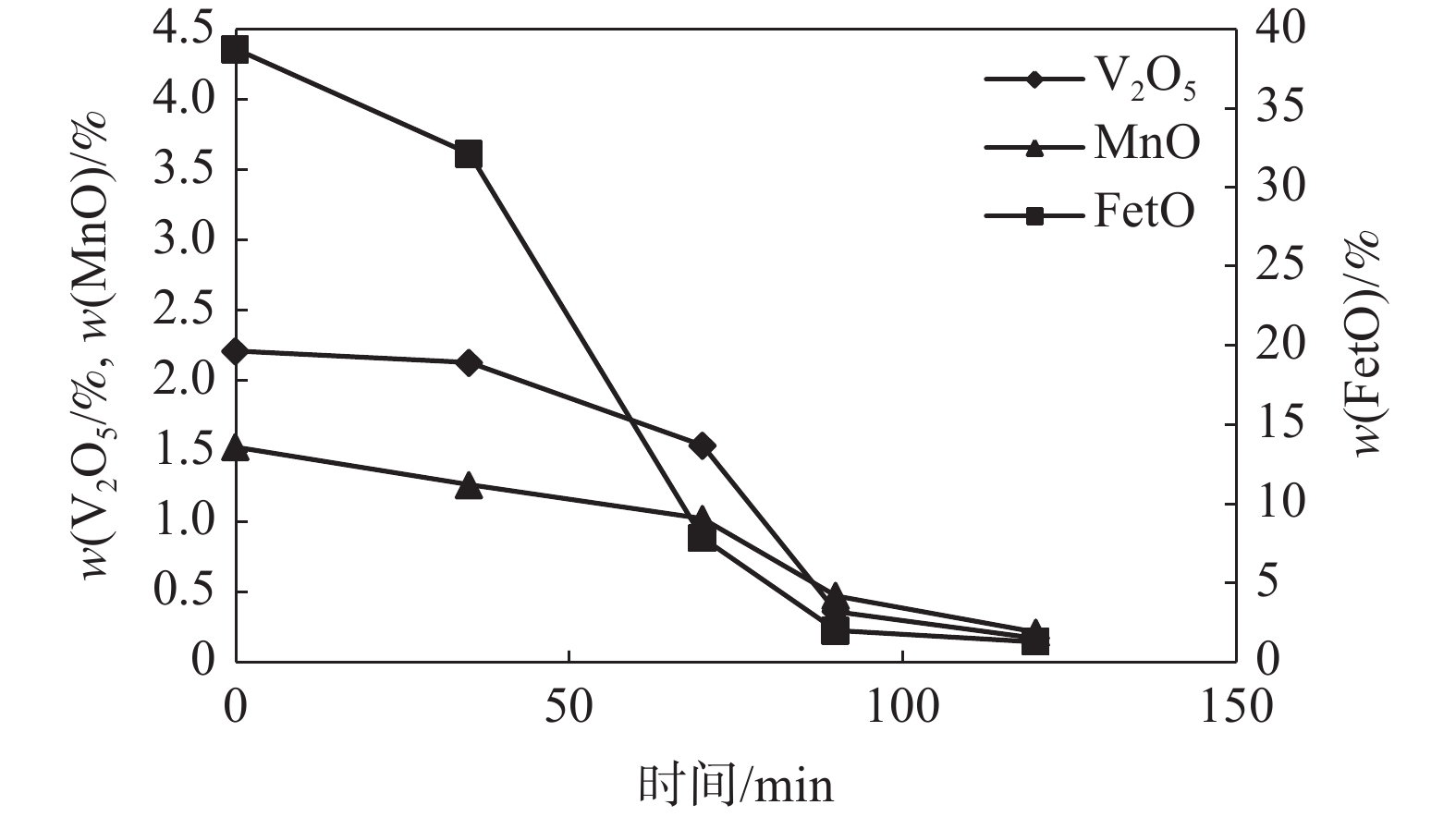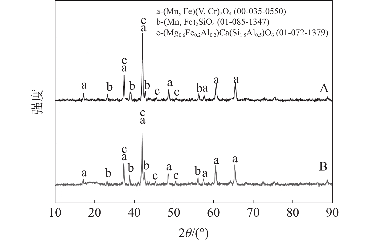 In this paper, two batches of vanadium slag with different Mn content were taken as the research object. XRD and SEM-EDS were used to explore the phase composition and microstructure of vanadium slag, and to find out the phase change of calcified roasted clinker with different Mn content and its effect on vanadium leaching rate. The results show that the vanadium slag is mainly composed of vanadium iron spinel, iron olivine and diopside. In a certain range, the small fluctuation of main components such as V, Mn and Fe in the slag does not affect the composition of the main phase of vanadium slag. Both roasting clinkers consist of Fe2O3, Fe2TiO5, silicate and vanadate. Of these phases, vanadate mainly refers to the double salt of Mn2V2O7 and Ca2V2O7, vanadium mainly occurs in this salt. The change of Mn content in vanadium slag has no obvious effect on the clinker phase composition. Mn can promote the roasting-leaching effect of calcified vanadium extraction under the same roasting-leaching conditions and low calcium-vanadium ratio. The leaching rates of vanadium from roasted clinkers with MnO content of 6.98% and 8.26% are 93.66% and 94.51%, respectively.