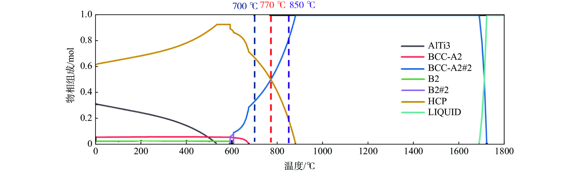 A novel two-phase titanium alloy of Ti84Al11FeMo4 was designed based on d-electron theory and the phase composition as a function of temperature was analyzed. Combined with the thermodynamic calculation results, the evolution relationship between the microstructure and mechanical properties of titanium alloys at different aging temperatures of 700 ℃, 770 ℃ and 850 ℃ was studied, respectively. The results show that the amount of β phase in the microstructure of Ti84Al11FeMo4 titanium alloy gradually increases with the increase of aging temperature. When the aging temperature is increased to 850 ℃, the amount of β precipitates reaches the maximum, and a large number of small-sized β phases are distributed among the coarse β phases. Ti84Al11FeMo4 titanium alloy exhibits different mechanical properties after aging treatment at different temperatures. The compressive strength of titanium alloy could be significantly improved after aging at 700 ℃ and 770 ℃, while the high strength and ductility could be simultaneously obtained after aging at 850 ℃.