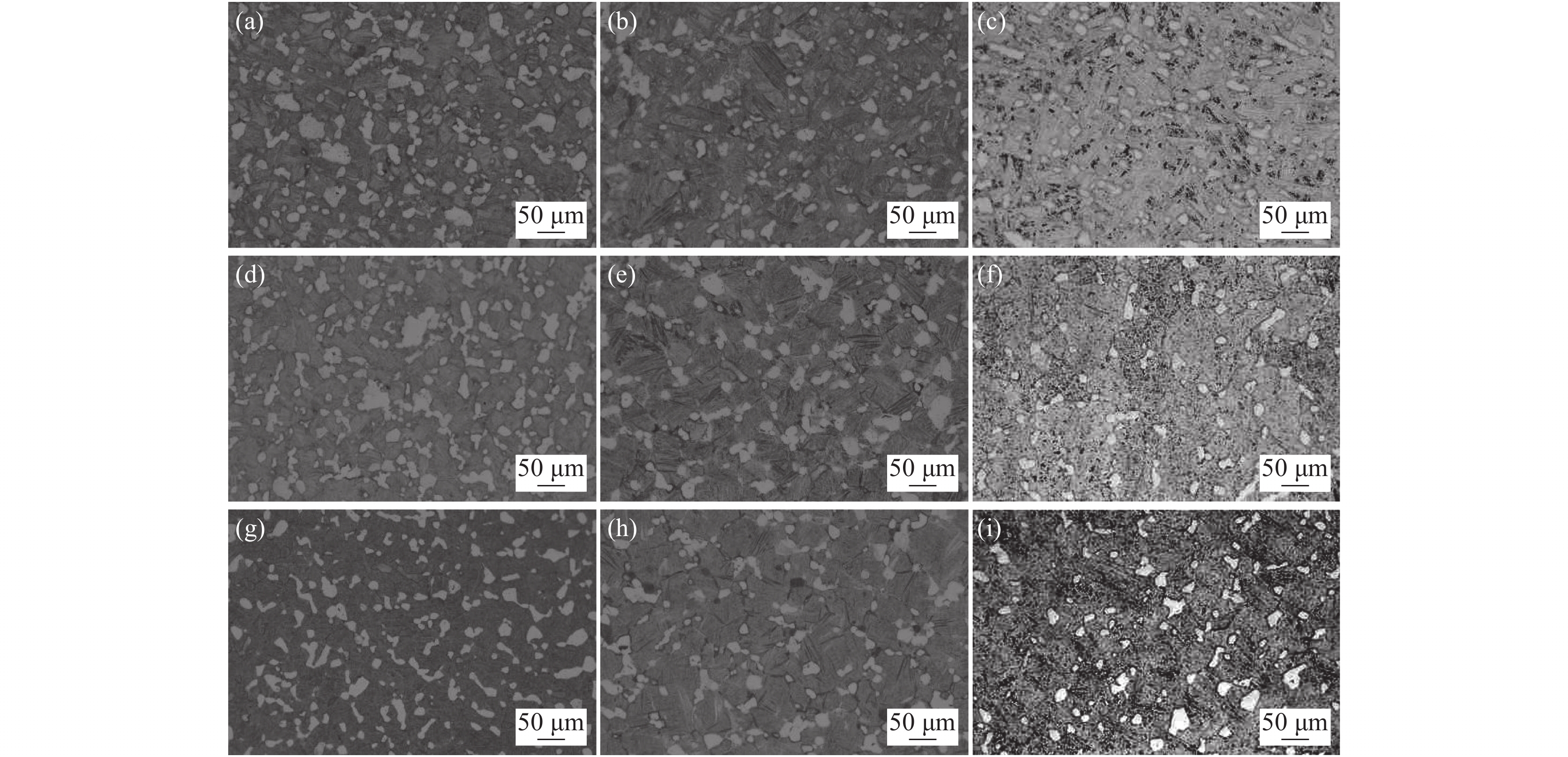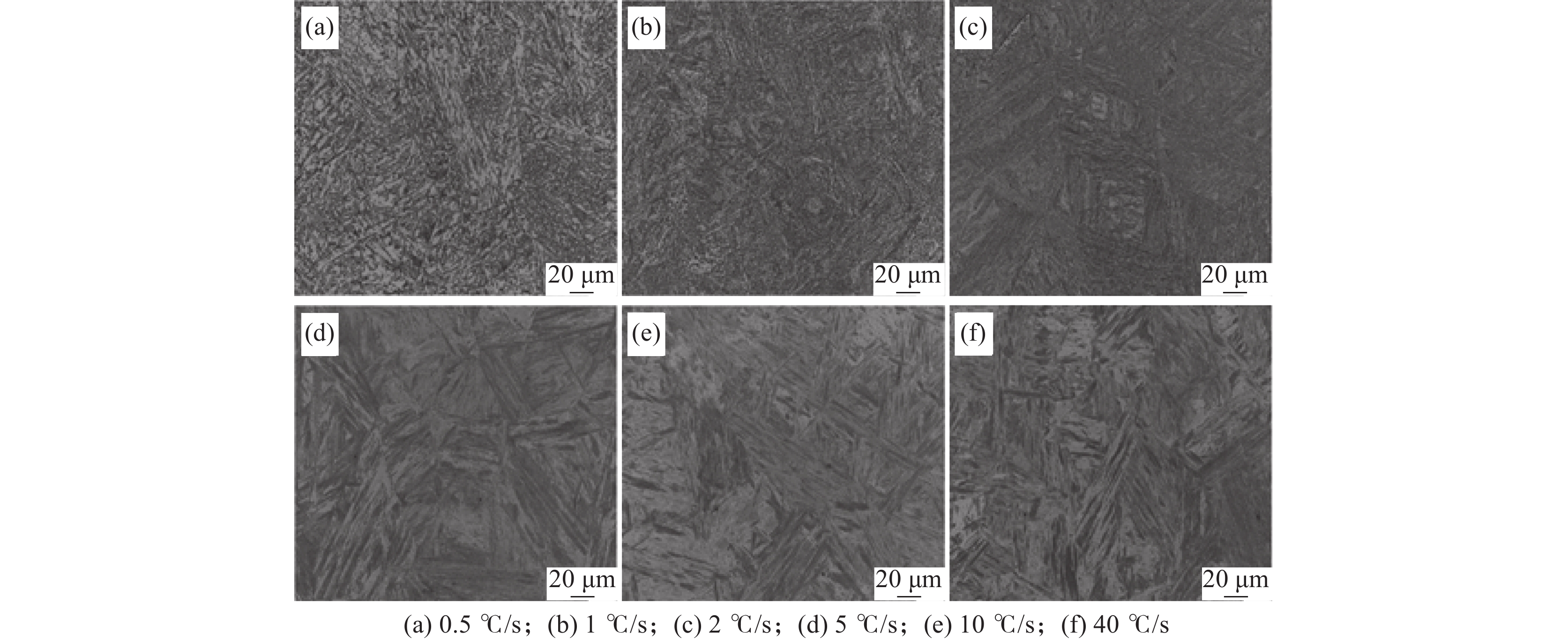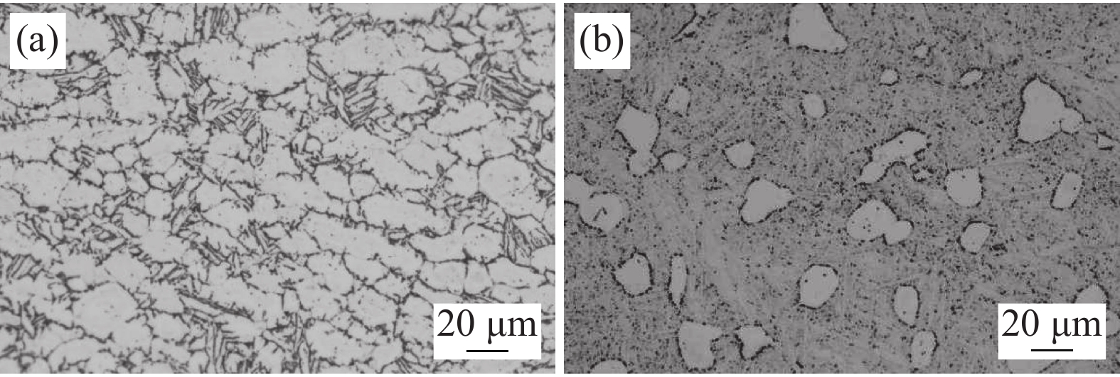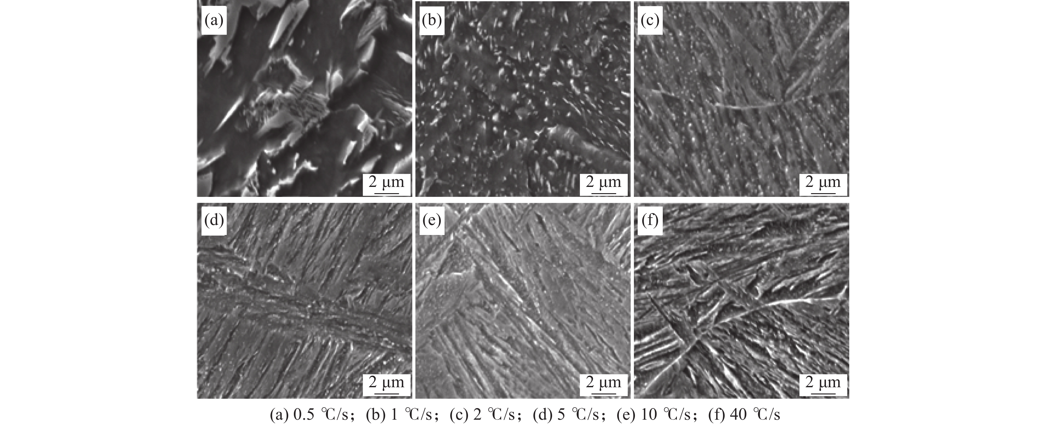 Transformation behavior of Cr-Mo-Ni-B ultra-high strength steel for construction machinery under continuous cooling condition was studied by means of MMS-200 thermomechanical simulator. The effect of cooling rate (0.5~40 ℃/s) on its transformation temperature and microstructure was analyzed by thermal dilatometry curves, optical microscopy (OM) and scanning electron microscopy (SEM). The results show that transformation temperatures of Bs, Bf, Ms and Mf decrease and phase transformation at medium and low temperature is promoted with the increase of cooling rate. As the cooling rate is below 2 ℃/s, pearlite and bainite transformations occur. Mixture microstructure of granular bainite and lath martensite is observed when cooling rate is in range of 2 ℃/s and 5 ℃/s. As the cooling rate is above 5 ℃/s, granular bainite disappears and fully martensitic microstructure is obtained. In the formation temperature range of medium and low temperature transformation microstructure, the morphology, size and quantity of M/A islands as well as width of martensite lath are influenced significantly by cooling rate. With the increase of cooling rate, the morphology of M/A islands is modified from blocky shape into granular shape, their size decreases and the volume amount increases. The average width of the martensite lath decreases as a result of increasing the cooling rate.