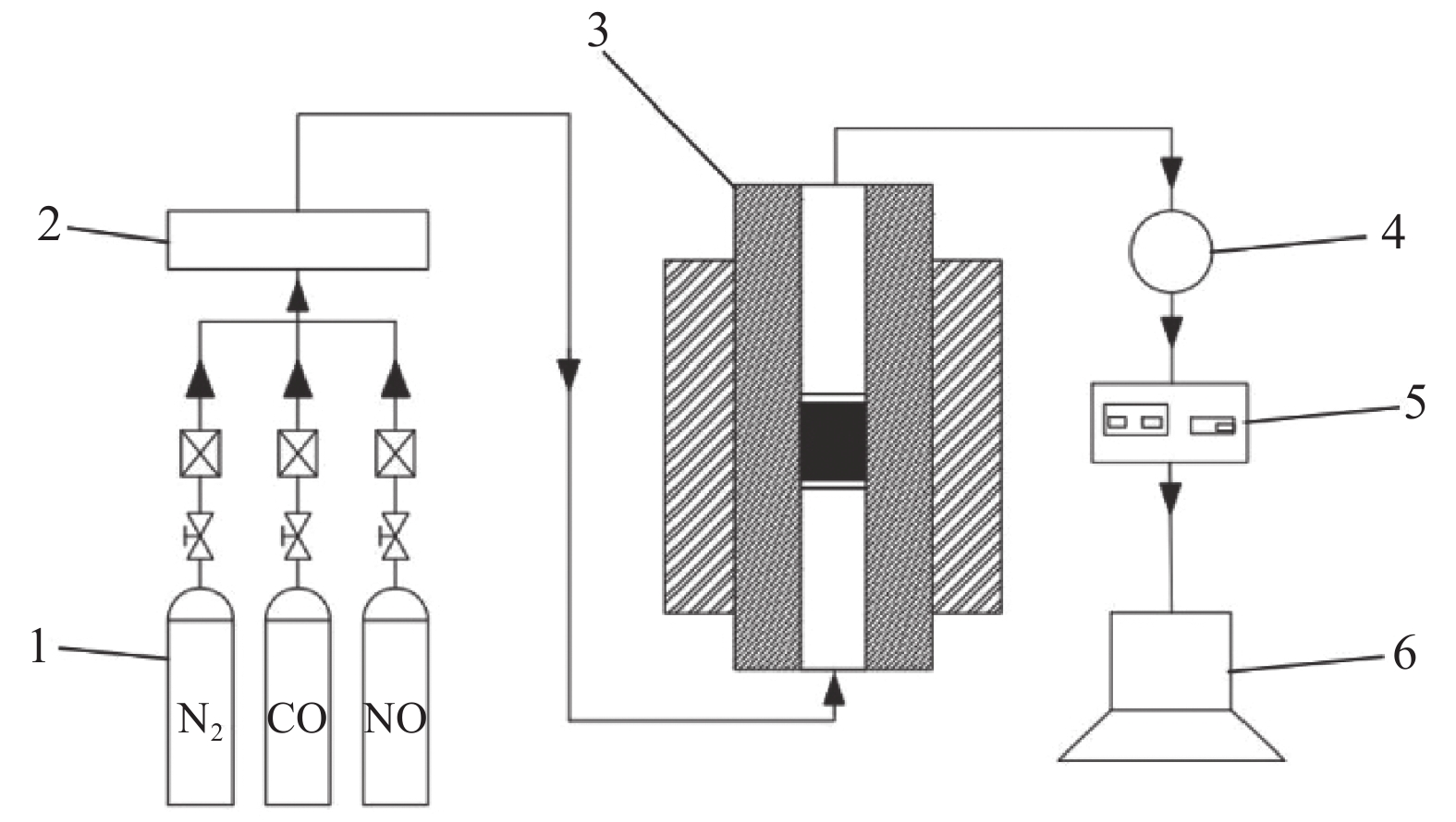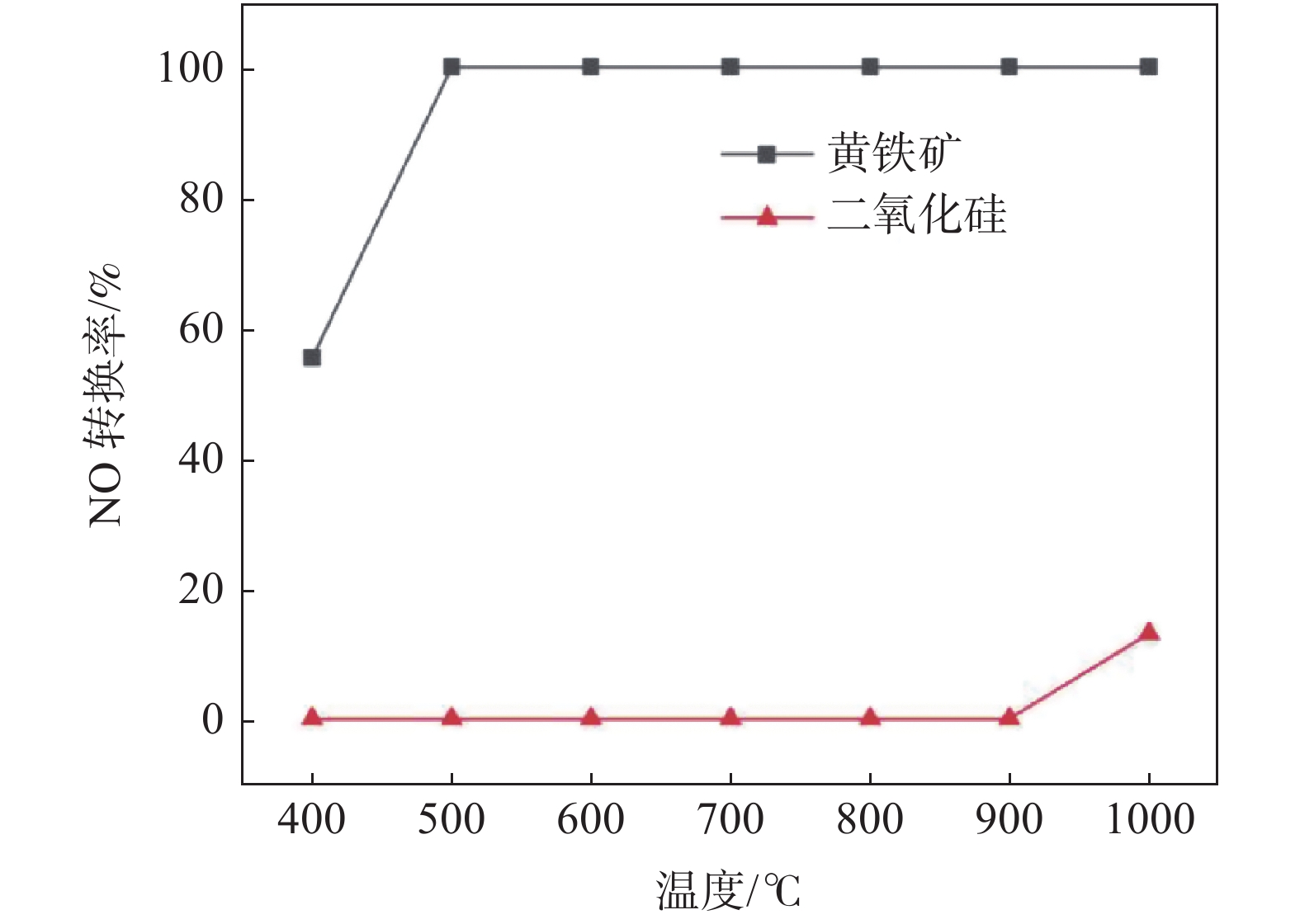 Pyrite was used as denitrification catalyst to investigate the performance in catalytic CO reduction of NO. XRF, XRD, SEM-EDS and H2-TPR are used for characterization. The results showed that the NO conversion for pyrite was 78.53% at 400 ℃ and remained constant at 100% in the temperature range of 500~800 ℃. It shows excellent NO reduction performance and also possesses very high N2 selectivity and good CO conversion. The surface of pyrite becomes rough and porous as it decomposes and releases SO2 during the catalytic reaction. The catalytic substance in pyrite is FeS2, and its catalytic reduction of NO by CO follows the redox reaction mechanism. In the reaction process, CO is assisted by S to reduce NO, and the presence of S facilitates the adsorption and reduction of NO gas on the catalyst surface, making pyrite highly catalytic.
