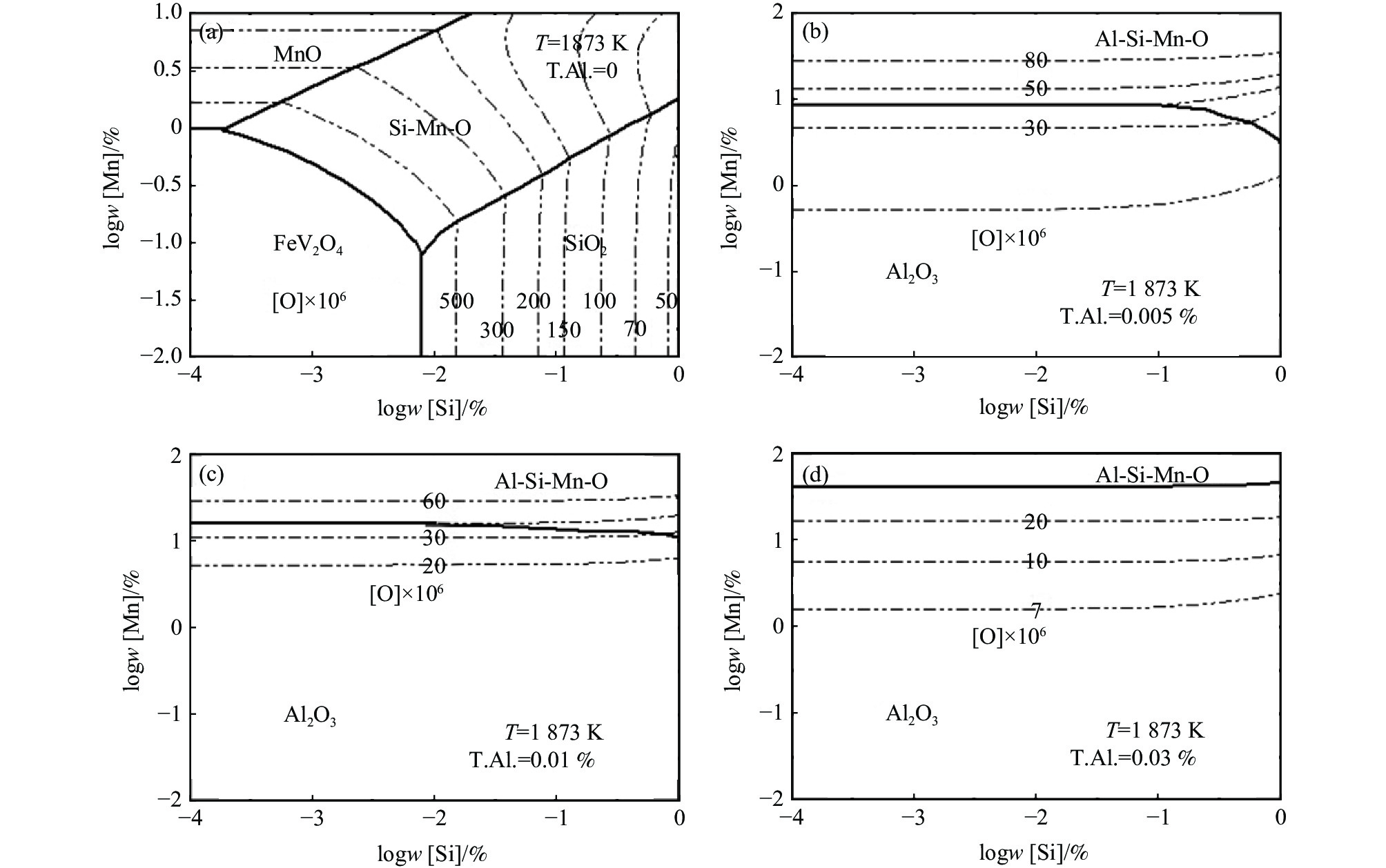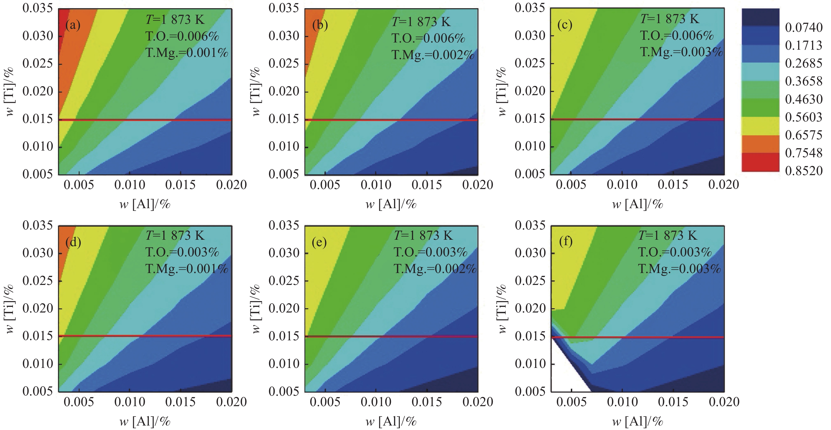 The oxide metallurgy technology with the low aluminum condition is carried out in marine steel and further expands the adjustment range of alloy compositions, which is beneficial to promote the effective inclusion of inducing acicular ferrite. This research has a significant potential application to improve the toughness of heat-affected zones in high-heat input welding. Thermodynamic equilibrium calculations between liquid steel and inclusion are based on EH420 steel using FactSage software. The effects of coupling changes of the Mg-Al-Ti deoxidation system and oxygen content on the types, conditions, and amounts of inclusions precipitated in steel were systematically analyzed. Equilibrium experiments are designed to confirm the validity of thermodynamic calculations. This study provides theoretical guidance to control inclusion in high heat input welding for EH420 marine steel. The results recommended controlling the Mg, Al, and Ti in steel are 0.0020%, 0.0080%~0.010%, and 0.010%~0.020%, respectively. On this basis, Mg-Al-Ti-O composite inclusion + MgO inclusion are formed when the content of T.O. is 0.0030%. The composite inclusion of Mg-Al-Ti-O is formed separately, with the T.O. content at 0.0060%.