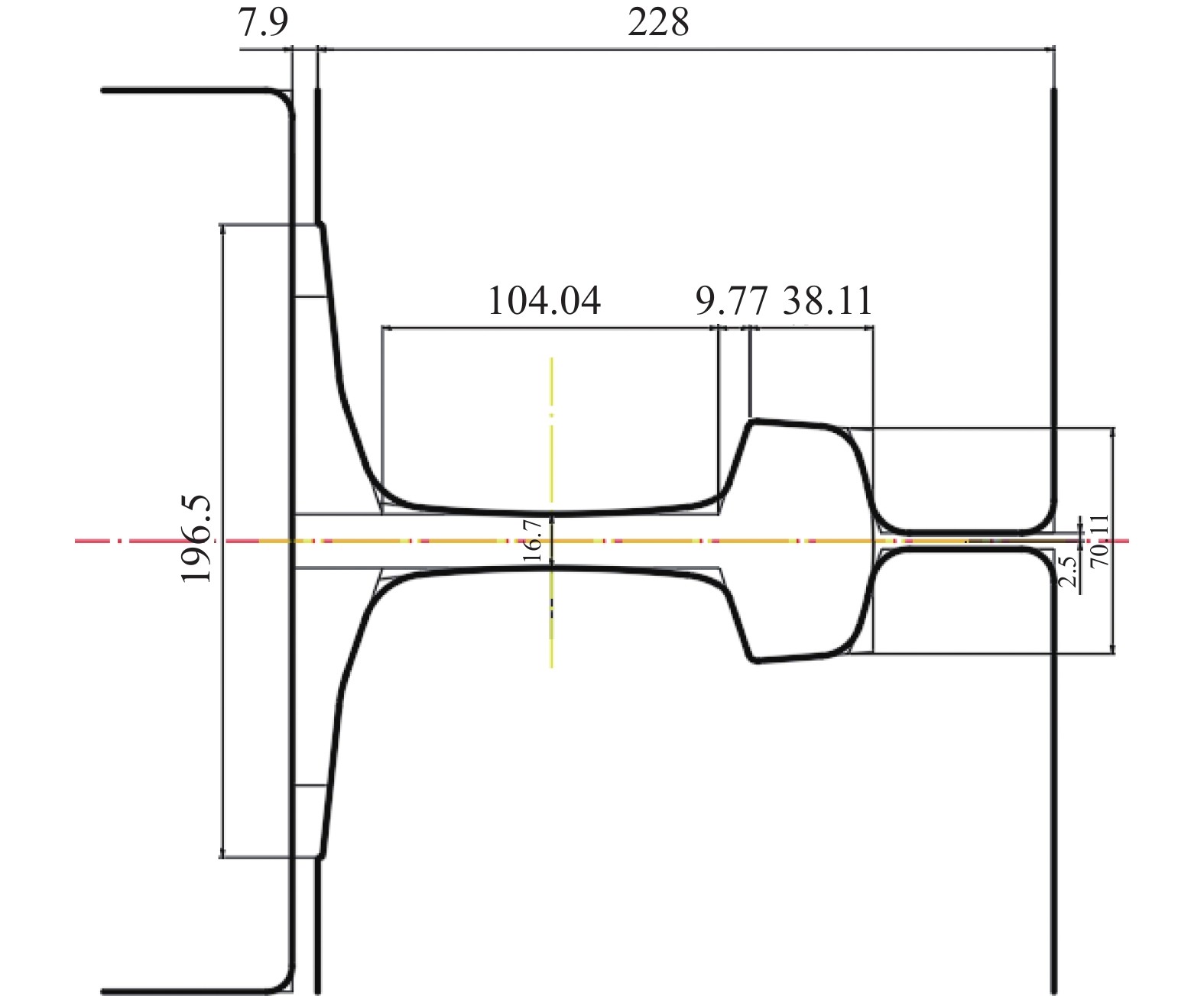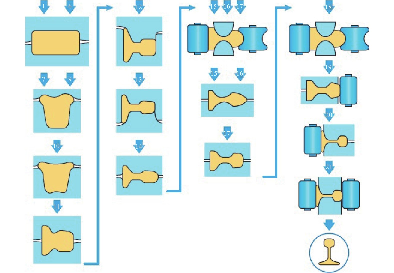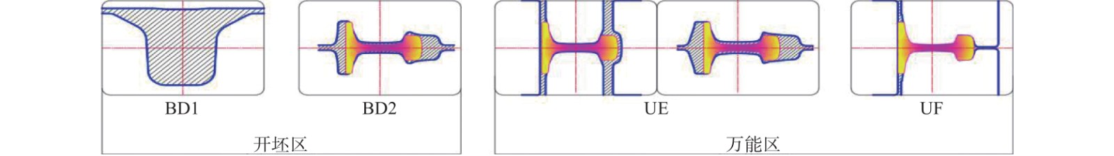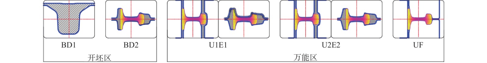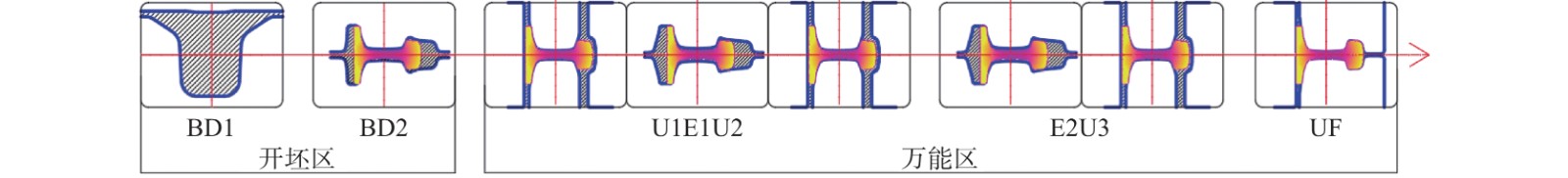 Combined with practical production experience, taking the rail products of seven racks universal production line as an example, this paper studies and deduces the pass design method of the universal zone. According to the finished product size, each pass's elongation coefficient, the local size deformation relationship of each pass, the cross-sectional area, and the elongation coefficient of each pass are inversely calculated. On this basis, combined with the pass design experience, the structural shape and pass the size of each pass are determined. The field application for more than ten years shows that the research results can fully meet the efficient development of high-precision rail and have the characteristics of reducing the number of trial and error of pass design, high design efficiency, high product yield, and high dimensional accuracy and low production accident rate.