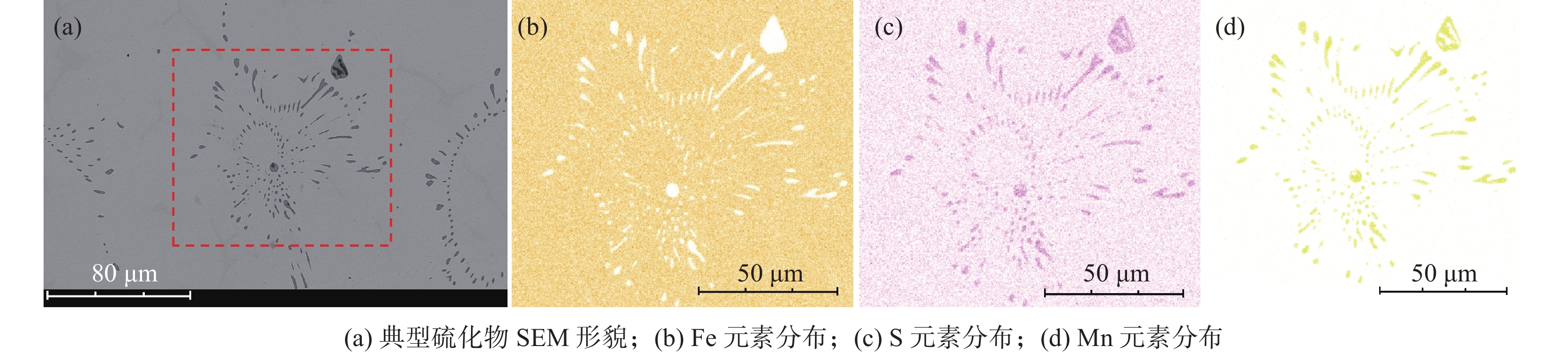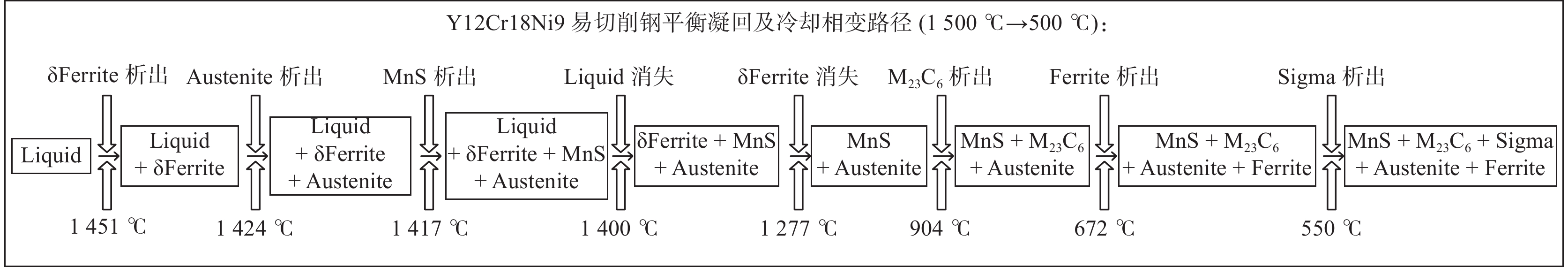 The as-cast structure and mechanical properties of Y12Cr18Ni9 free-cutting steel were studied by means of thermodynamic calculation software FactSage, SEM and Phenom Partical X SEM-EDS. The results show that the main equilibrium phases in Y12Cr18Ni9 free-cutting steel are Liquid, MnS, δFerrite, Austenite, M23C6, Ferrite and Sigma. The equilibrium phase transition path is as follows: Liquid→Liquid+δFerrite→Liquid+δFerrite+Austenite→Liquid+δFerrite+MnS+Austenite→δFerrite+MnS+Austenite→MnS+Austenite→MnS+M23C6+Austenite→MnS+M23C6+Austenite+Ferrite→MnS+M23C6+Sigma+Austenite+Ferrite. The sulfides in the test steel are spherical, ellipsoidal, spindle shape or short-bar-like, and distributed in clusters along the grain boundary, belonging to a type II sulfide. The proportion of sulfides with length-width ratio≤3 reaches 94.75%, the proportion of sulfides with size ≤3 μm is 80.22%, and the proportion of sulfides with maximum chord length ≤3 μm is 76.02%. The cluster sulfides affect the mechanical properties of Y12Cr18Ni9 free cutting steel. The cluster sulfides distributed along the grain boundary is the main reason for the formation of quasi cleavage surface. The tensile strength, yield strength, elongation after fracture, reduction of area and impact toughness of the steel are 597 MPa, 233 MPa, 17.7%, 19.5% and 21.8 J, respectively.