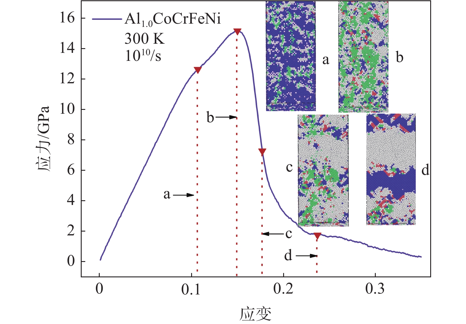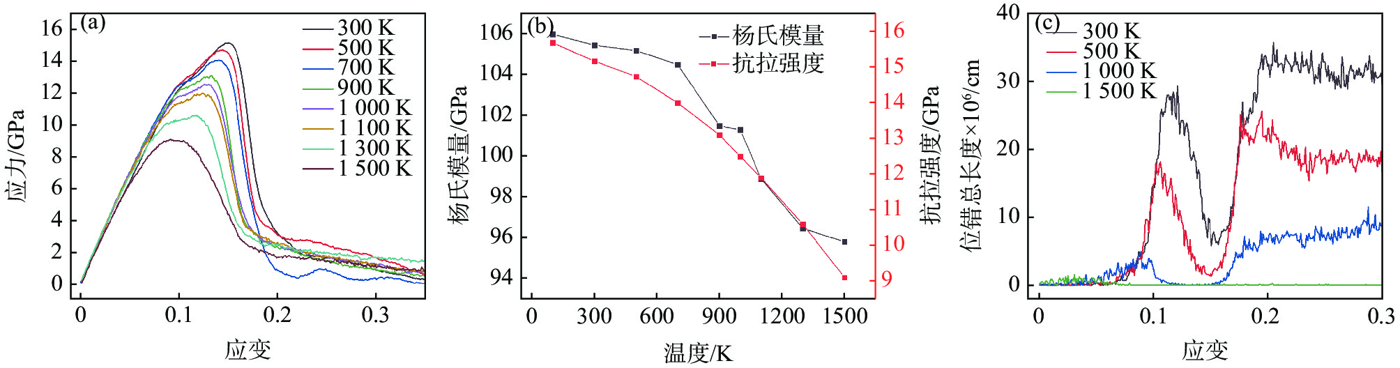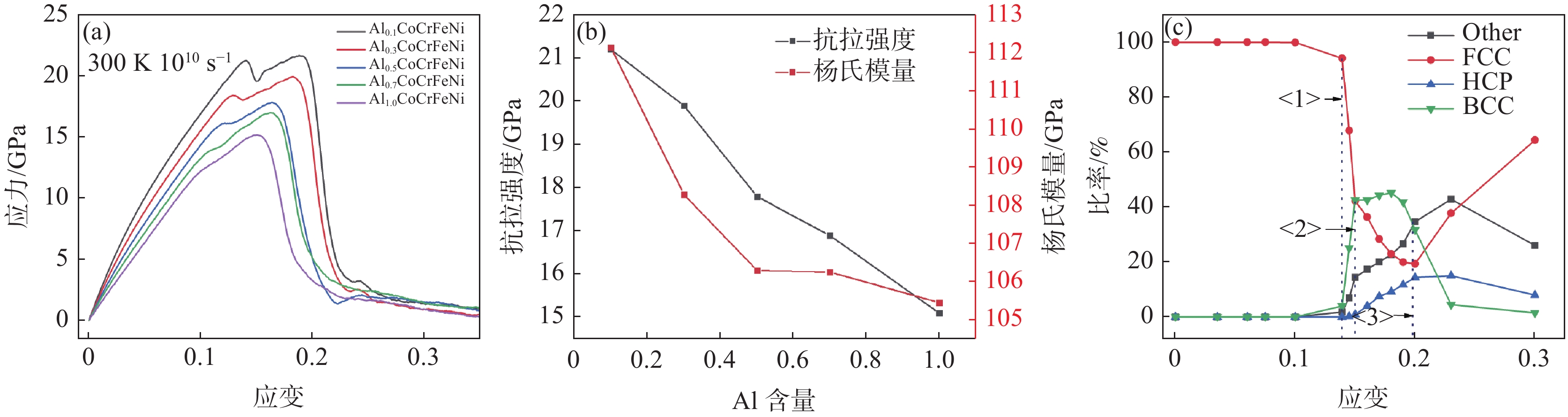 In this paper, the molecular dynamics method studied the microstructural evolution, deformation mechanism, and mechanical properties of AlxCoCrFeNi high entropy alloy (HEAs) under uniaxial tension. The effects of Al content, high temperature, and high strain rate on the mechanical properties of AlxCoCrFeNi at 0.1 to 1.0 molar ratio were investigated. The results show that when the molar ratio of Al is 0.1 to 1.0, the yield strain and stress at room temperature (300 K) decrease with the Al content and temperature increase. With the increase of Al content, HEAS will begin to yield at a minor strain and enter the yield stage earlier, which makes HEAS easier to deform and reduce the mechanical properties. At 300 ? 1500 K, with the increase in temperature, the dislocations gradually decrease, the interaction between different dislocations is weakened, and the fixed dislocations cannot be formed, which hinders the movement of materials and leads to the decline of material strength. AlxCoCrFeNi yield strain and yield stress are positively correlated with the change of strain rate, and the yield stress is sensitive to high strain rate.