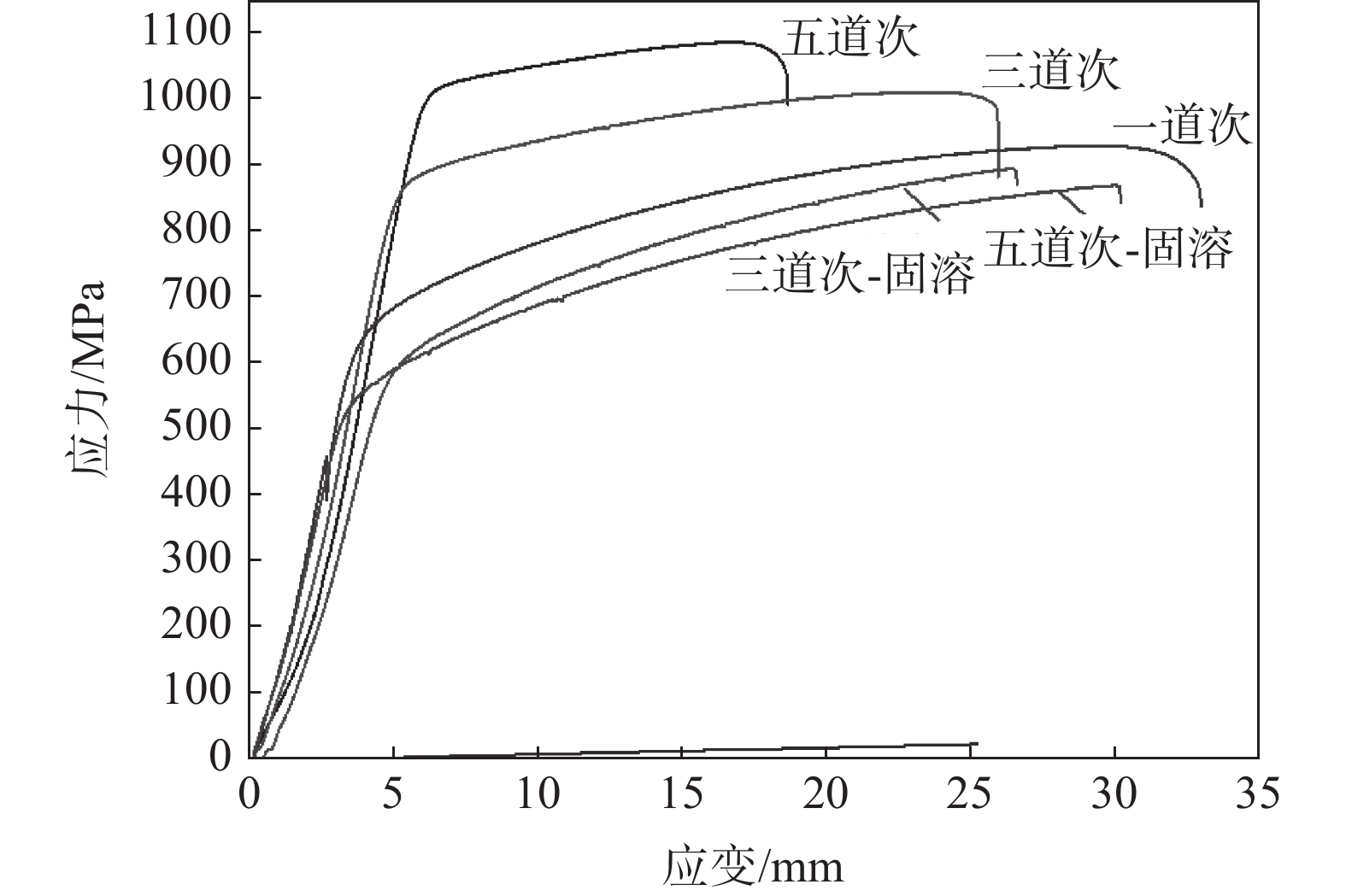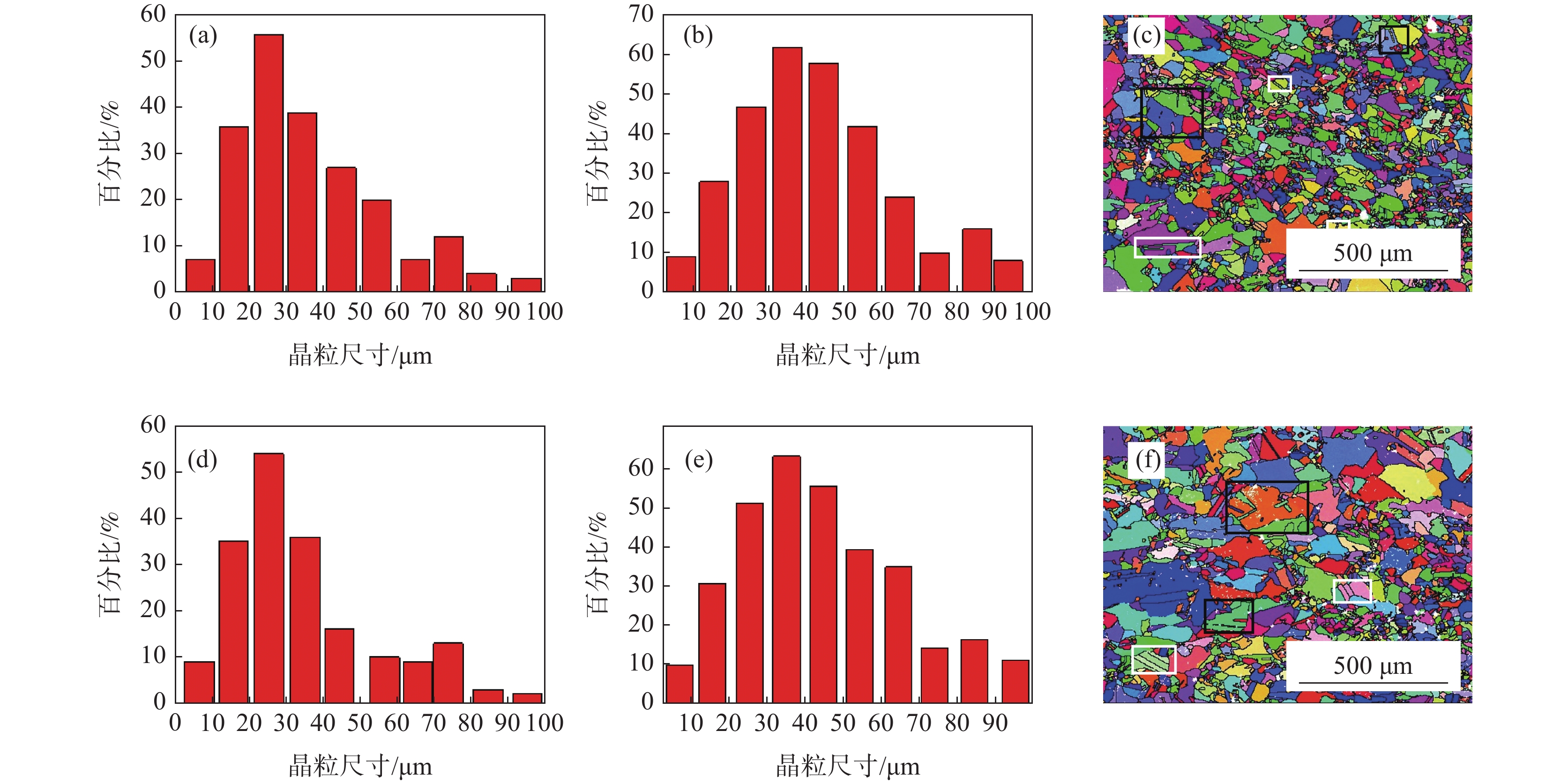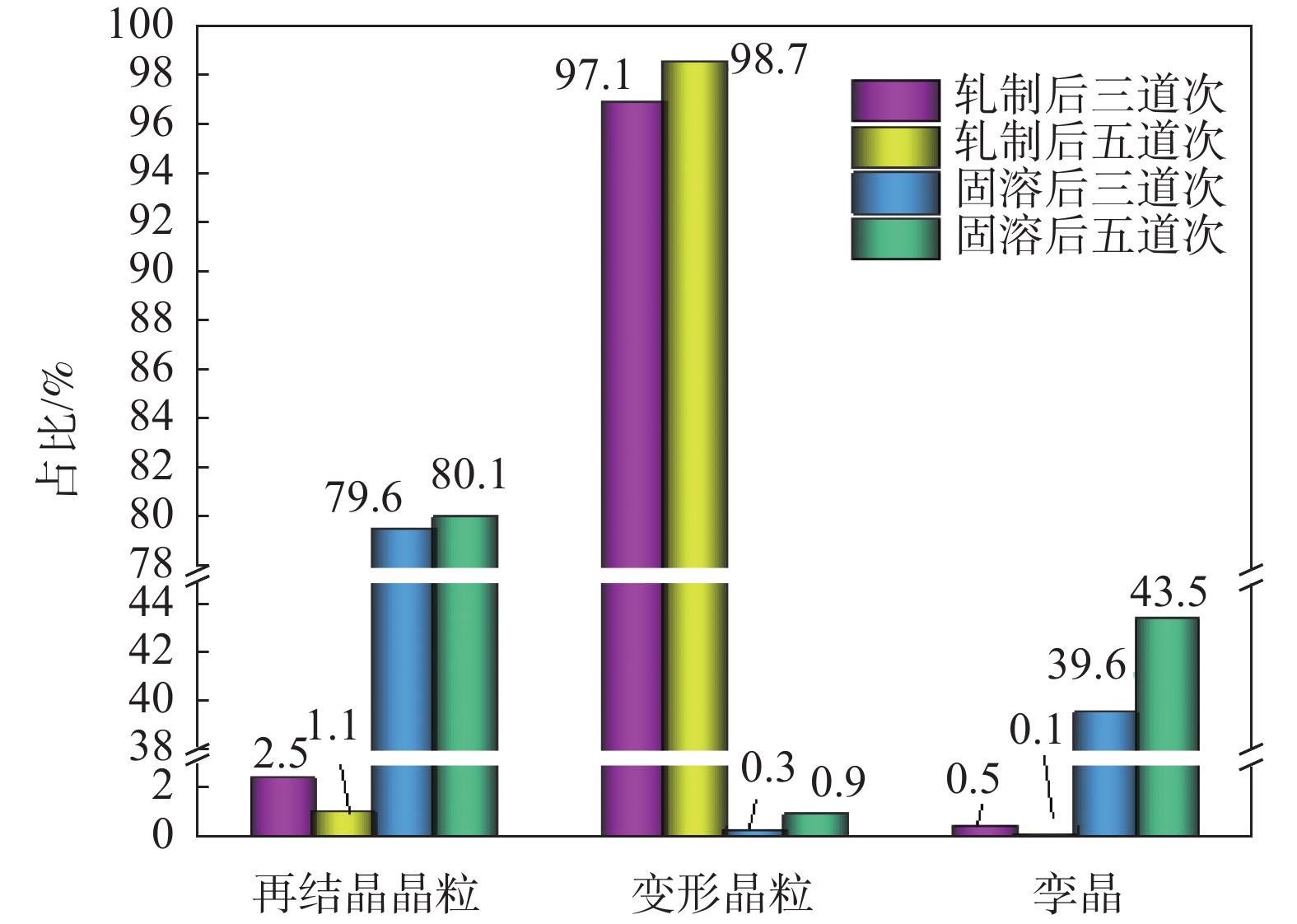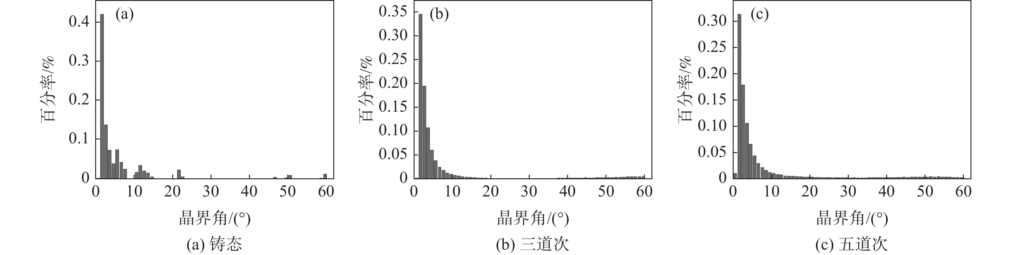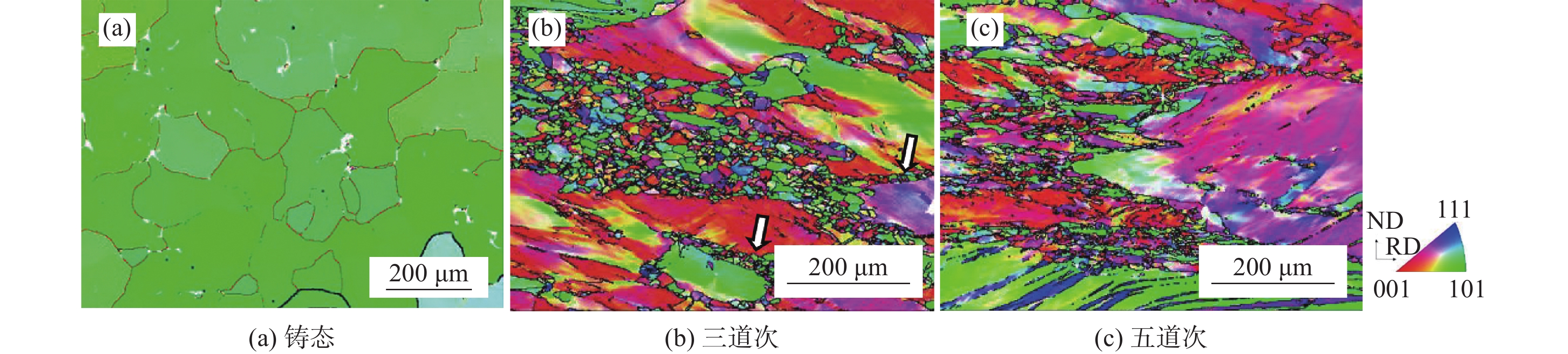 Mn18Cr18N electro-slag remelting steel was rolled in three or five passes and subject to solid solution treatment. The microstructure observation by electron back scattering diffraction (EBSD) indicates that with the increase of rolling passes, the recrystallized grains grow along the grain boundaries and distributes into a chain structure, and the high angle grain boundaries gradually migrate to the small angle grain boundaries and then stabilize. A large number of shear deformation bands appear. A larger single pass deformation or a higher final rolling temperature is beneficial to the recrystallization of Mn18Cr18N as-cast austenitic stainless steel after rolling. After solid solution treatment,the grain becomes fine due to increasing annealing twin grain and static recrystallization. With the increase of rolling passes, the tensile strength is increased from 950 MPa to 1090 MPa, and elongation after fracture decreases from 43.46% to 29.55%. After the solid solution treatment, the tensile strength decreases from 904 MPa for 3-passes to 870 MPa for 5-passes, with the strength decreasing; and the elongation after fracture increases from 42% to 48% accordingly. The results showes that the solid solution treatment can improve the microstructure and properties of the material.