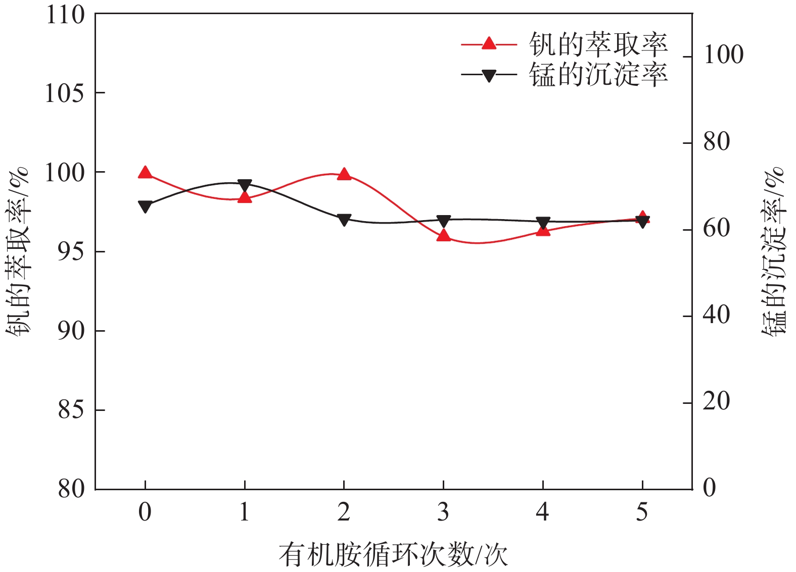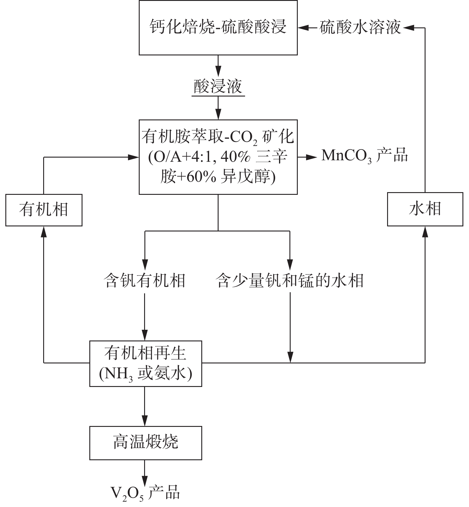 The efficient separation of vanadium and manganese from an acid leachate of the calcification roasting vanadium slag is quite difficult and costly, particularly for those leachates with high vanadium and manganese concentrations. A novel process was investigated for the separation of vanadium and manganese using trioctylamine and CO2. The chemical separation basic of V and Mn was discussed. The distribution law of the major metallic components, particularly V and Mn, of the acid leachate in organic phase, aqueous phase and precipitated phase were quantified. The effects of concentrations of vanadium and manganese, and the recycle of trioctylamine on the separation efficiency were elucidated. The techno-economic feasibility of the new process was discussed. The results show that a vanadium extraction rate of 99% can be achieved even for an acid leachate with high concentration of manganese. The vanadium extraction rate of 97% and manganese precipitation rate of 96% are maintained after 5 regeneration cycles. The new process is techno-economically applausive.