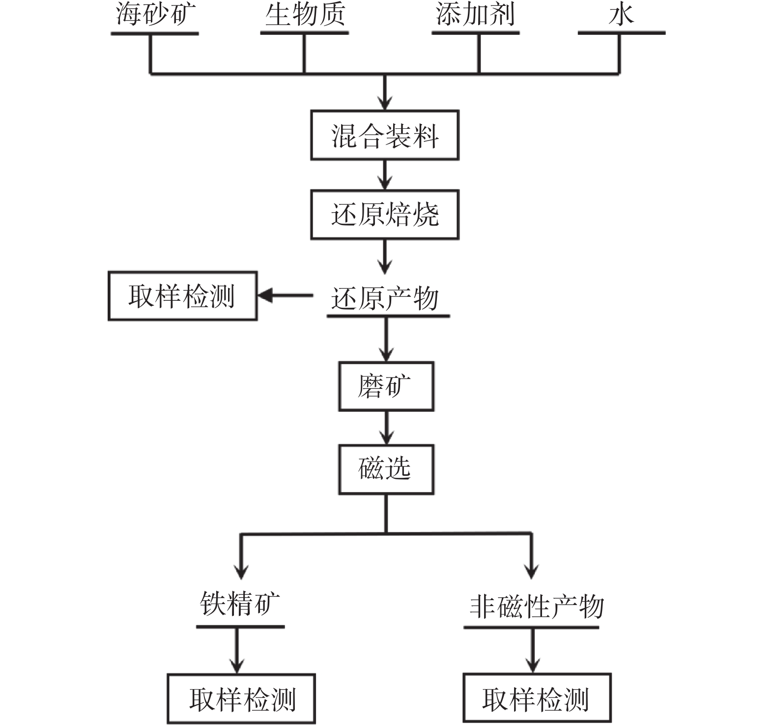 Biomass pyrolysis product-enhanced selective reduction-magnetic separation of iron sand