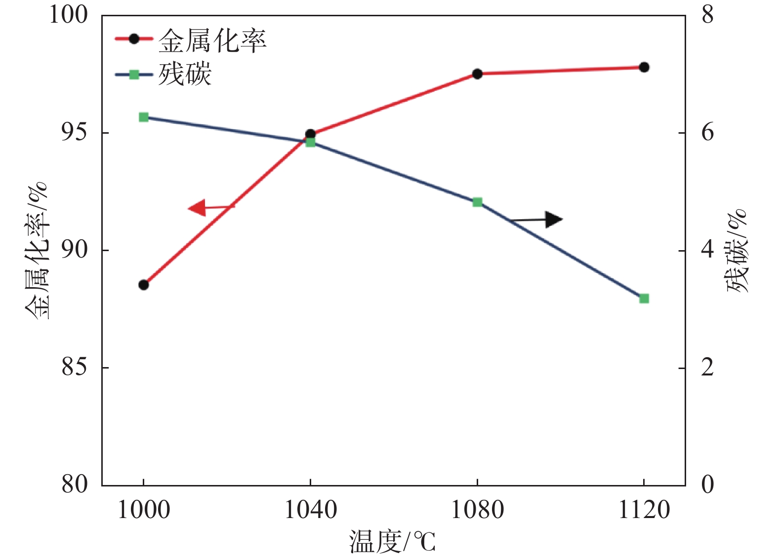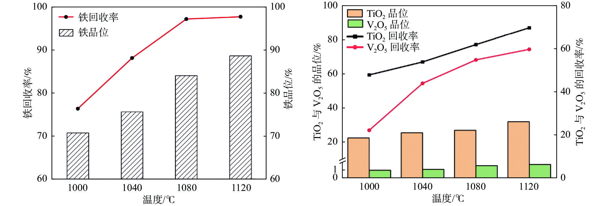 Using clean, carbon neutral, highly reactive and renewable biomass as a reducing agent, limiting the escape of pyrolysis products by hermetic gas plugs, the direct reduction behavior of the biomass allotted within the iron sand was studied. The results show that a pressure of 60 kPa is rapidly developed in the reaction tank as a result of limiting the escape of pyrolysis products (CO、H2、CO2、H2O 、CxHyOz) from biomass pyrolysis, which facilitates the participation of H2, CO in the reduction. The tar has higher activity and guarantees the source of H2 in the later stage, which promotes the rapid reduction of iron sand at low temperature. Under the conditions of reduction temperature of 1120 °C and reduction for 80 min, the iron powder with 97.81% metallization and 97.81% Fe recovery can be obtained, as well as the titanium-rich slag with a TiO2 recovery of 69.98% and a V2O5 recovery of 59.93%.