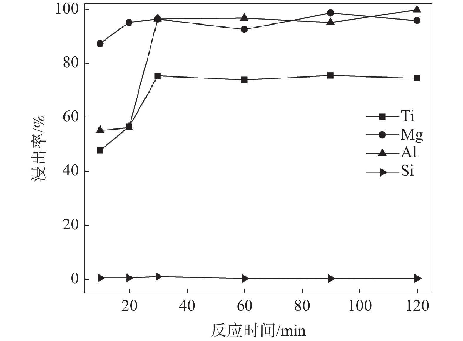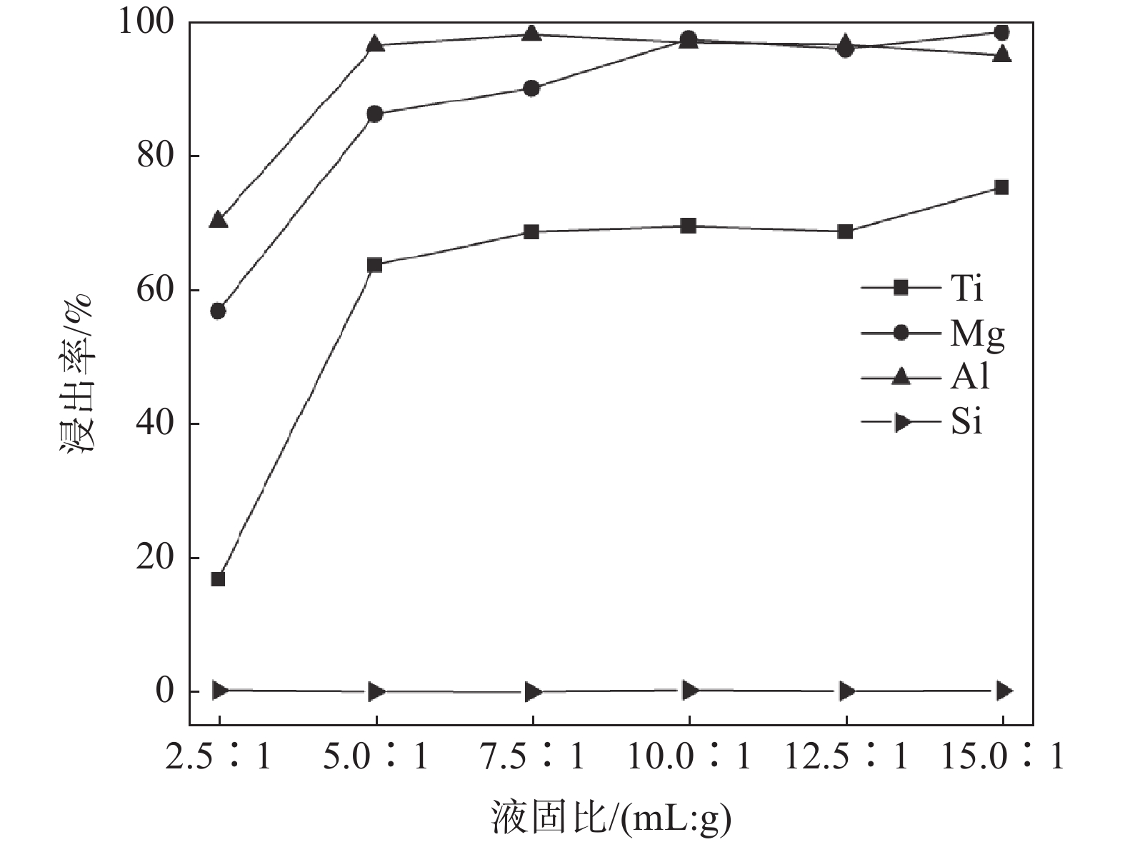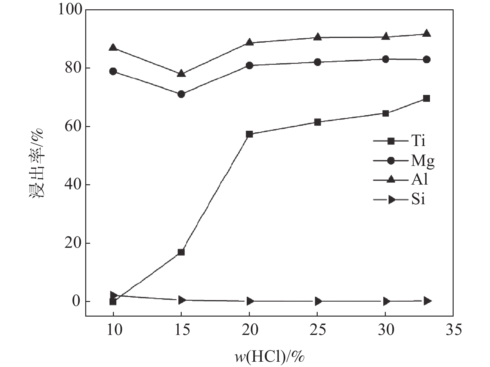Hydrochloric acid method was used for the leaching of water-quenched titanium-bearing blast furnace slag in this work. According to the leaching and solid-liquid separation process, valuable elements including titanium and aluminum were concentrated in the solution. With further hydrolysis and precipitation, high-purity rutile titanium dioxide and alumina oxide can be obtained. In order to obtain optimized leaching processing parameters, the effects of acid concentration, liquid-solid ratio, reaction temperature and reaction time on the leaching efficiency of different elements in titanium-bearing blast furnace slag were systematically investigated. When the leaching temperature is 90 °C, hydrochloric acid concentration is 33%, liquid-solid ratio is 15 : 1 (mL : g), and leaching time is 30 min, the leaching efficiency of titanium reaches 75.3%. By hydrolysis at 130 °C and following drying process, rutile titanium dioxide with a purity of 97.7% can be obtained. This method can be directly applied for the recovery of valuable titanium from the water-quenched titanium-bearing blast furnace slag and for the production of high purity titanium dioxide, with short process and low energy consumption, which can provide practical support for the resourceful utilization of titanium-bearing blast furnace slag.