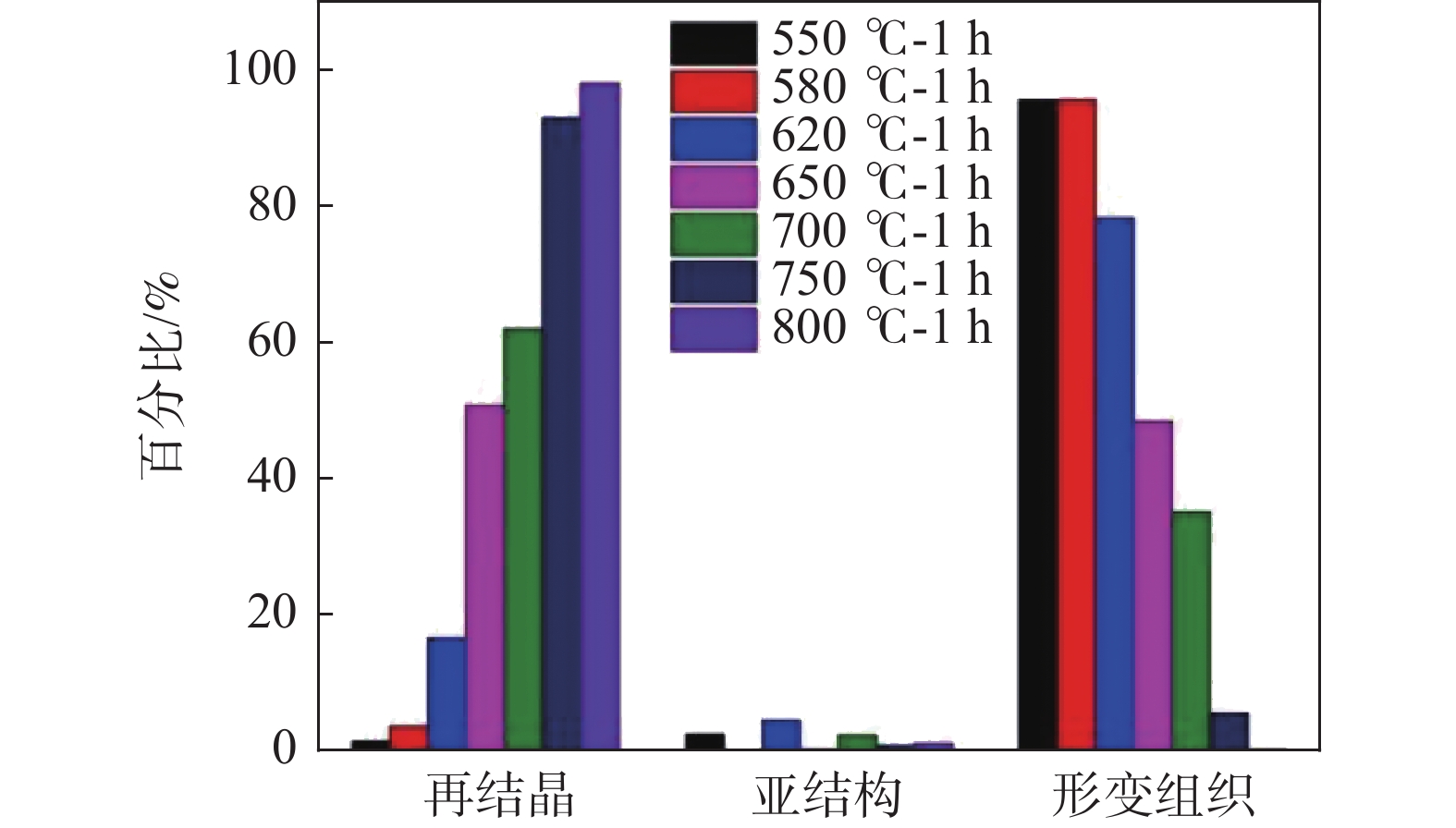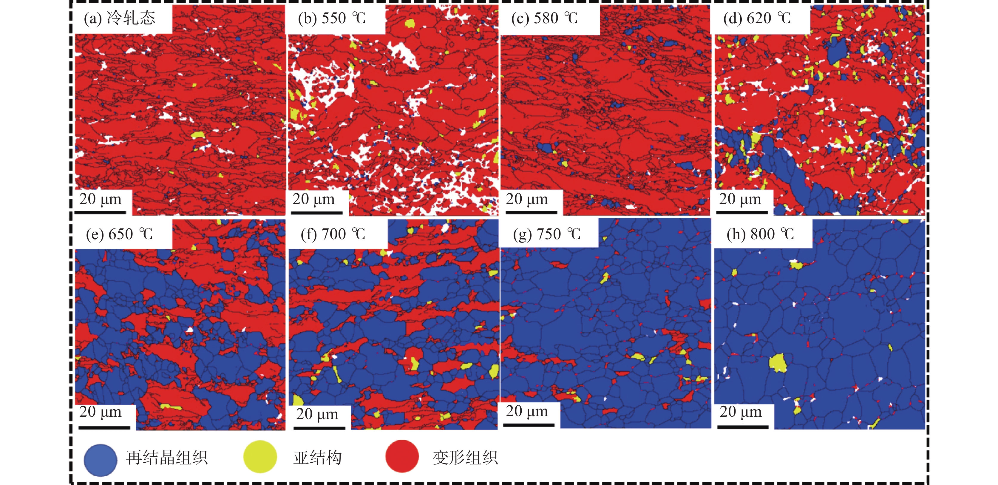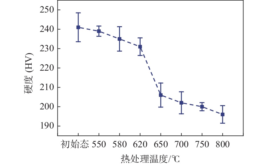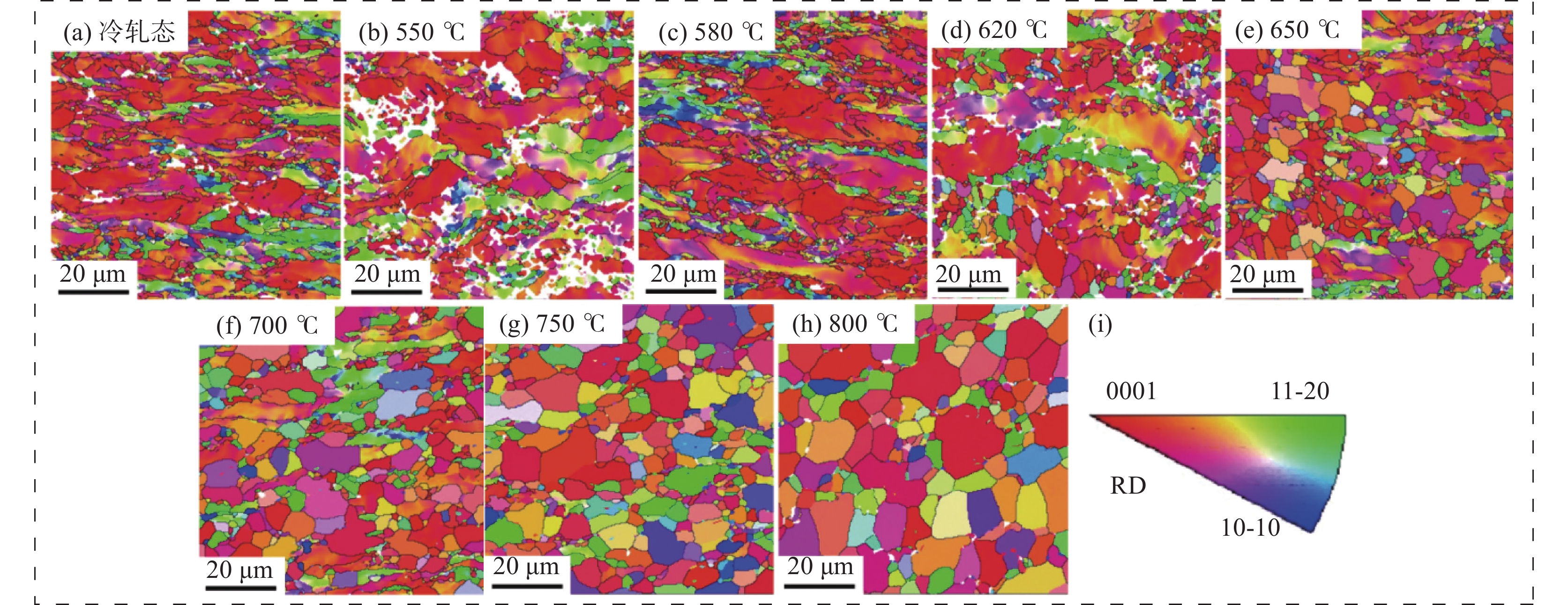 By using EBSD and TEM techniques, the microstructures of the deformation and annealed samples were characterized. After that, the recrystallization process of the tubes during the heat treatments was examined, and the changes in the texture during the various heat treatments were analyzed using polar and inverse polar figures. The experimental results show that when the heat treatment temperature is below 580 ℃, the tube mainly recovers and the microstructure is mainly consisted of the deformed grains. The complete recrystallization process of the tube will occur only when the heat treatment is conducted at 750 ℃. The research demonstrates that the cold-rolled tubes produce a basal bimodal texture with a circumferential (TD) tilt, and that the type of basal bimodal texture produced remains constant as the heat treatment temperature rises, while the recrystallization texture <${11{\bar 2}0 }$>//AD gradually replaced the deformation texture <${10{\bar 1}0}$>//AD. The mechanical properties of the alloy tubes after annealing at 620 ~ 650 ℃ change obviously, which is ascribed to the sharp increase in the recrystallization ratio with the rise in temperature.