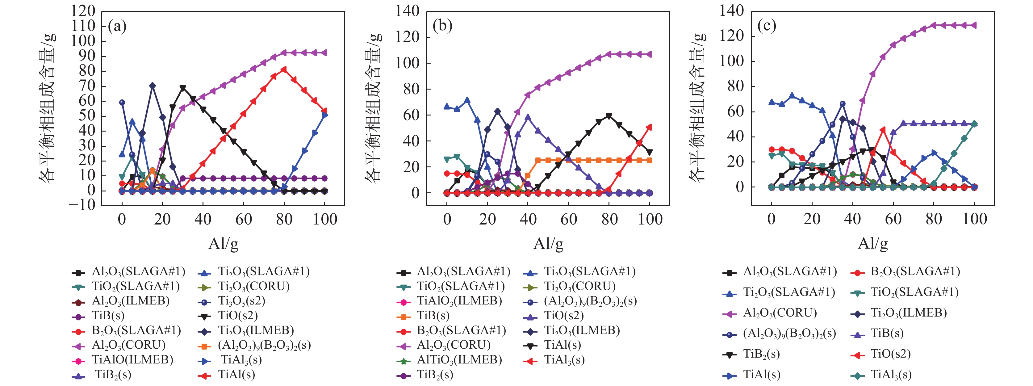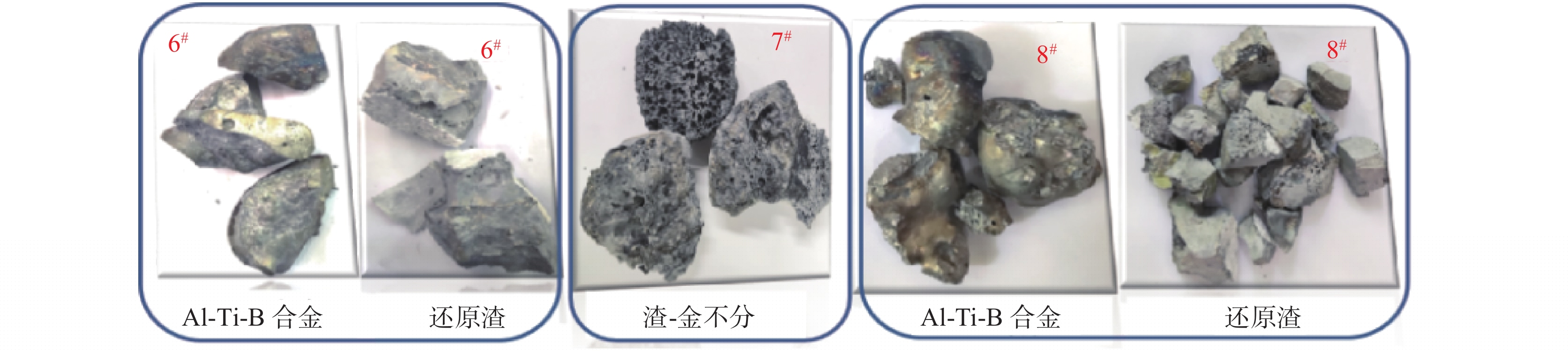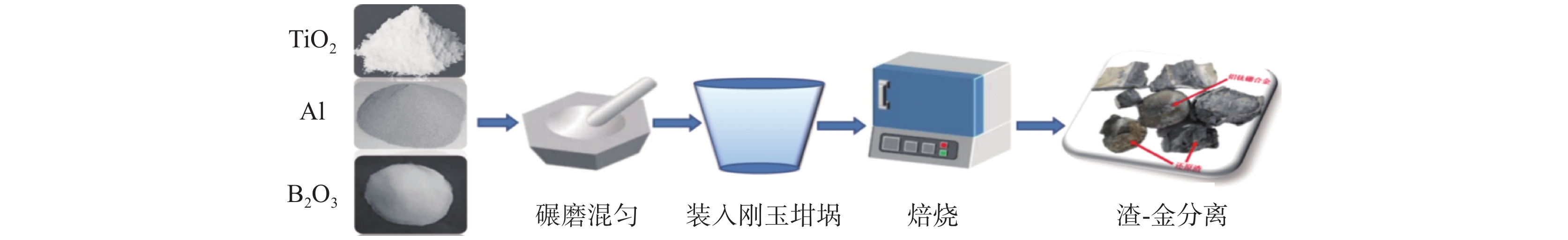 Al-Ti-B master alloy is commonly used as grain refining agent to endow aluminum with better organizational properties. In this paper, TiO2 and B2O3 are used as raw materials for the one-step synthesis of Al-Ti-B master alloy by aluminum thermal reduction. The results show that Al-Ti-B master alloy was successfully prepared under the conditions of Al2O3∶CaO∶CaF2=1∶1∶1, roasting temperature 1550 ℃, roasting time 30 min and Al/TiO2>0.9. The yield of Ti and B is higher than 80%. The Al and B contents of the alloy can be adjusted according to the amount of Al and B2O3 in the raw material. The phase of the alloy changes to TiAl and TiB2 with the increase of the amount of Al and B2O3.