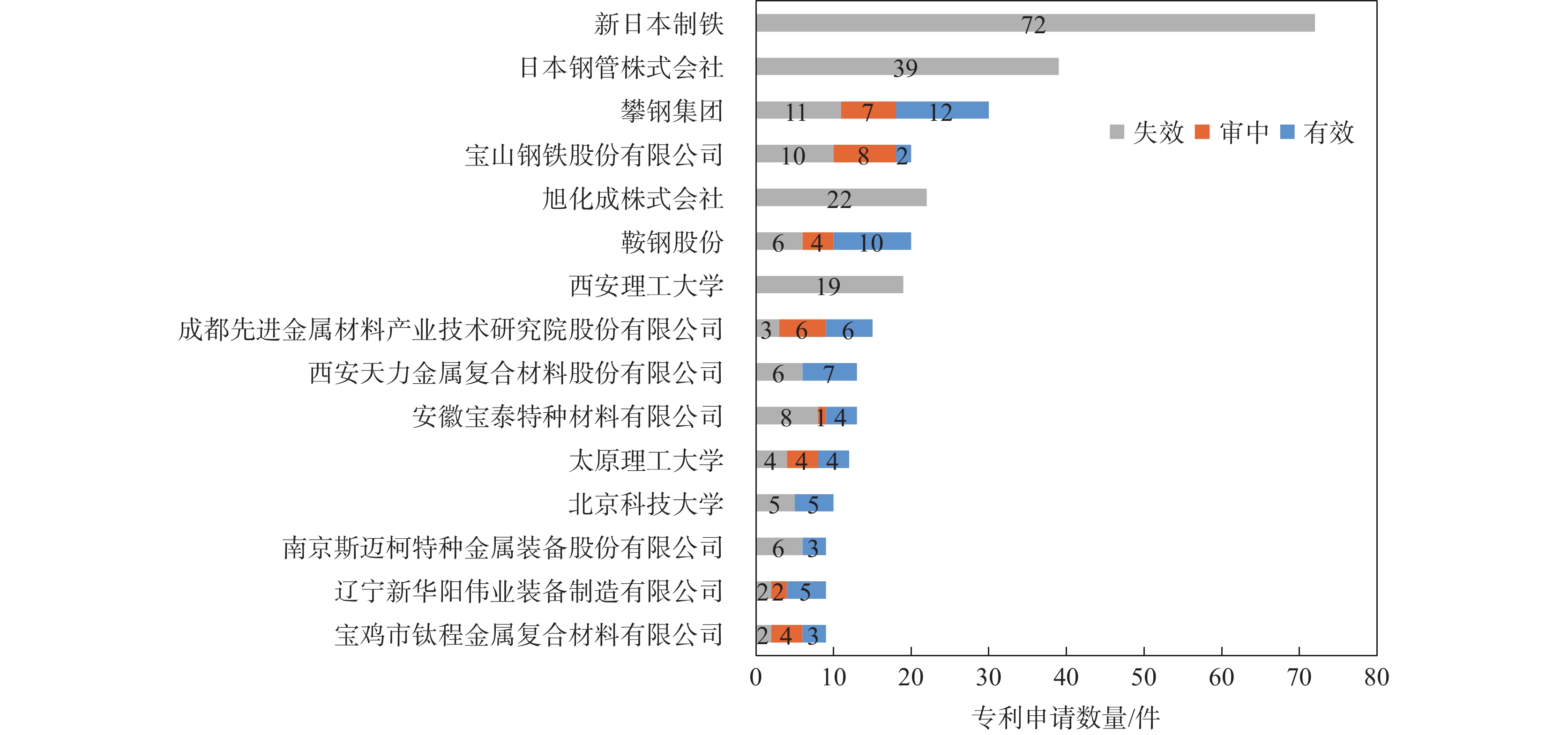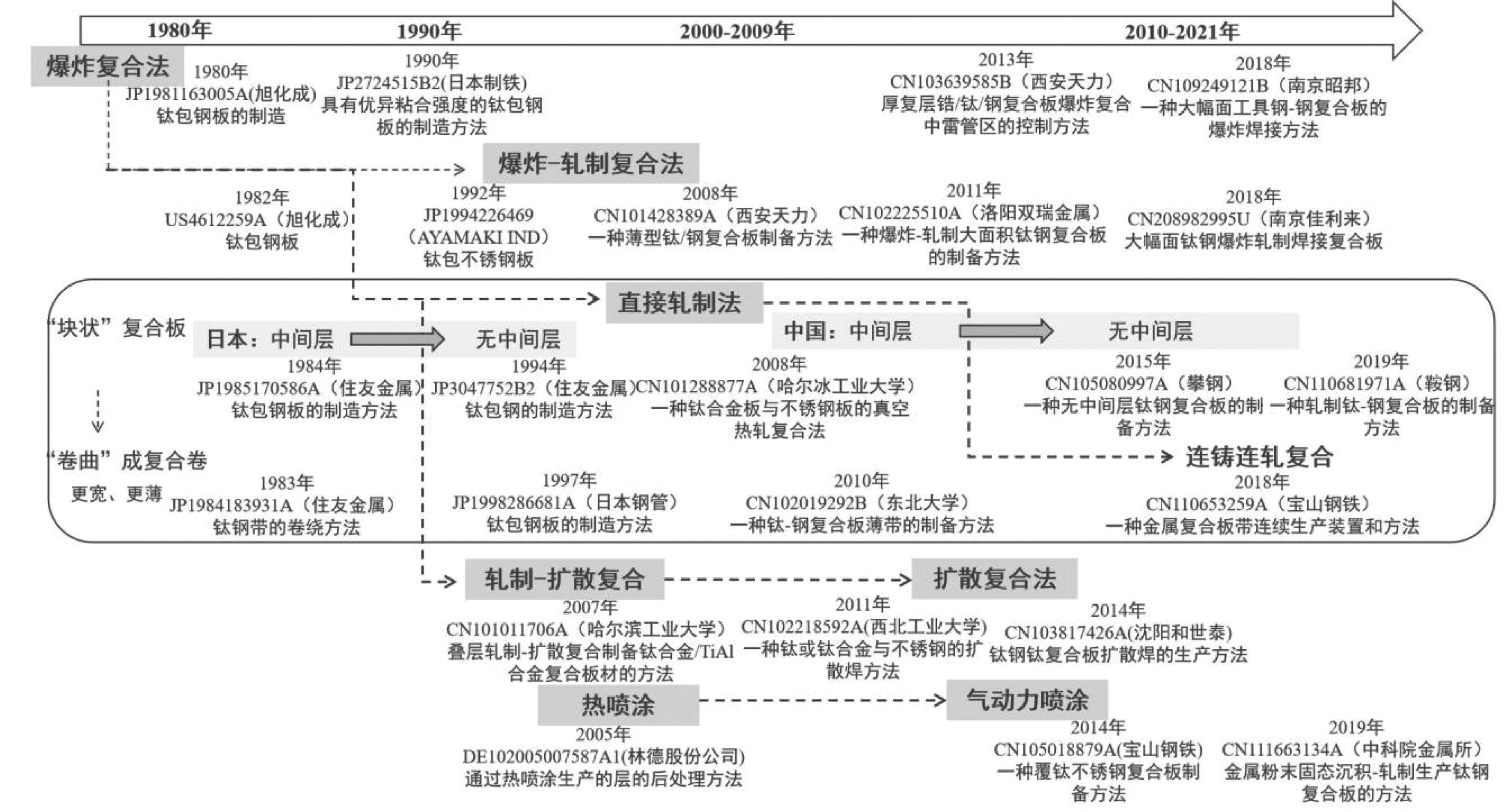 The development of key technologies of titanium-steel clad plates is reviewed based on a comprehensive mining of global patent applications. The results show that China and Japan are the major technology sources of titanium-steel clad plates. While Japan started earlier, China later rank first in patent applications in the world. Titanium-steel clad plate processing technologies are research hot spots, among which the direct rolling process route holds the largest share in a patent portfolio. The aims of the patented technologies is primarily to reduce the cost and improve the bonding strength. Based on the above findings, some suggestions about technological innovation and product development are proposed from a patent strategic perspective.