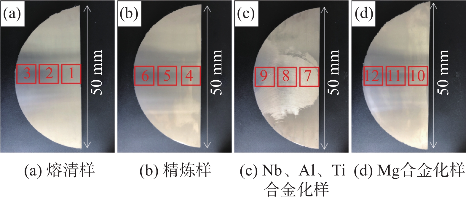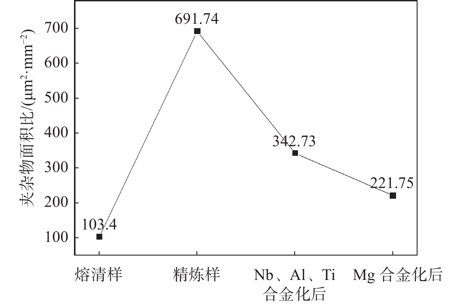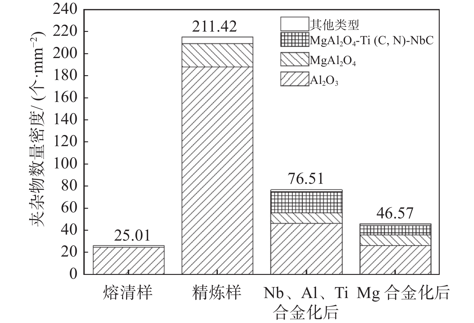 Inclusion had been considered as main factor affecting metallurgical quality and mechanical property of Ni-based superalloys. In this work the evolution mechanism of inclusions during the preparation of GH4169 Ni-based superalloy by vacuum induction melting (VIM) was studied. A method of ASPEX automatic scanning electron microscope was utilized to characterize the inclusions in GH4169 Ni-based superalloy prepared by vacuum induction melting (VIM). The phases, compositions, morphologies, formation mechanism and evolution mechanism of the inclusions were analyzed. The results indicate that the inclusions of single phase in GH4169 include mainly Al2O3、MgAl2O4 and MgO. The inclusions of composite phases include mainly MgAl2O4-Ti(C,N)-NbC and MgO-Ti(C,N)-NbC. Al2O3 forms during melting period, MgAl2O4 forms during refining period, and MgAl2O4-Ti(C,N)-NbC forms after alloying with Nb, Al and Ti, and MgO and MgO-Ti(C,N)-NbC form after alloying with Mg. As smelting process going, the number density of inclusions firstly increases and then decreases, and the number density of inclusions reaches a peak value of 211.42/mm2 during the refining period. After the refining period, the number of inclusions decreases, and the number density of inclusions before pouring is 46.57/mm2.