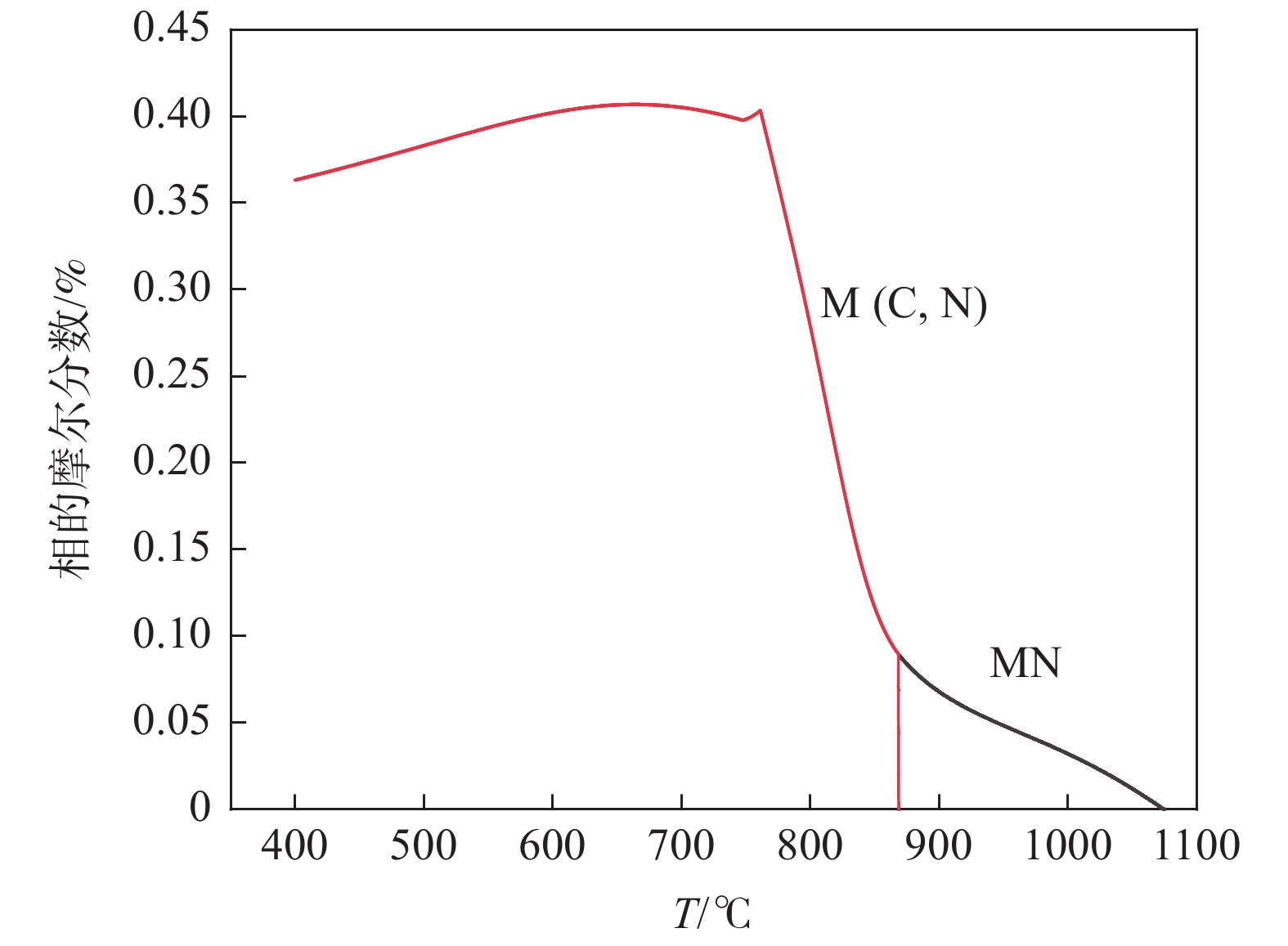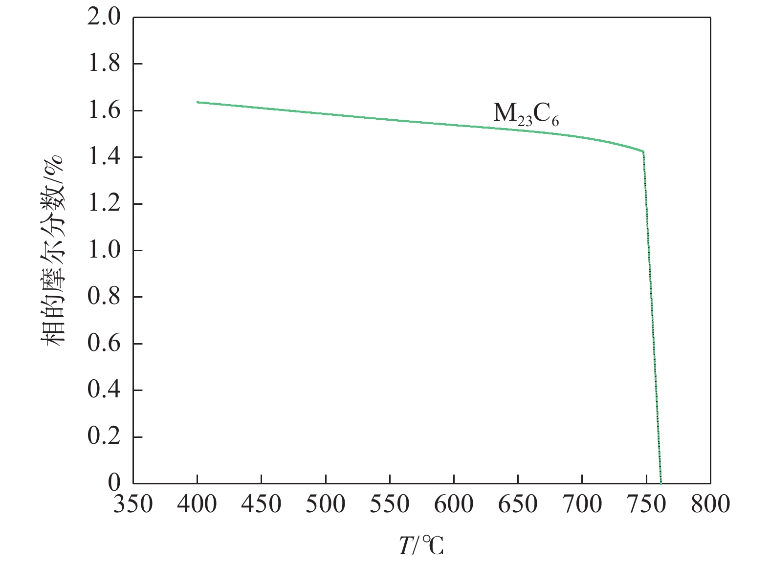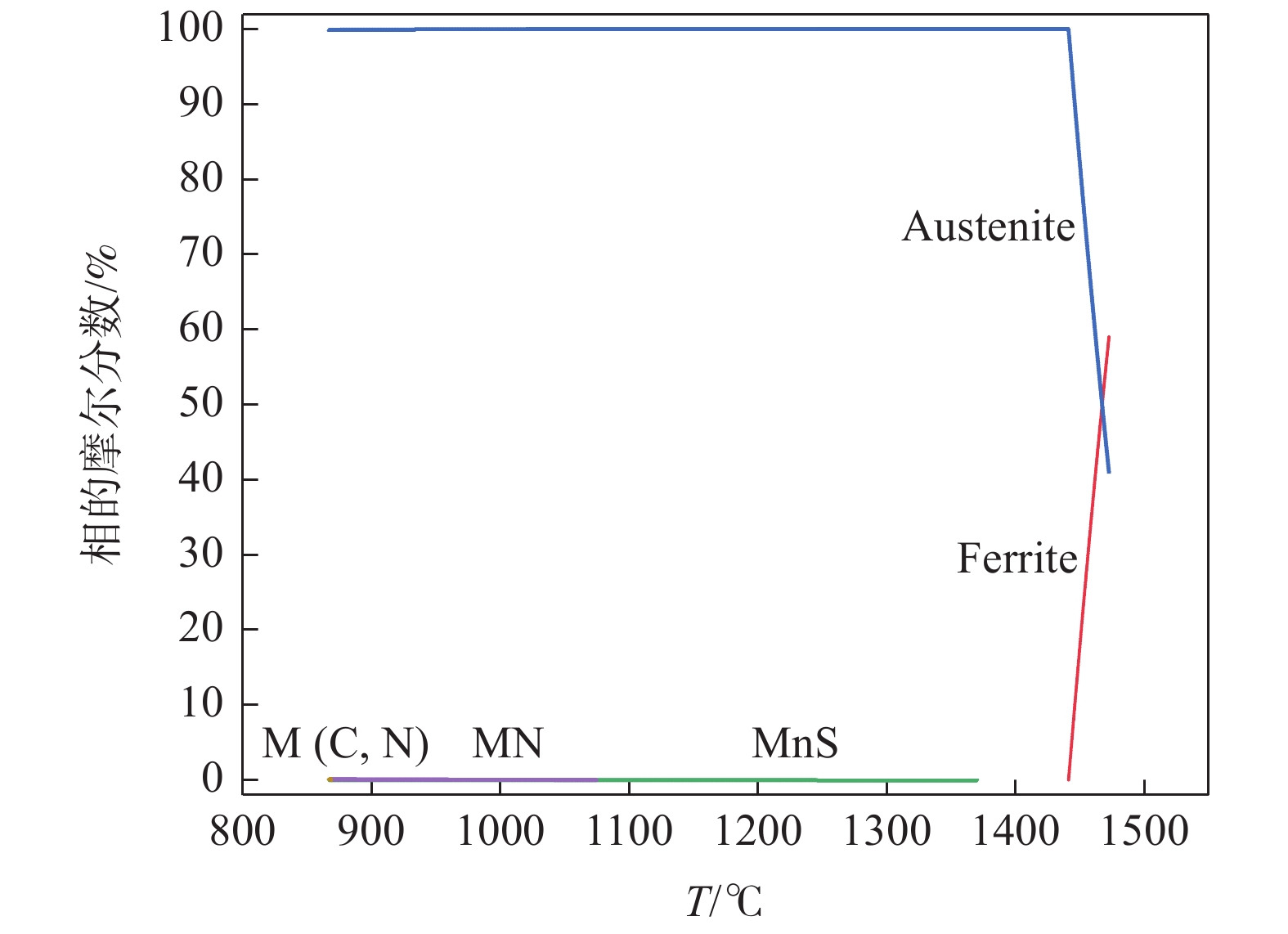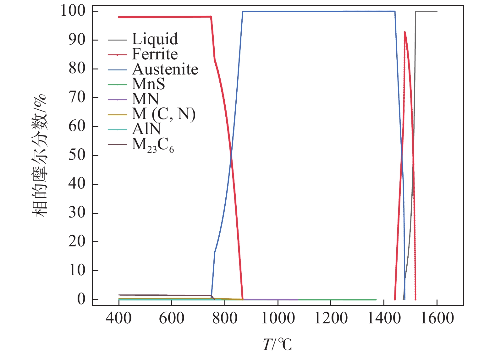 The phase transformation and precipitation behavior of 12Cr1MoVG steel during cooling were studied by thermodynamic software JMatPro, and the effect of alloying elements in the steel on longitudinal crack sensitivity was analyzed. The results show that the transformation path of 12Cr1MoVG steel from 1600 ℃ to 400 ℃ is L→ L+δ→ L+δ+γ→ δ+γ→ γ→ γ+MnS→ γ+MnS+MN→ γ+MnS+M(C,N)→ γ+α+MnS+M(C,N)→ γ+α+MnS+M(C,N)+AlN→ γ+α+MnS+M(C,N)+M(C,N)+AlN+M23C6→ α+MnS+M(C,N)+M(C,N)+AlN+M23C6. With the increase of P, S, Mo, V and Cr contents in the steel, the longitudinal crack sensitivity increases. While, the longitudinal crack sensitivity decreases with the increase of Mn and Si contents. Based on the temperature range of the (α+γ) two-phase region and the precipitation behavior of M (C, N), the low-temperature brittleness temperature range is calculated to be in the range of 747.6~869 ℃, which is basically consistent with the tensile testing results.