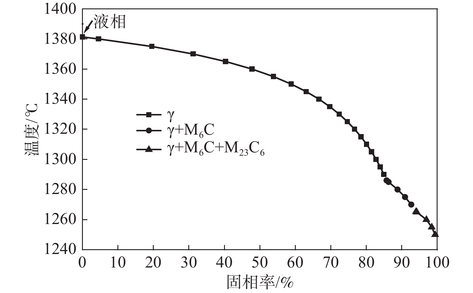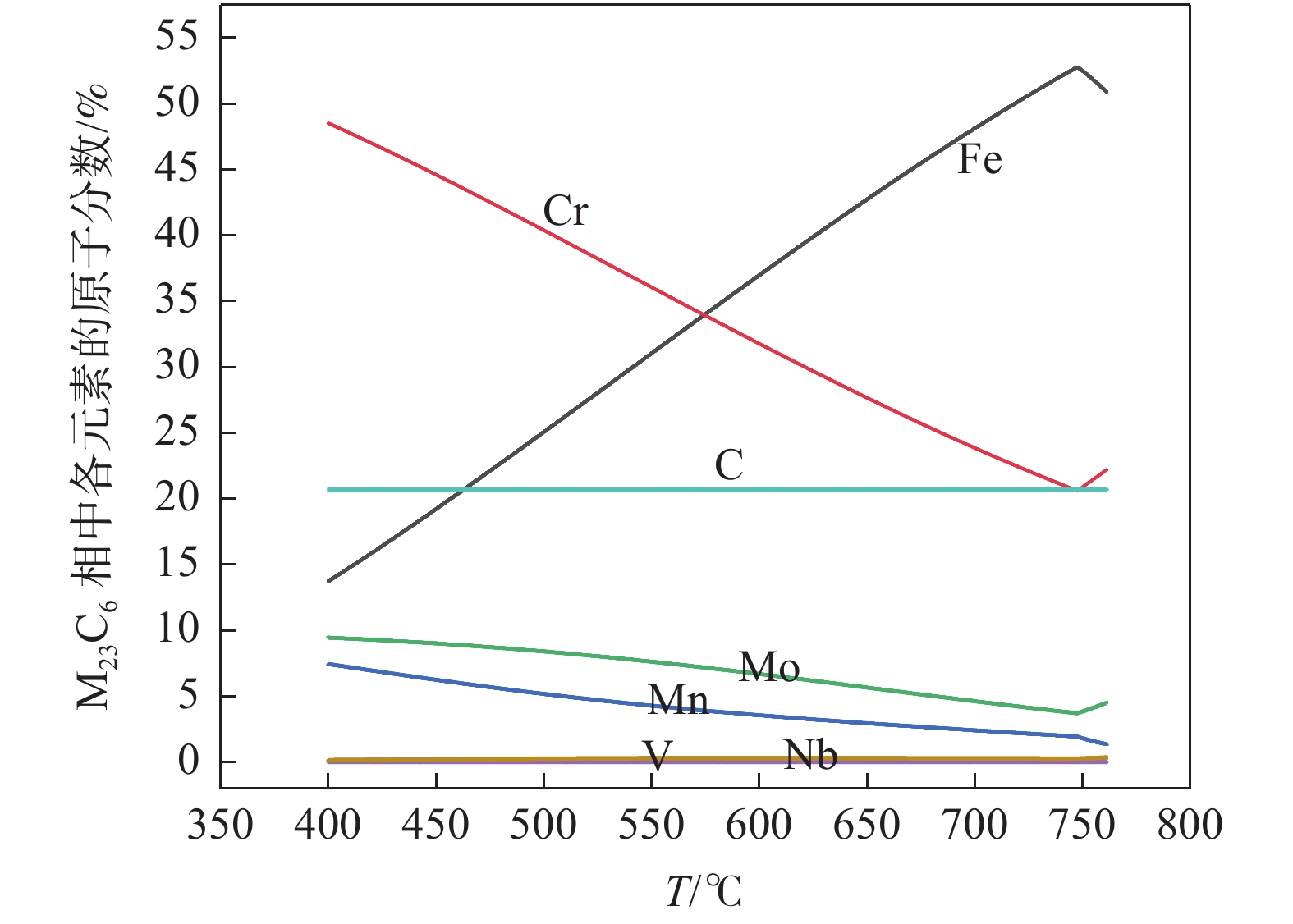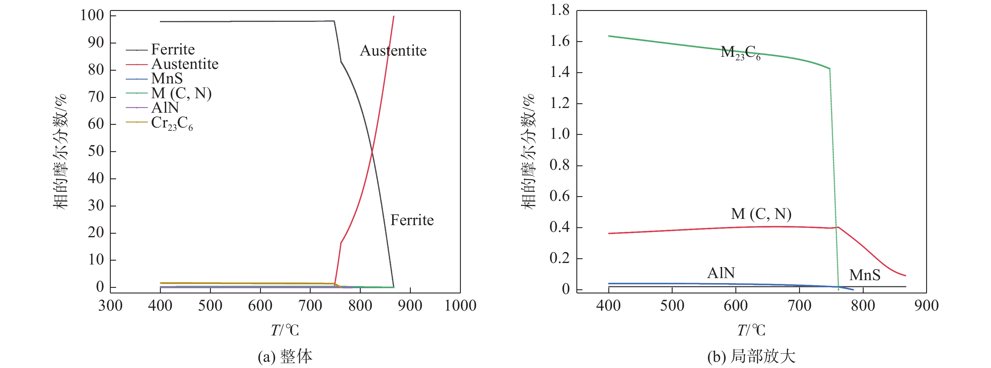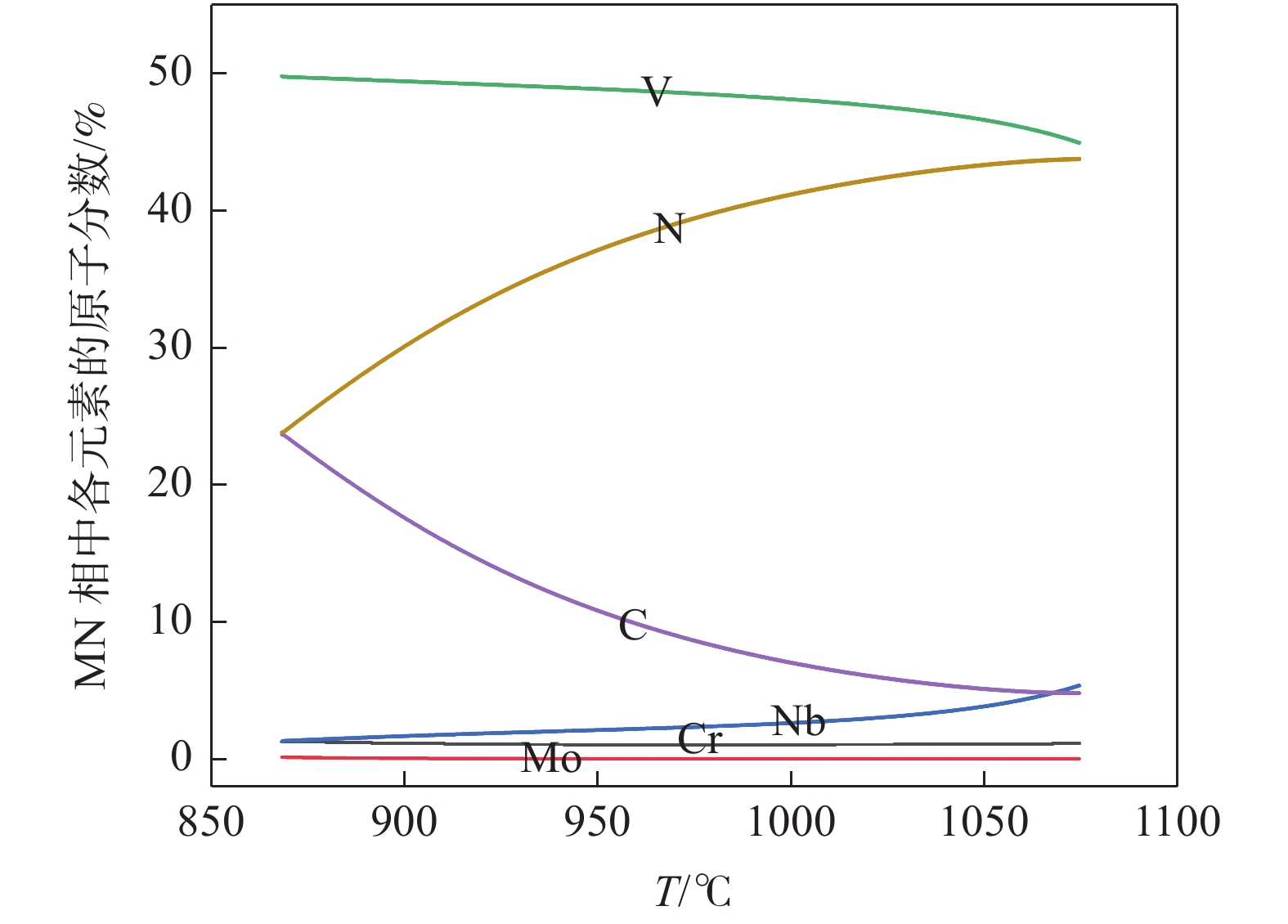 The phase transformation and precipitation behavior of 12Cr1MoVG steel during cooling were studied by thermodynamic software JMatPro, and the effect of alloying elements in the steel on longitudinal crack sensitivity was analyzed. The results show that the transformation path of 12Cr1MoVG steel from 1600 ℃ to 400 ℃ is L→ L+δ→ L+δ+γ→ δ+γ→ γ→ γ+MnS→ γ+MnS+MN→ γ+MnS+M(C,N)→ γ+α+MnS+M(C,N)→ γ+α+MnS+M(C,N)+AlN→ γ+α+MnS+M(C,N)+M(C,N)+AlN+M23C6→ α+MnS+M(C,N)+M(C,N)+AlN+M23C6. With the increase of P, S, Mo, V and Cr contents in the steel, the longitudinal crack sensitivity increases. While, the longitudinal crack sensitivity decreases with the increase of Mn and Si contents. Based on the temperature range of the (α+γ) two-phase region and the precipitation behavior of M (C, N), the low-temperature brittleness temperature range is calculated to be in the range of 747.6~869 ℃, which is basically consistent with the tensile testing results.
