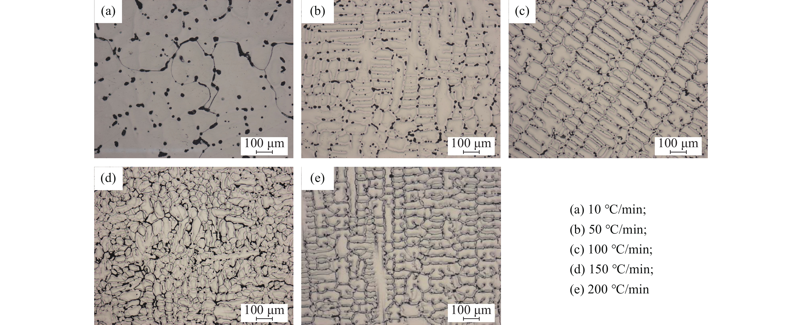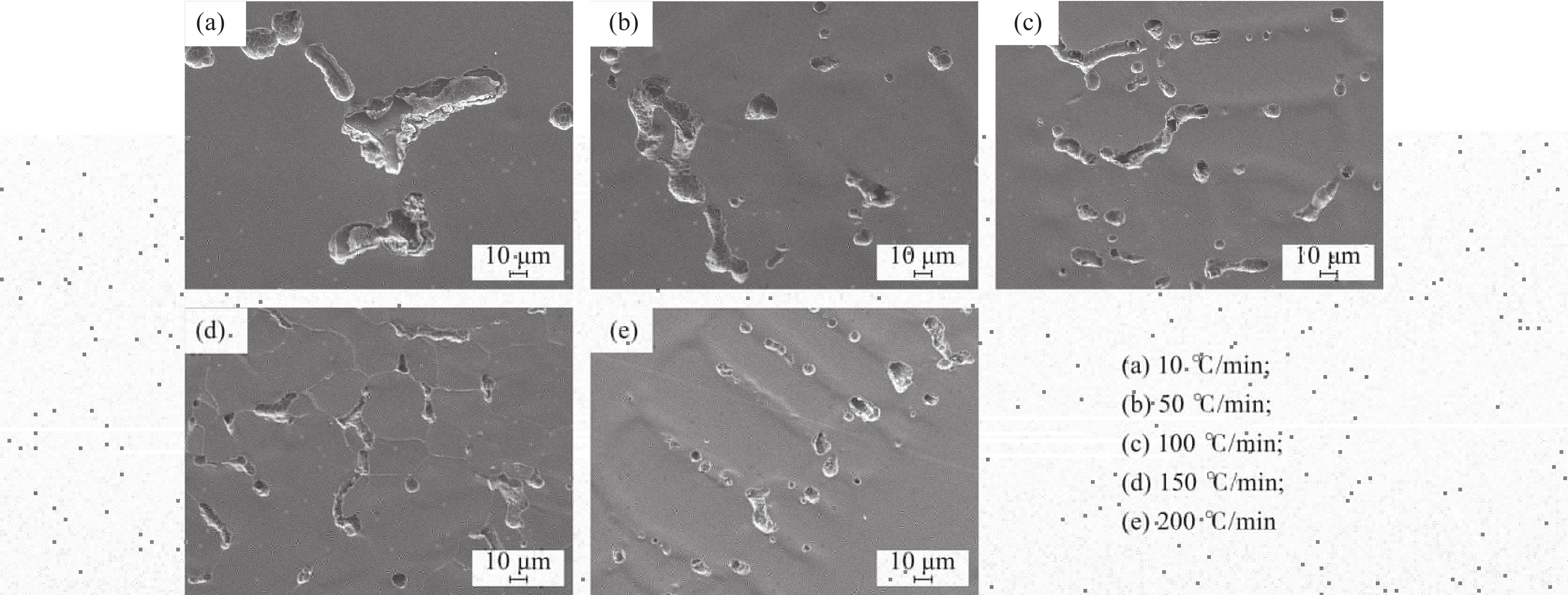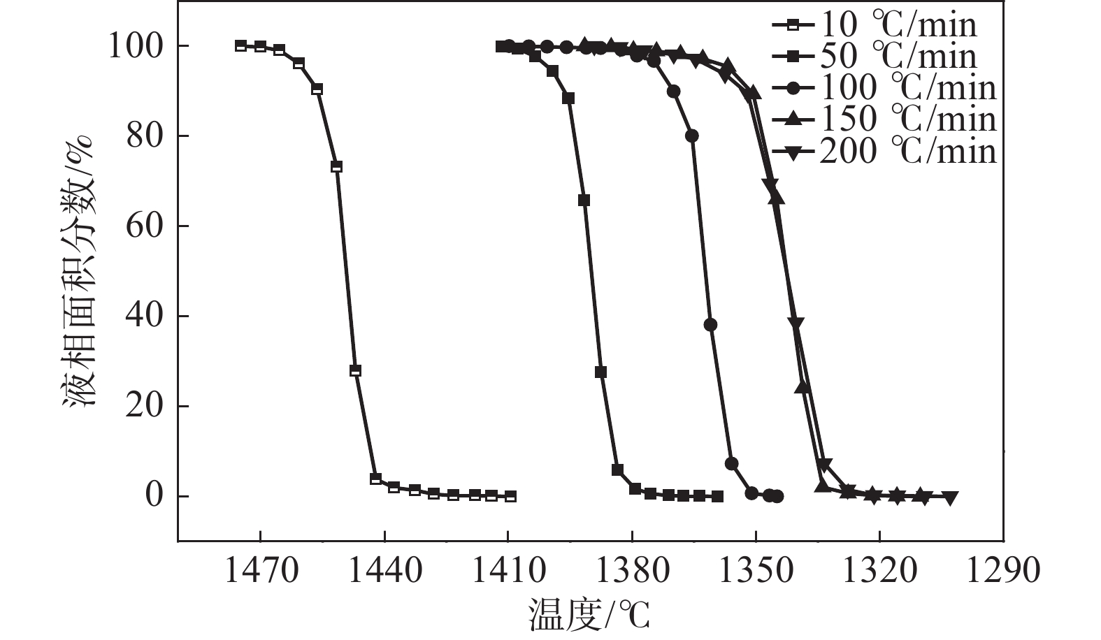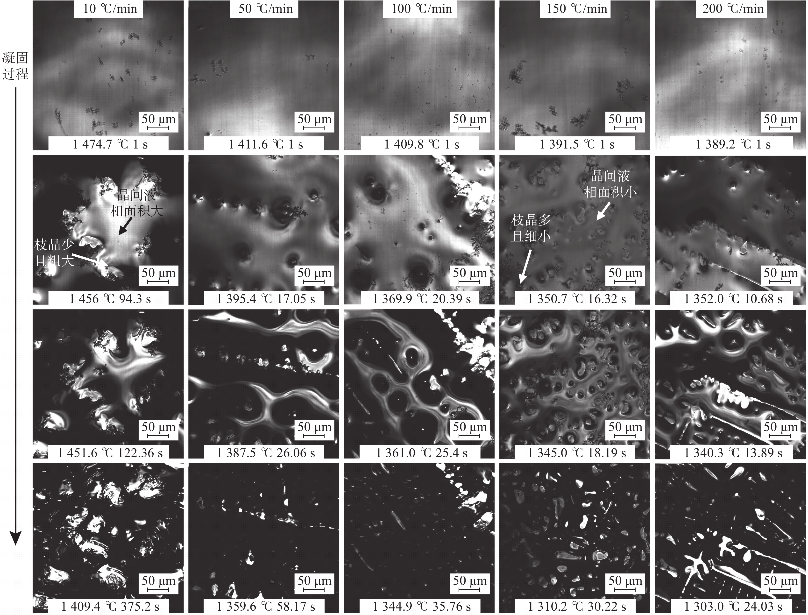 The solidification process of the GH5188 alloy at cooling rates of 10-200 ℃/ min was dynamically in-situ observed by high-temperature confocal laser scanning microscopy (CLSM). The effects of cooling rates on the solidification process, structure and precipitates of the GH5188 alloy were studied. The results show that the solidification process for the GH5188 alloy is slow-rapid-slow solidification. The higher the cooling rate, the greater the peak solidification rate is obtained. The cooling rate affects the solidification temperature of the alloy, and the solidification temperature decreases with the increase in the cooling rate. With the increase in cooling rate, the secondary dendrite arm spacing of the alloy after solidification decreases. The size of precipitates is more uniform and refined, which is conducive to reducing the crack sensitivity of the alloy during solidification. The secondary dendrite arm spacing prediction formula is obtained under different cooling rates.