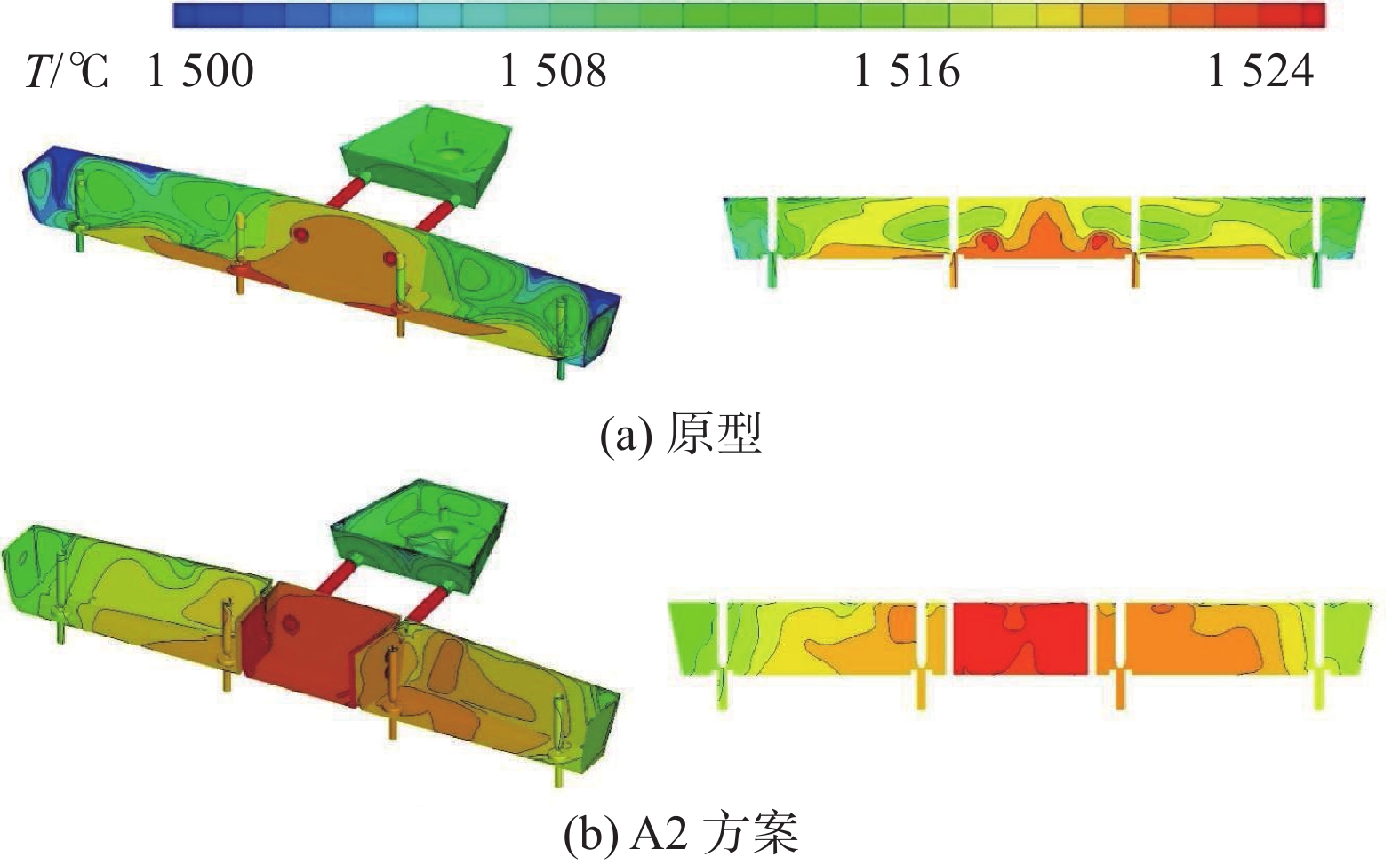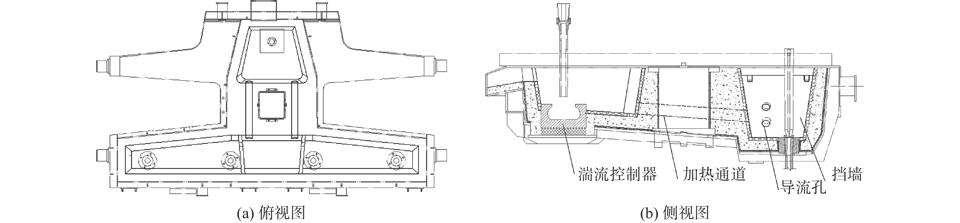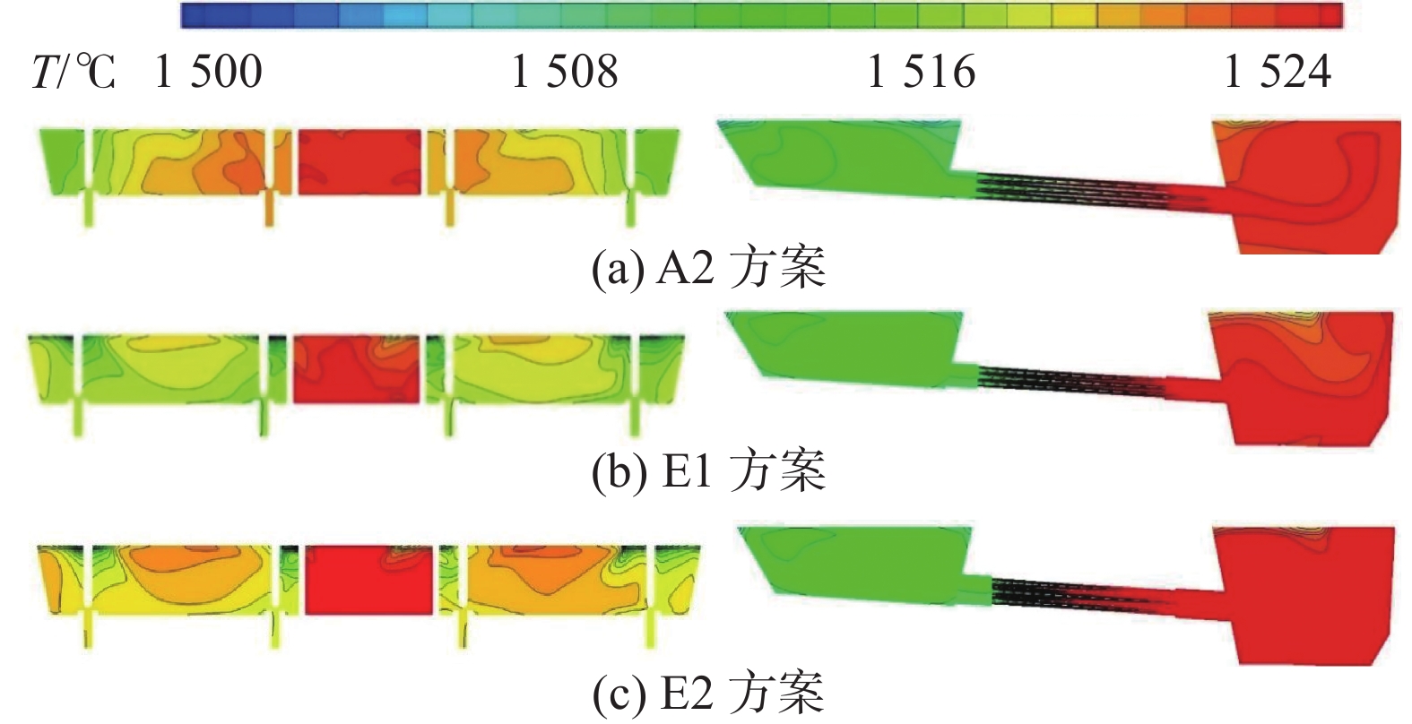 In order to solve the problems of low volume utilization, short average residence time and poor consistency of each flow of the twin channel induction heating tundish without flow control devices, weirs with different diversion holes and heating twin channels were designed. The flow field and temperature field of tundish are simulated by numerical simulation and water simulation. Simulation results show that the flow of molten steel can be improved by setting a wall in the tundish. For Scheme A2 (two diversion holes are opened on the splayed wall, with diameter of 130 mm and a horizontal inclination of 5° to the retaining wall, an elevation of 25° for the lower hole and 15° for the upper hole), the average residence time is extended by 207.2 s, the dead zone volume is reduced by 23.89%, and the maximum temperature difference between the edge nozzle and the middle nozzle is 3 ℃. Scheme E2 (Runway type heating twin channel) can achieve better heating effect on tundish. The production practice has proved that the maximum temperature difference between the edge water outlet and the middle water outlet is about 3~4 ℃.The optimized flow control device improves the fluidity inside the tundish.