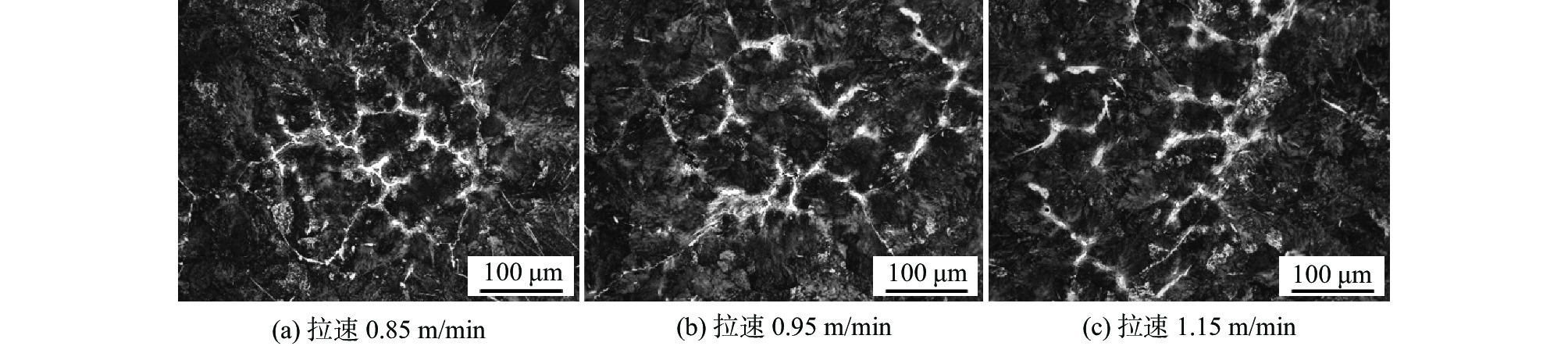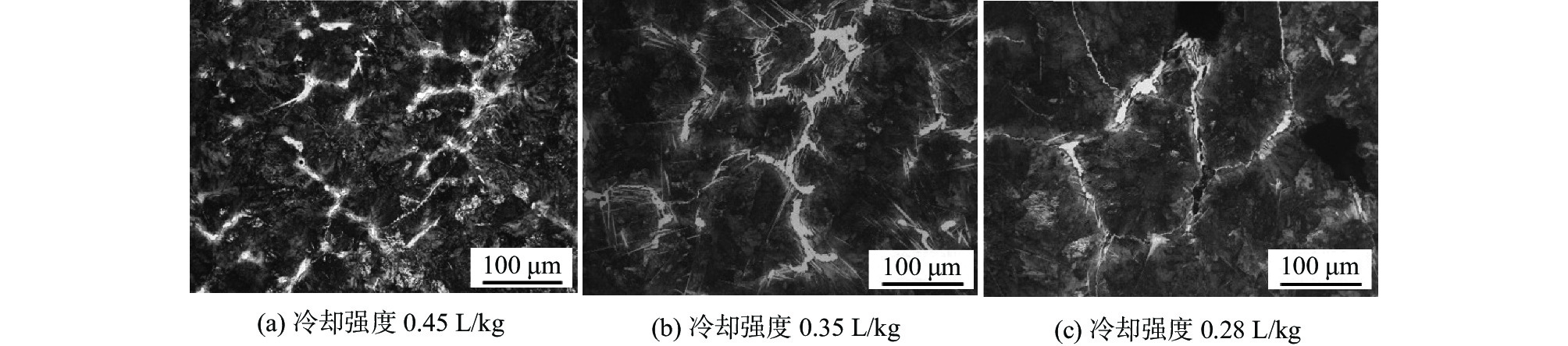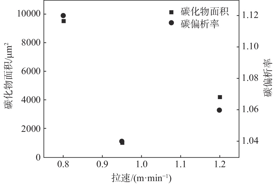 The morphology, distribution and relationship between the original bulk carbides and carbon segregation index of GCr15 bearing steel continuous casting billets under different continuous casting factors (superheat, drawing speed, secondary cooling strength, electromagnetic stirring conditions) were investigated by Image-Pro Plus software and metallographic method. The results show that the heritability of the original bulk carbide of different types of billets, intermittently distributed or individually distributed billet bulk carbide after the existing rolling heating process, the liquid precipitation carbide level is 0-0.5, which guides the best matching process parameters for continuous casting is the drawing speed 0.95 m/min, superheating degree 20-25 ℃, cooling intensity 0.35 L/kg, end electromagnetic stirring 350 A/7 Hz.