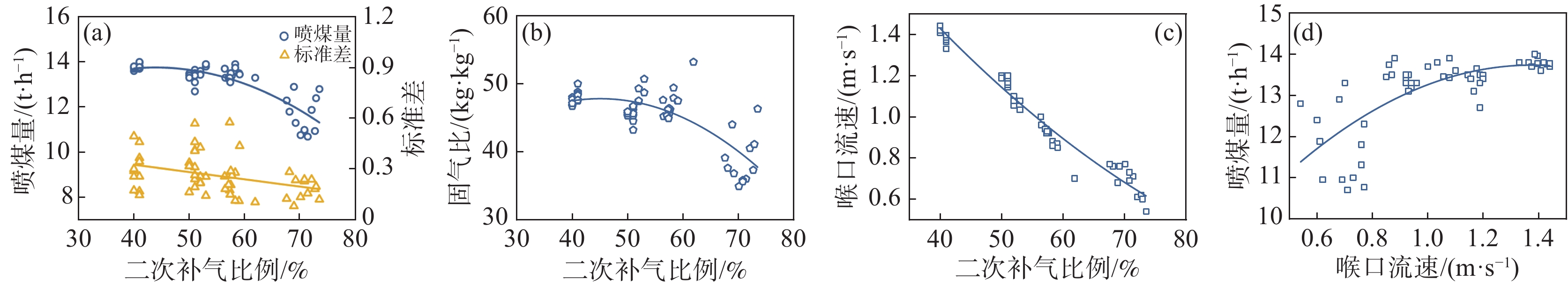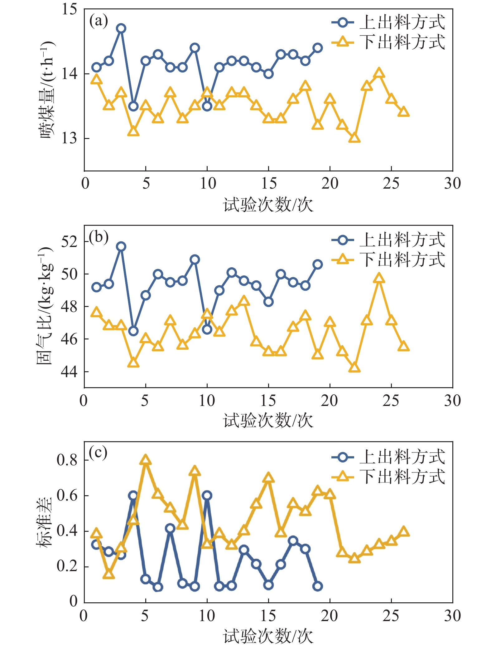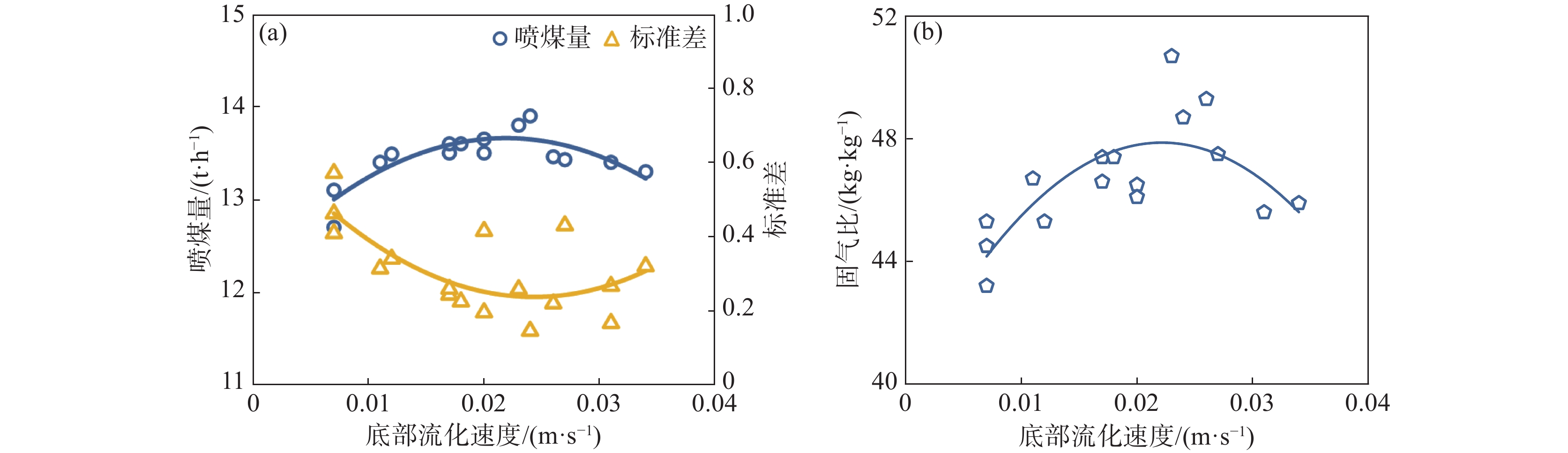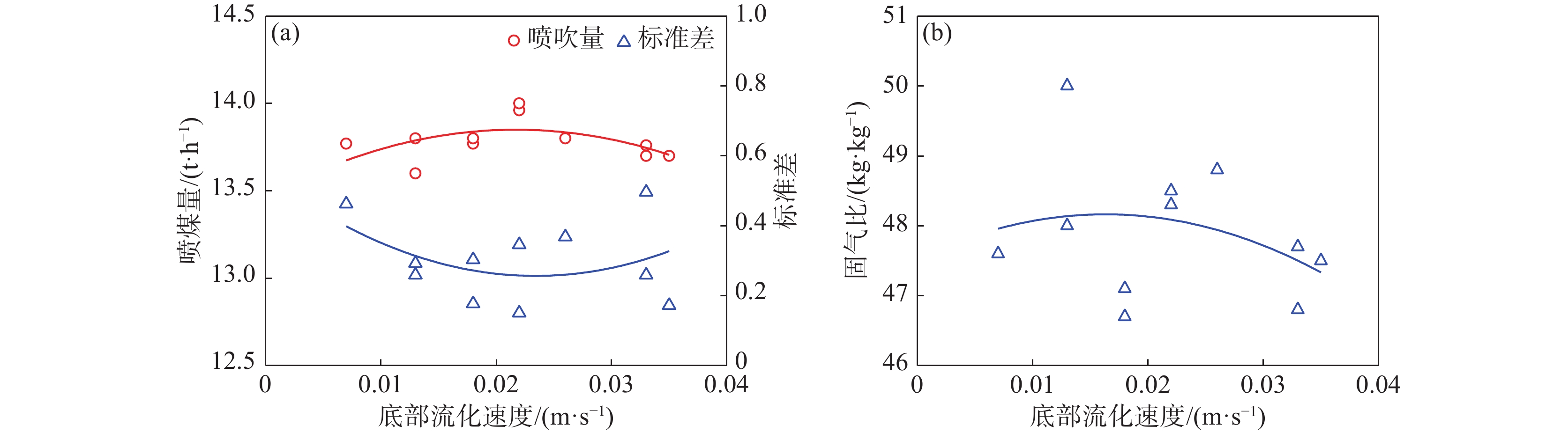 1000m3 blast furnace PCI system. Using this setup, the effects of various PCI processes and control parameters - including the secondary air injection ratio, the ratio of pressurized to replacement air, fluidization velocity, and discharge modes-on improving the injection rate, solid-gas ratio, and overall stability had been investigated. The experimental results revealed that, with a constant total gas flow in the injection pipeline, a decrease in the secondary air injection ratio led to a significant increase in both the injection rate and solid-gas ratio, as well as reduction in stability. When the secondary air injection ratio was maintained around 45%, the PCI rate and solid-gas ratio peaked, achieving the highest energy-saving potential. Furthermore, as the ratio of pressurized to replacement air increased, the PCI rate initially rose and then declined, reaching its maximum when the ratio was controlled between at 1.5~2. Similarly, the optimal bottom fluidization velocity was identified as 0.02~0.025 m/s, maximizing the injection rate, solid-gas ratio, and stability. Comparative analysis of two discharge modes (top discharge and bottom discharge) indicated that the top discharge mode offered superior stability due to the agreement of the gas flow direction with the discharge direction.