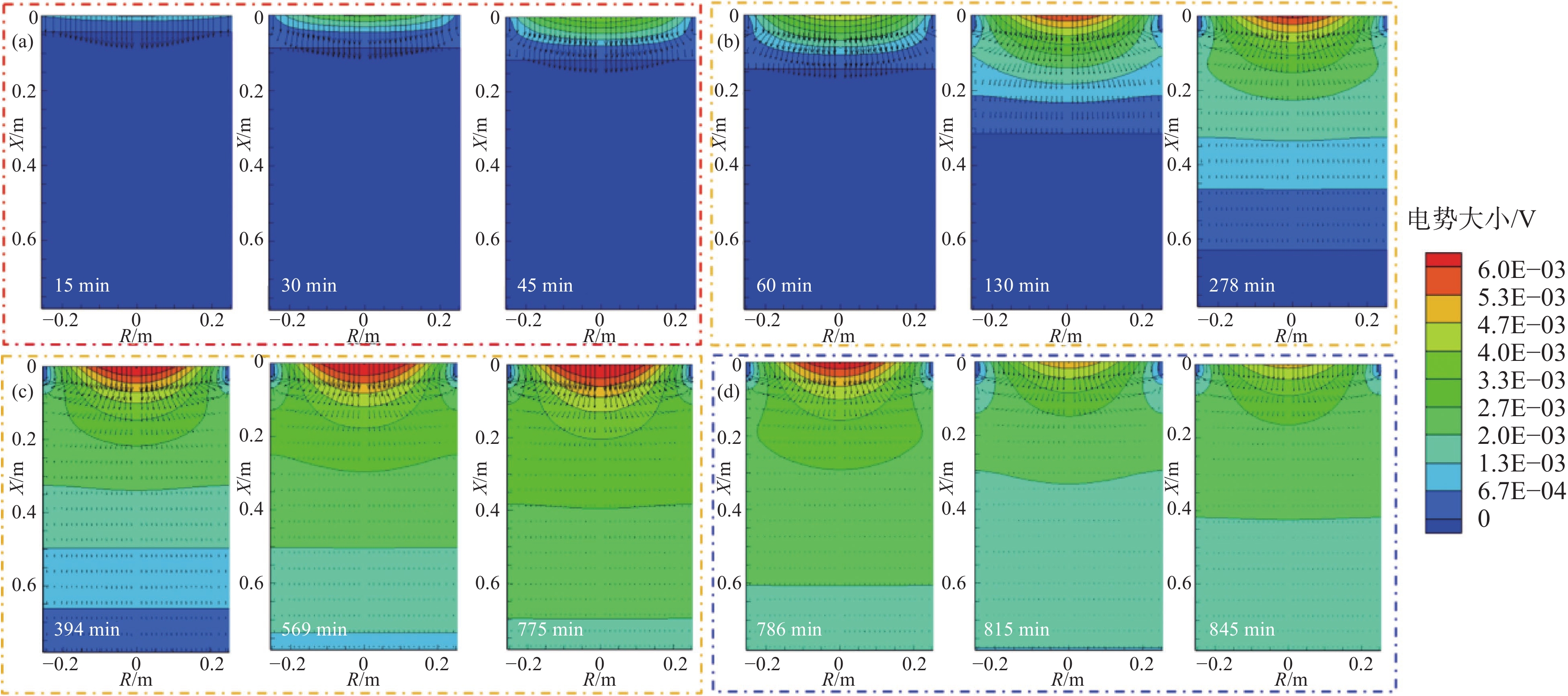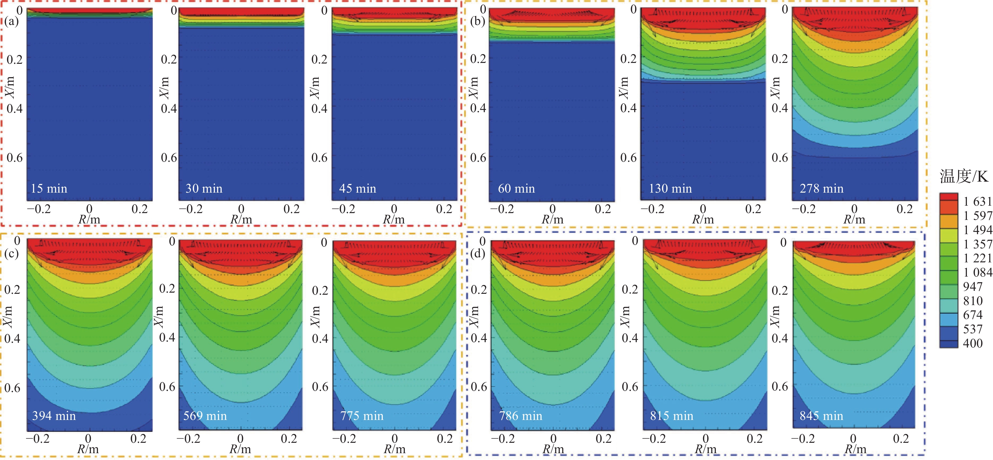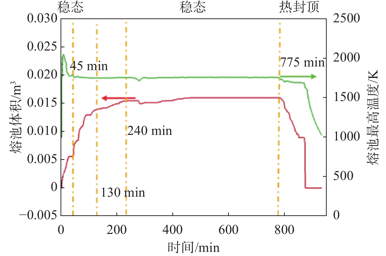 In this paper, the numerical simulation on vacuum arc remelting process of nickel base superalloy with respect to electromagnetic distribution, flow and heat transfer behavior of molten pool, as well as the morphology and size at different stages of the vacuum arc remelting process had been carried out by using a Meltflow-VAR software. Moreover, the formation tendency and reasons for the freckle defects throughout the smelting process had been investigated. At the same time, the influence of helium pressure on the flow and heat transfer behavior of molten pool, the morphology and size of molten pool, and the freckle formation was studied. The results show that the potential is mainly located in the center of the surface of the ingot, while the magnetic induction intensity is mainly located at the edge of the surface of the ingot, as well as the flow of the molten pool is mainly driven by thermal buoyancy. In addition, the electric field strength, current density, Lorentz force as well as the size and flow intensity of the molten pool that distributed on the surface and inside of the ingot, gradually increase at the ignition process of vacuum arc, and remain stable during the steady-state stage, then gradually decrease during the hot tap stage. During the entire smelting process, the freckle defect easily forms near the top of the hot seal on the upper part of the ingot because the cooling effect of the bottom plate of the crystallizer is weak, the helium pressure at the top of the hot seal decreases and the holding time at low melting rates is long as the ingot grows in the longitudinal direction. Increasing helium pressure can reduce the size of the molten pool and alleviate ingot segregation, but the effect of improving ingot segregation defects will gradually become less significant as continuously increasing helium pressure. Finally, the comparison of molten pool depth observed by experimental dissection and simulation is conducted, which verifies the rationality of the established mathematical model.